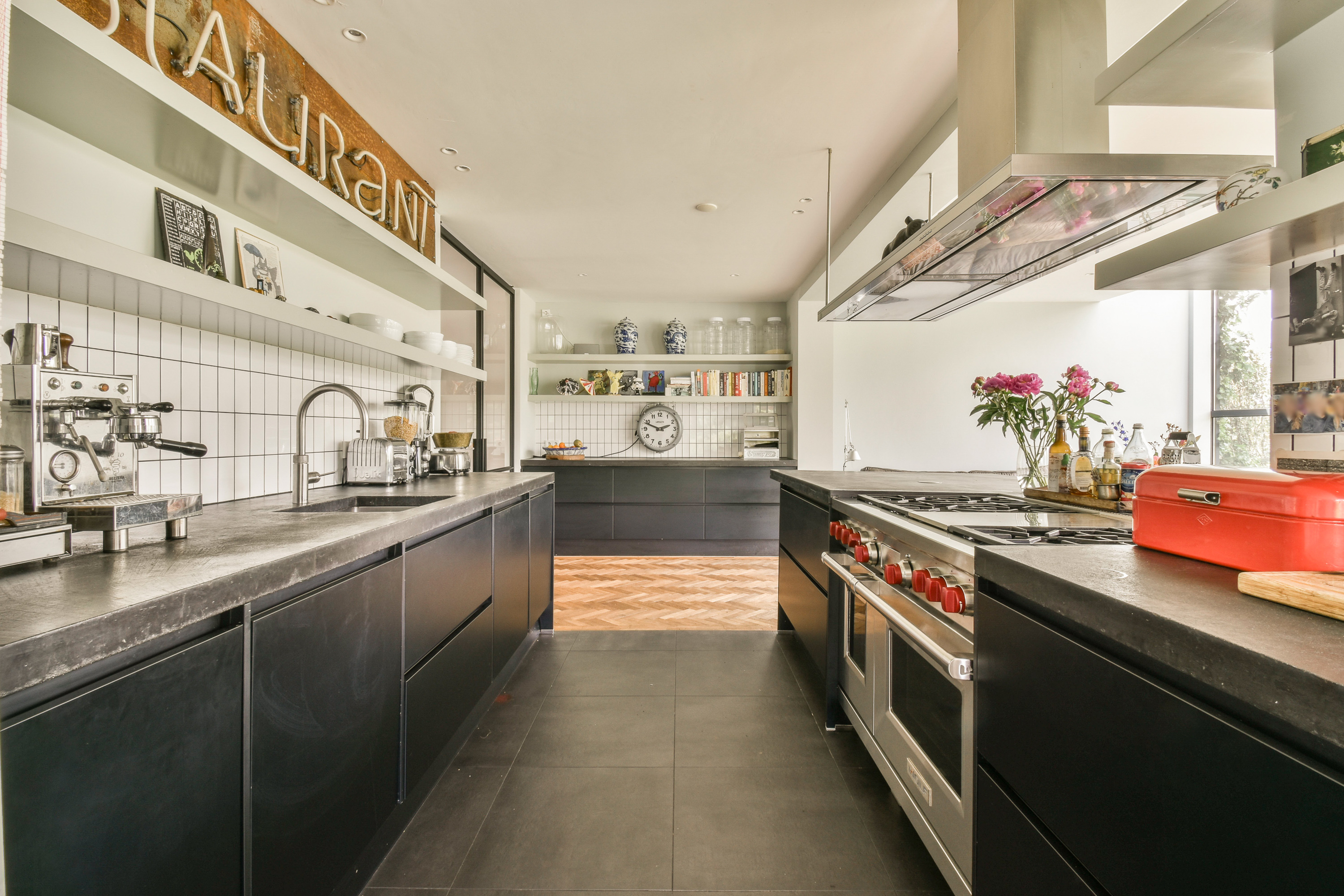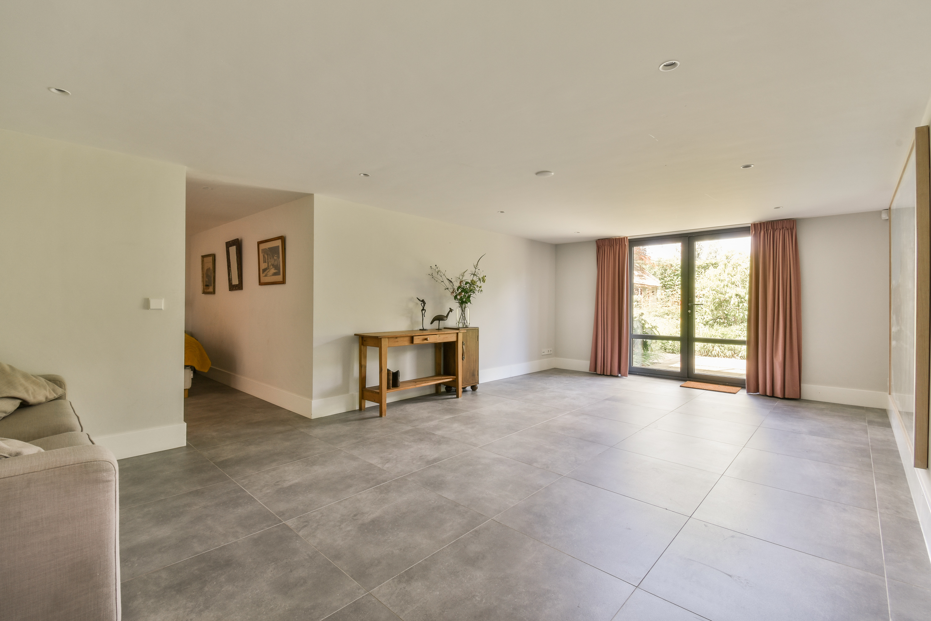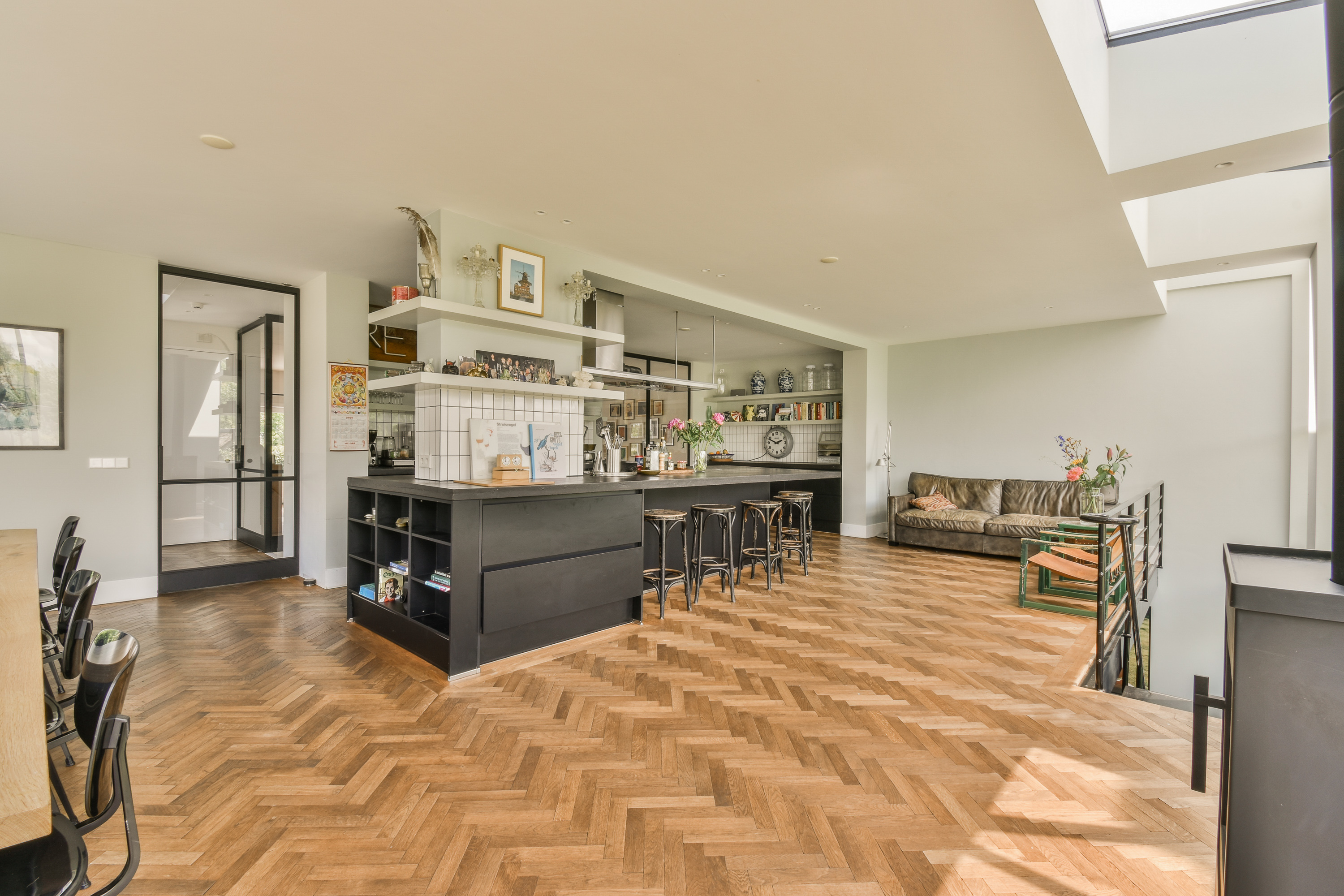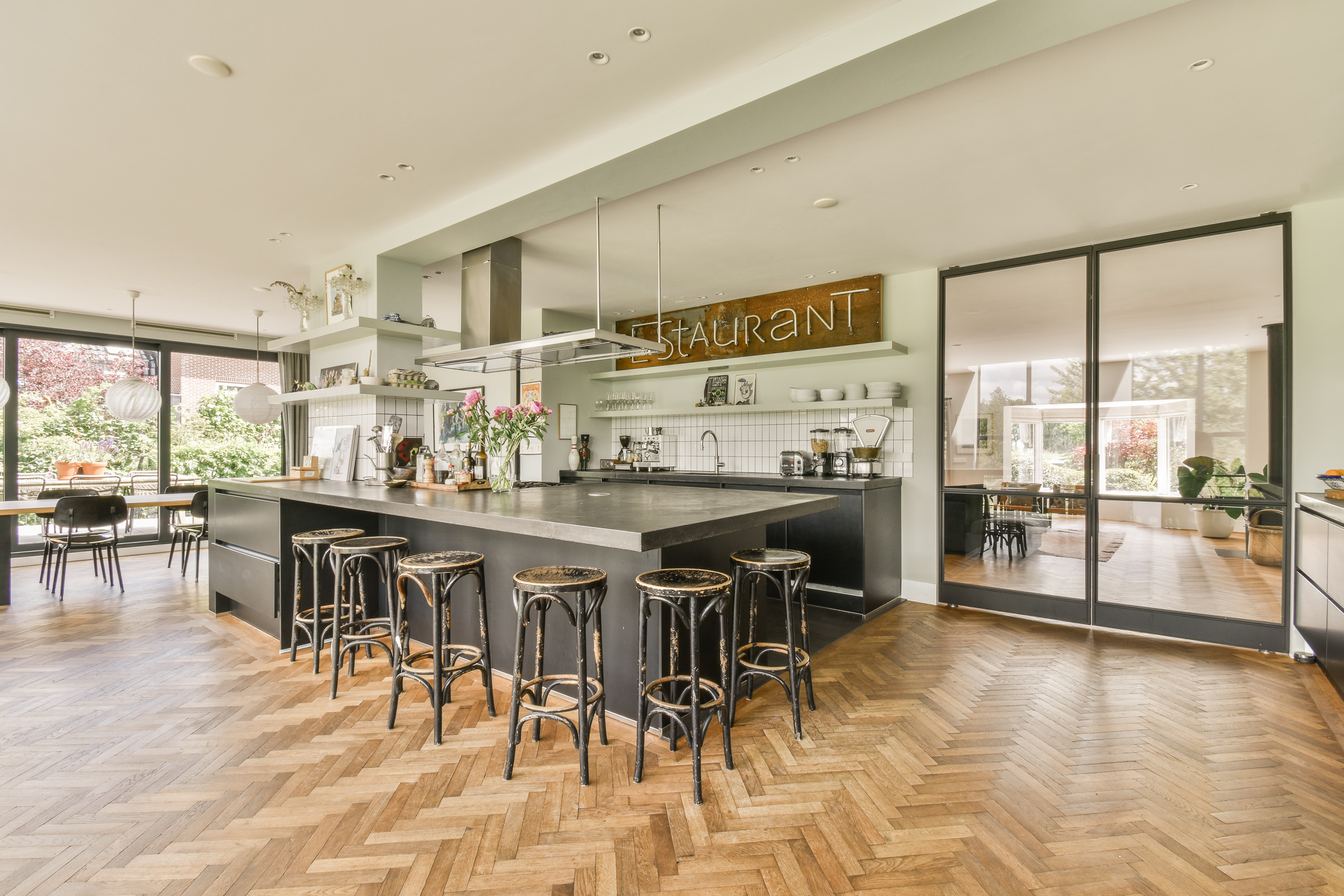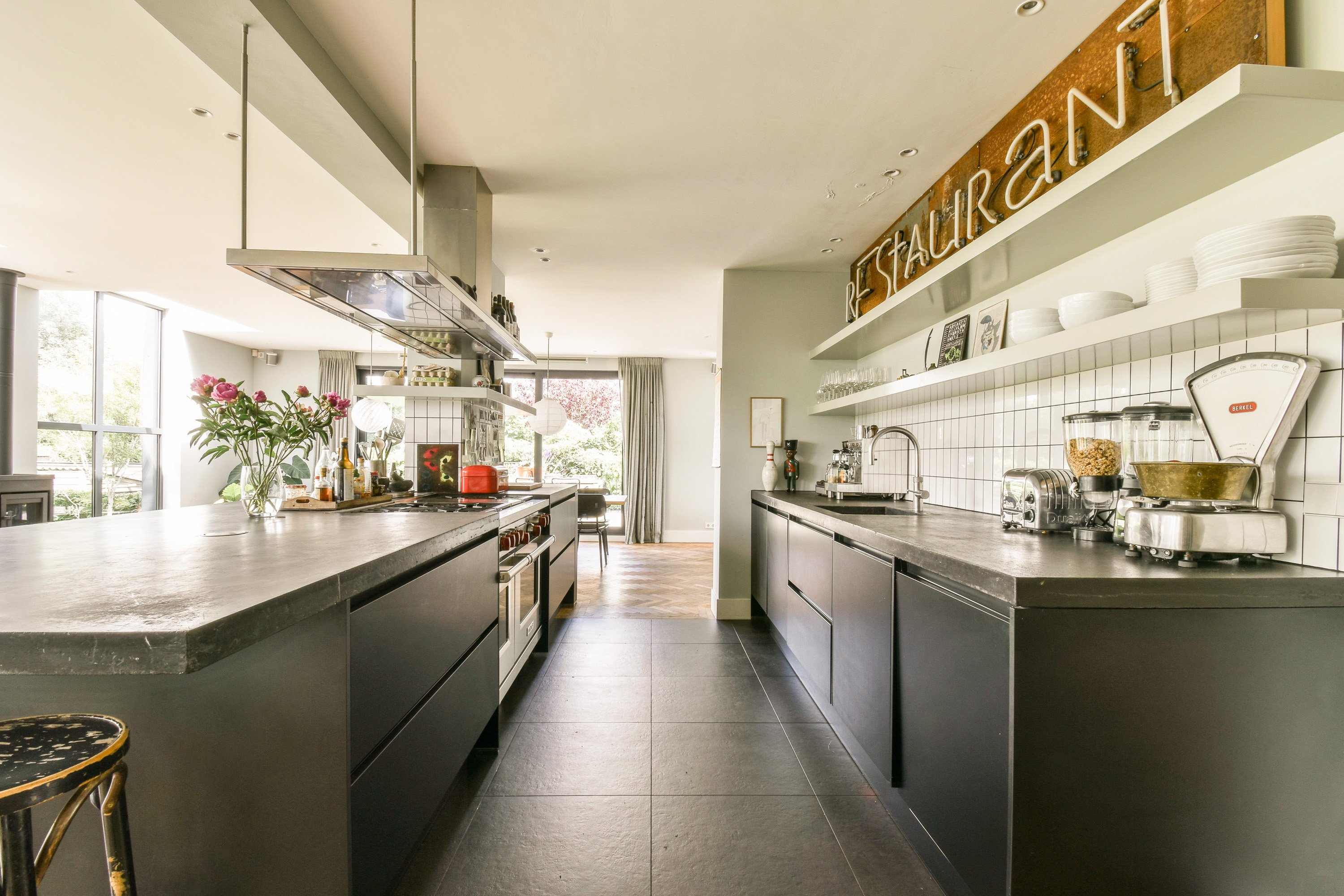De bel-etage is te betreden via de representatieve entree aan de voorzijde van de woning. Bij binnenkomst vind je een gastentoilet en de centrale hal met toegang tot de sfeervolle woonkamer. Aan de achterzijde bevindt zich de royale woon-eetkeuken, compleet uitgerust met hoogwaardige inbouwapparatuur. Dankzij grote raampartijen en meerdere toegangen tot de buitenruimte, ervaar je hier veel licht en openheid. Rondom deze verdieping bevinden zich één groot terras : aan de zijkant en aan de voorkant – perfect voor buiten dineren of ontspannen in de zon.