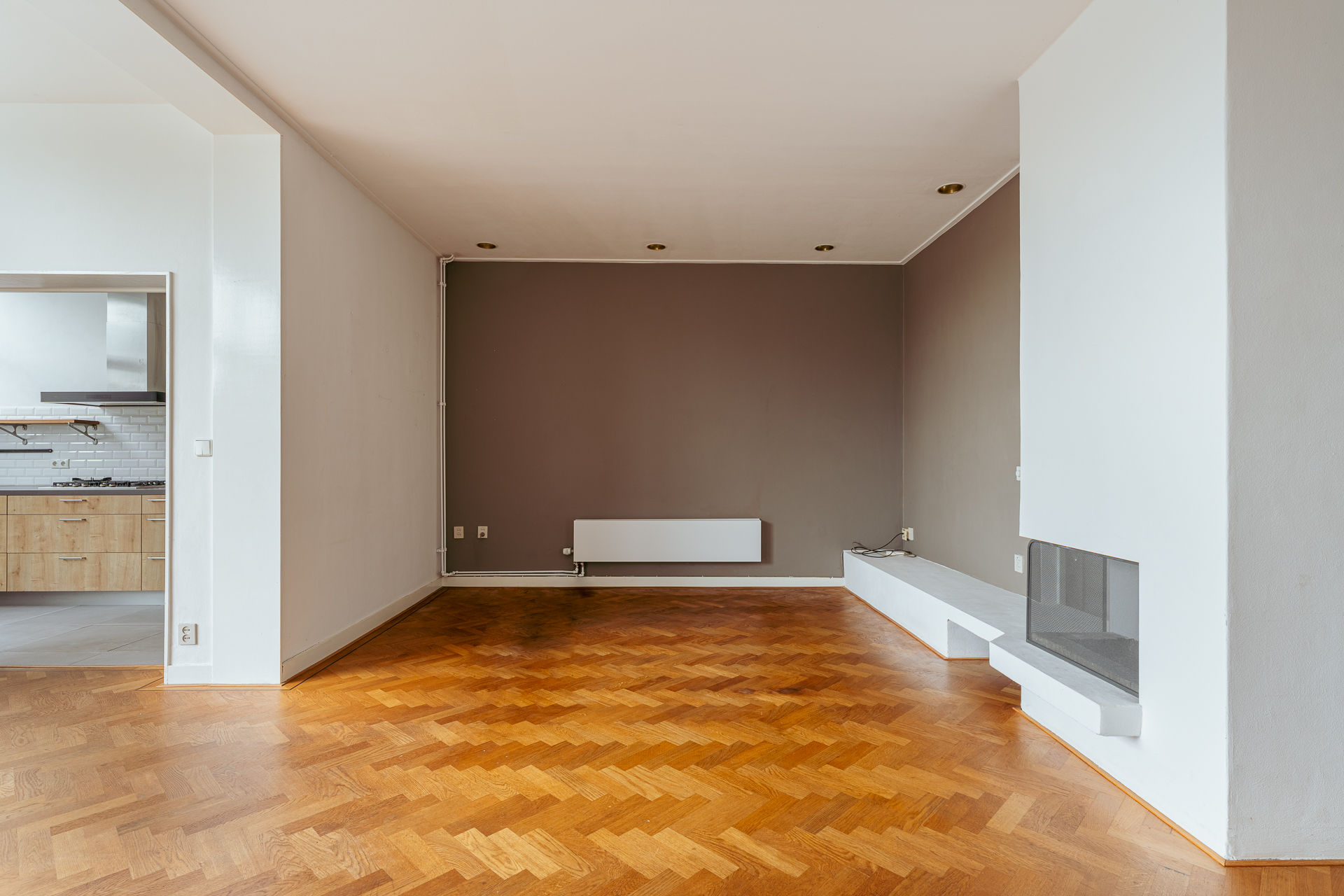 De royale woonkamer strekt zich uit over de volle breedte van de woning en kenmerkt zich door de fraaie houten, visgraatvloer en grote raampartijen met openslaande deuren naar de tuin. Hierdoor geniet de woonkamer van veel daglicht en een prachtig uitzicht over de achtergelegen tuin en de Amstel.