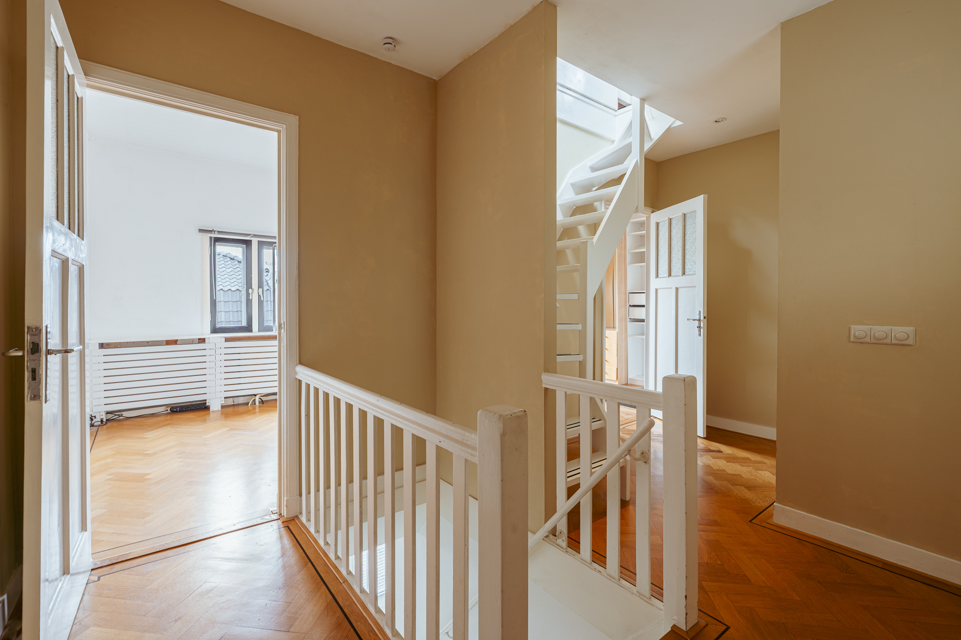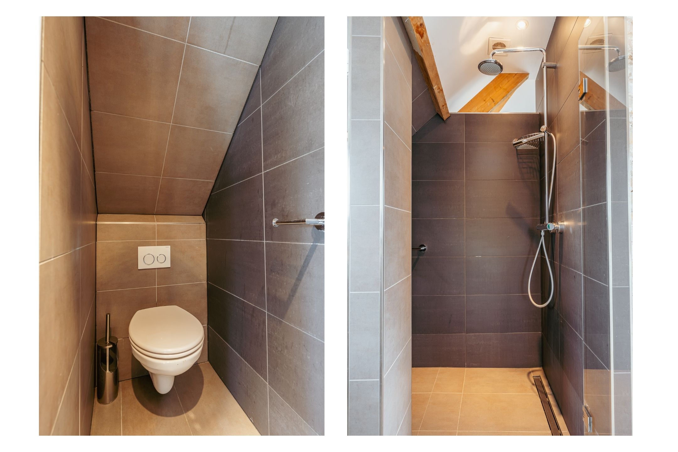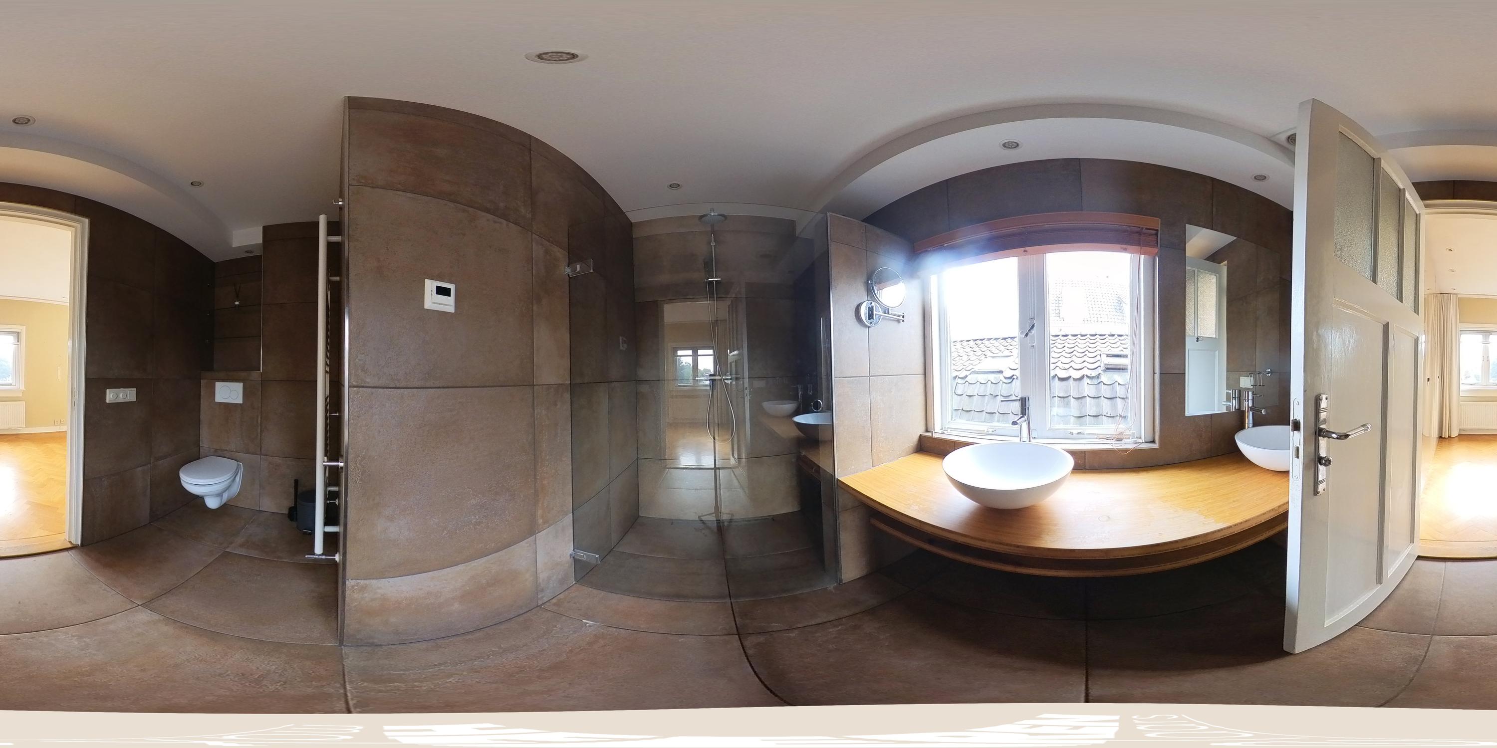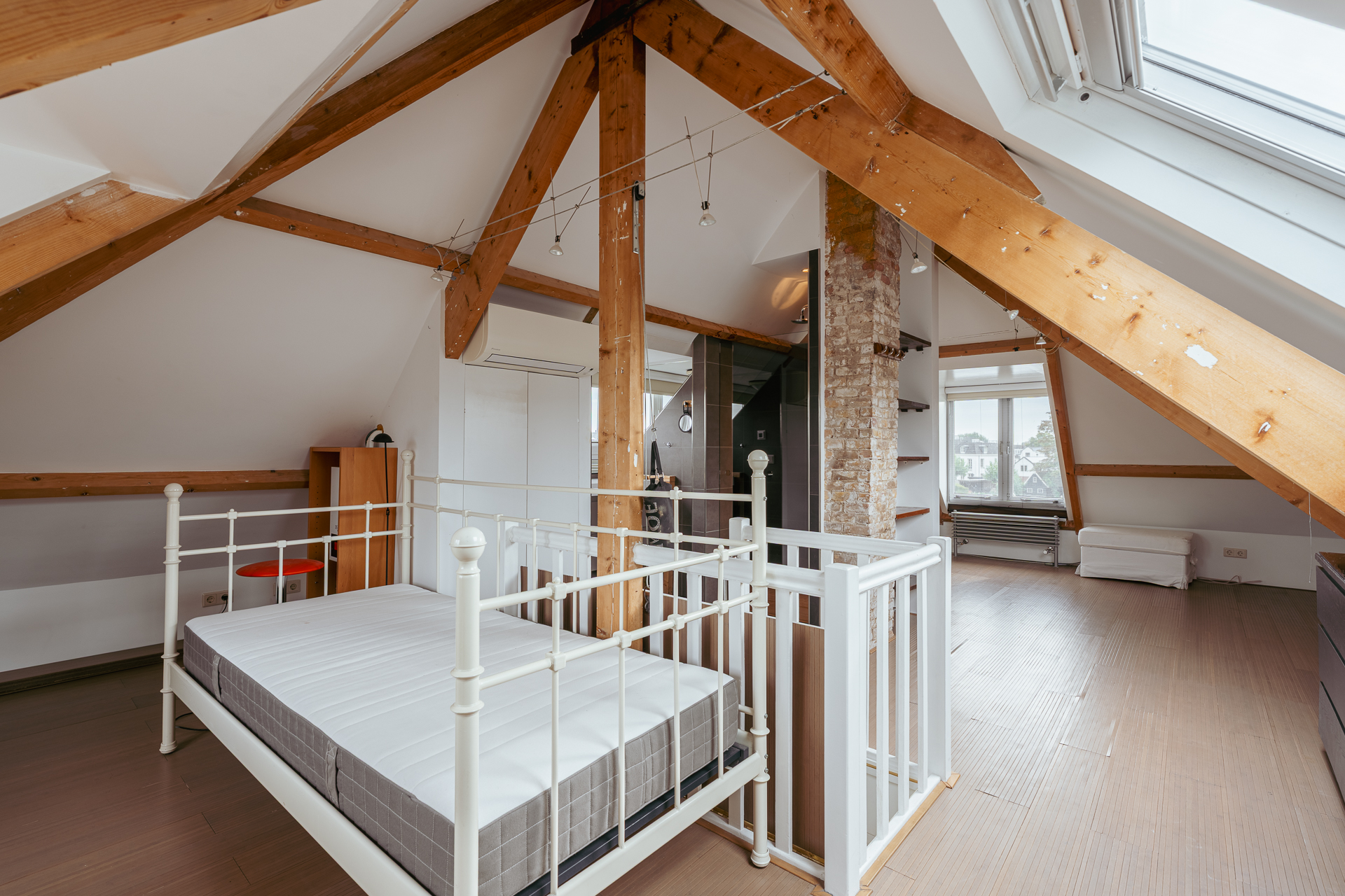 De bovenste verdieping is een open ruimte met hoge nok (ruim 3 meter) en grote dakramen en dakkapellen die zorgen voor veel lichtinval. Hier bevindt zich tevens een moderne badkamer met inloopdouche, wastafelmeubel, vloerverwarming en een derde toilet. Deze verdieping is bovendien voorzien van airconditioning, wat extra comfort biedt in alle seizoenen. De combinatie van het authentieke balkenplafond en de strakke afwerking geeft deze ruimte een bijzondere uitstraling. Indien gewenst kan de verdieping relatief eenvoudig worden opgedeeld in twee aparte slaapkamers.