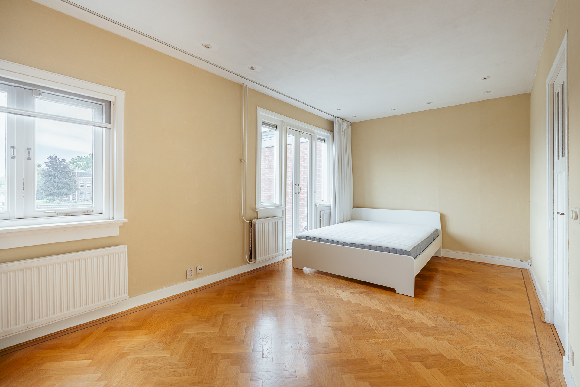 De ruime overloop geeft toegang tot drie slaapkamers en de badkamer. De hoofdslaapkamer ligt aan de achterzijde en beschikt over dubbele openslaande deuren naar een groot balkon van ca. 17 m² met een adembenemend uitzicht over de Amstel. De kamer is royaal en voorzien van een fraaie houten vloer.