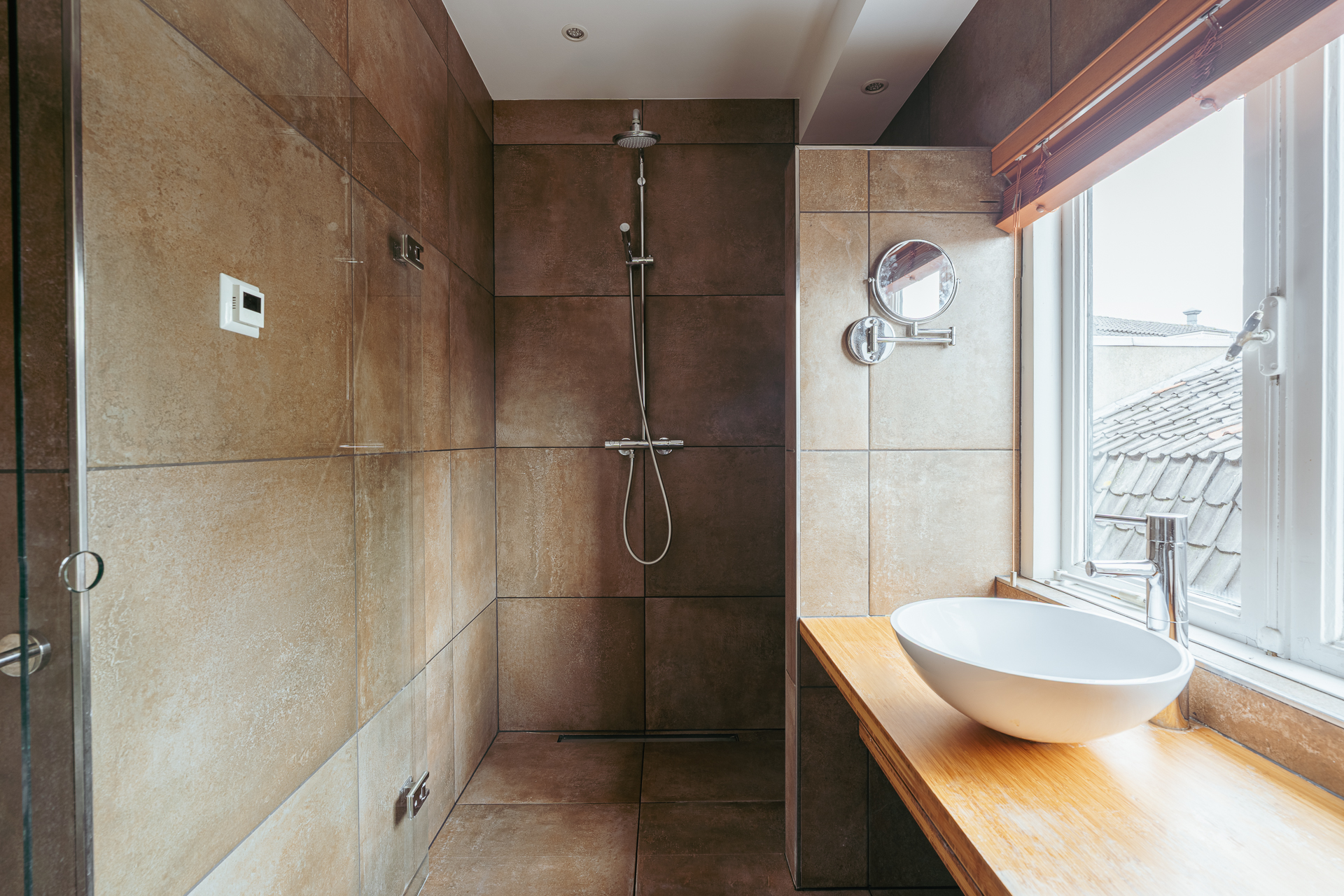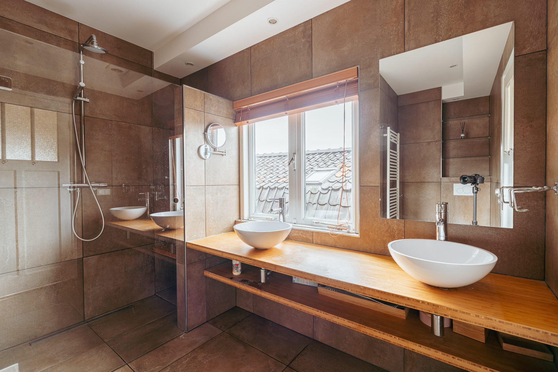De badkamer is uitgerust met een inloopdouche, dubbele wastafel met houten meubel en een tweede toilet. Dankzij het raam is er natuurlijke lichtinval en ventilatie. Bovendien is de badkamer voorzien van vloerverwarming.
