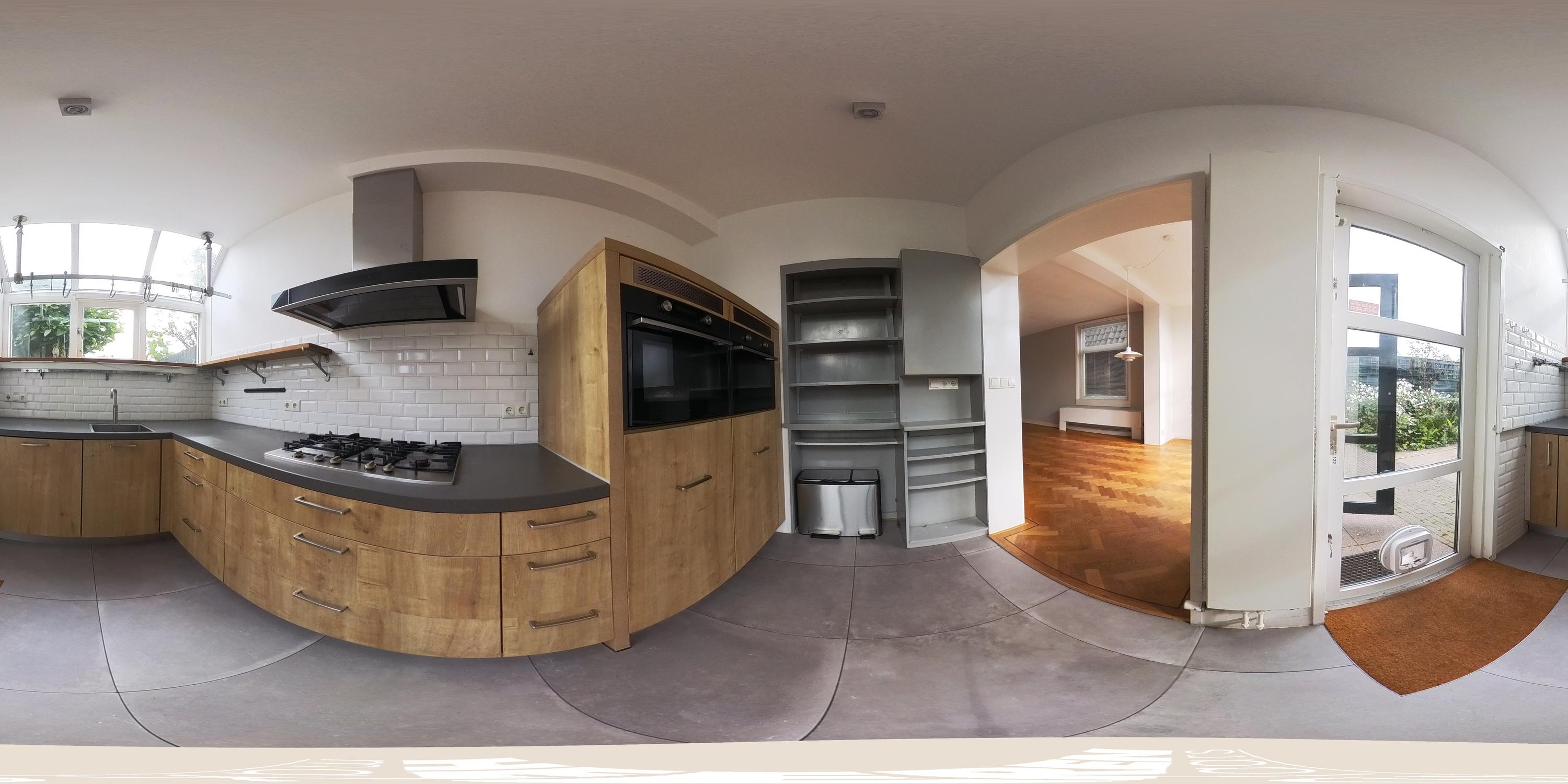 Aangrenzend bevindt zich de halfopen keuken, modern uitgevoerd in houttinten met een donker werkblad, vloerverwarming en voorzien van diverse inbouwapparatuur, waaronder een 5-pits gasfornuis, Quooker, combi-oven, vaatwasser en koel-vriescombinatie. Ook vanuit de keuken is er toegang tot de tuin.