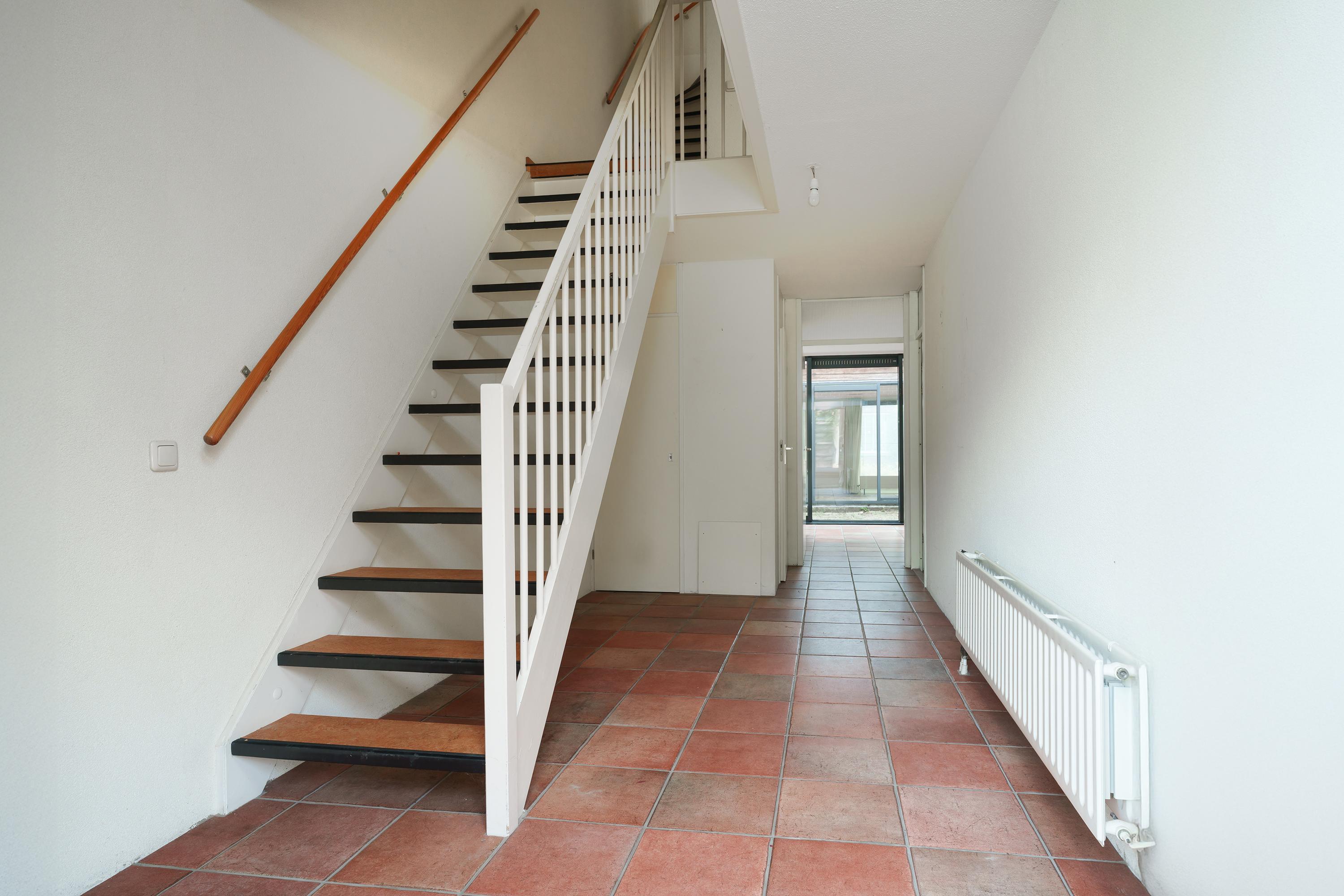 U betreedt de woning via de entree aan de voorzijde. Hier bevindt zich ook de ruime inpandige berging/garage (21 m²), voorzien van elektra, water, verwarming en een elektrische deur. In de royale hal vindt u de meterkast, toilet en de trap naar boven.