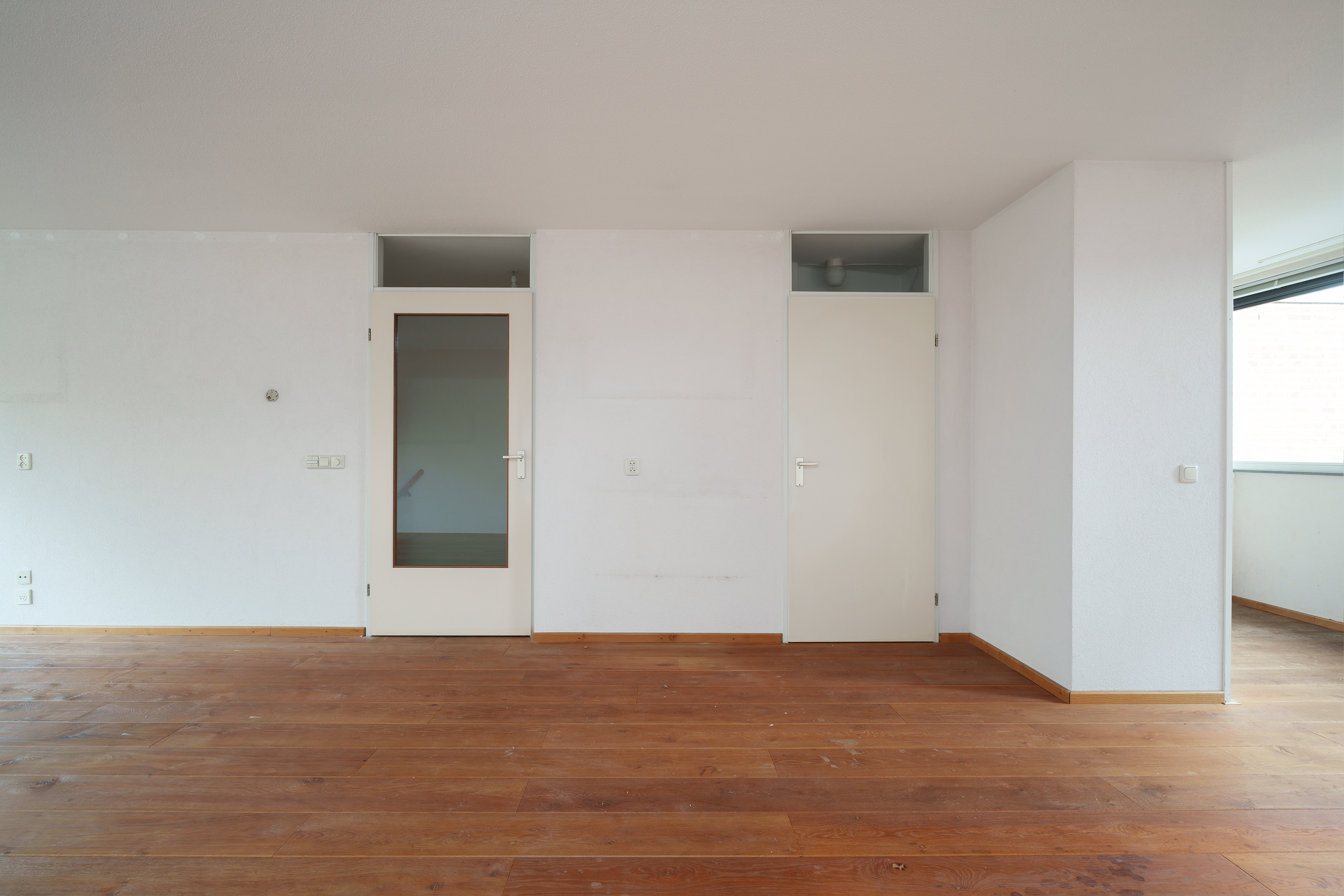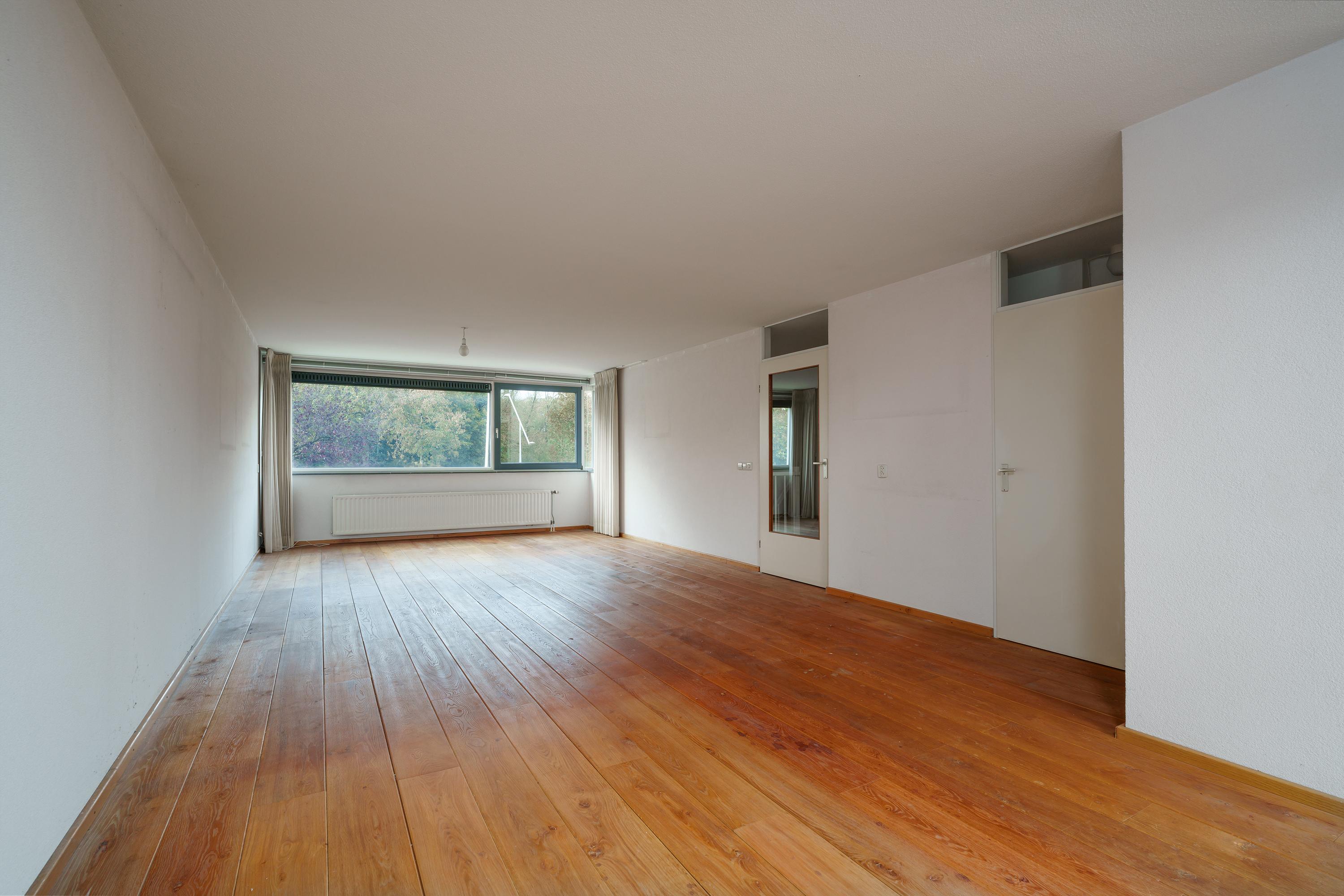 Vanaf de overloop bereikt u de brede en lichte living. Dankzij grote raampartijen aan beide zijden valt het daglicht rijkelijk binnen. De open keuken ligt aan de achterzijde.