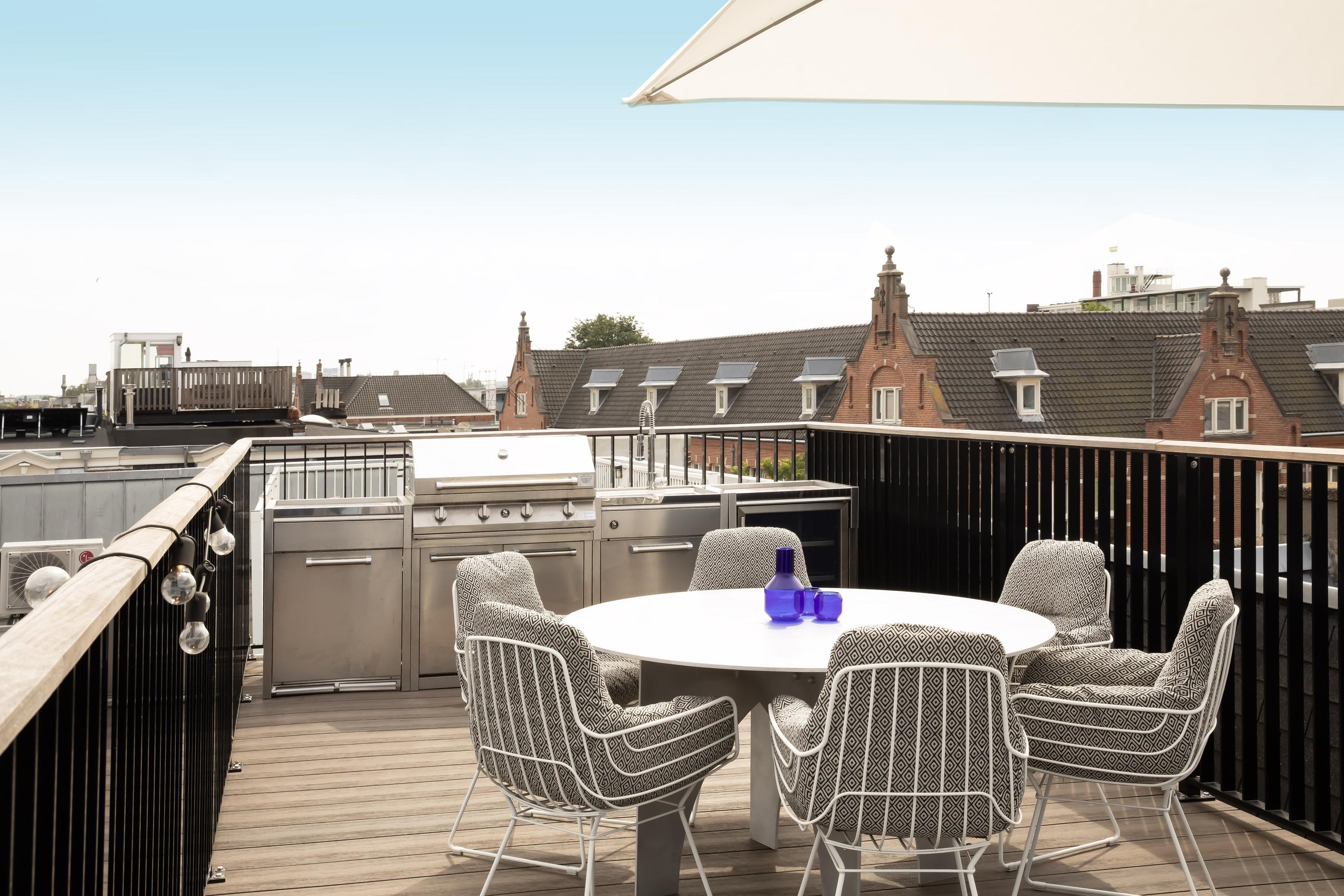Het absolute hoogtepunt van deze woning is het riante dakterras, dat een prachtig uitzicht over de stad biedt. Hier kunt u tot in de late uurtjes genieten van de zon. Het terras is bovendien uitgerust met een luxe buitenkeuken met grill, spoelbak, ijsmachine en wijnklimaatkast – een perfecte plek voor ontspannen avonden en sfeervolle diners.