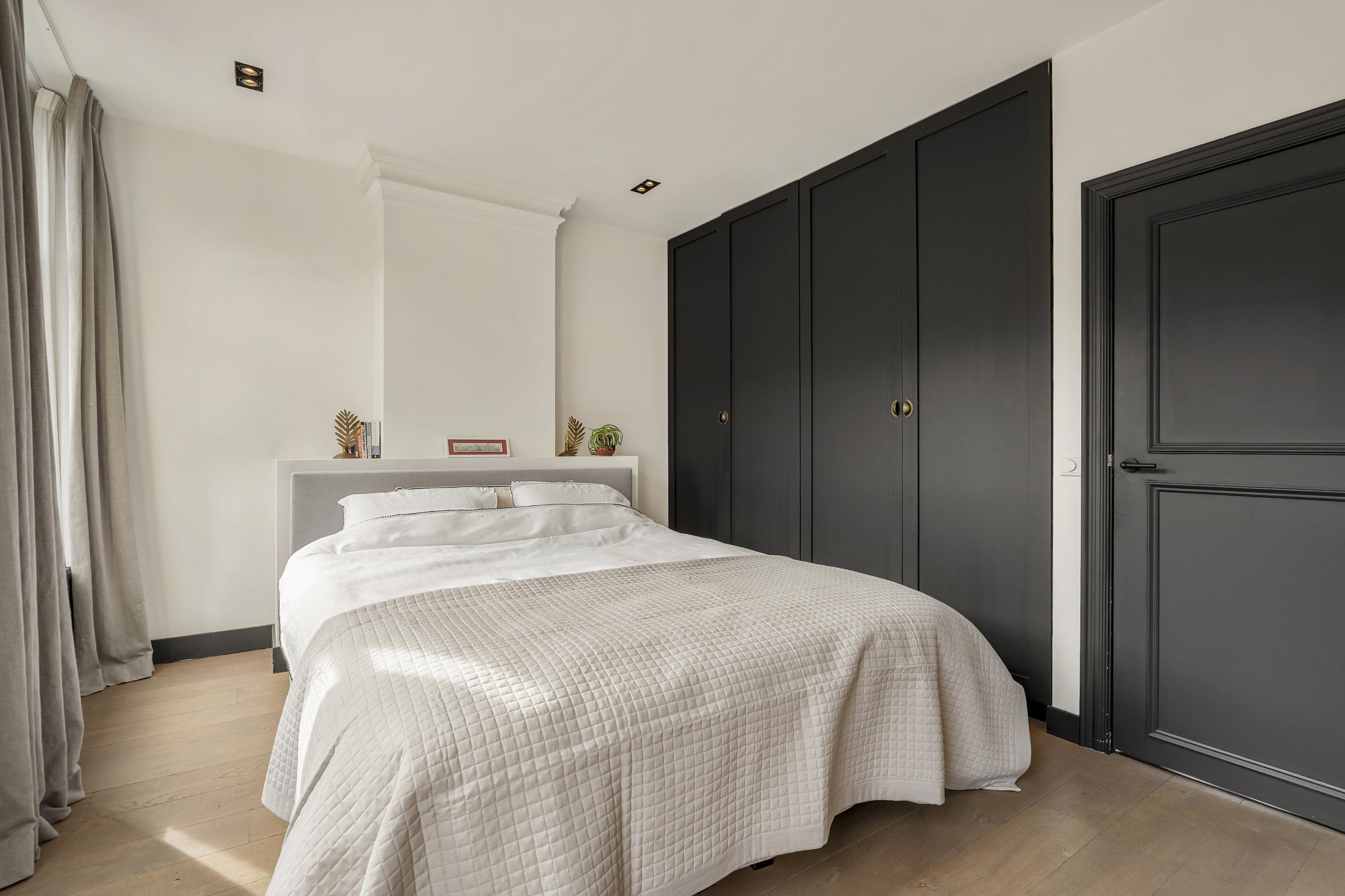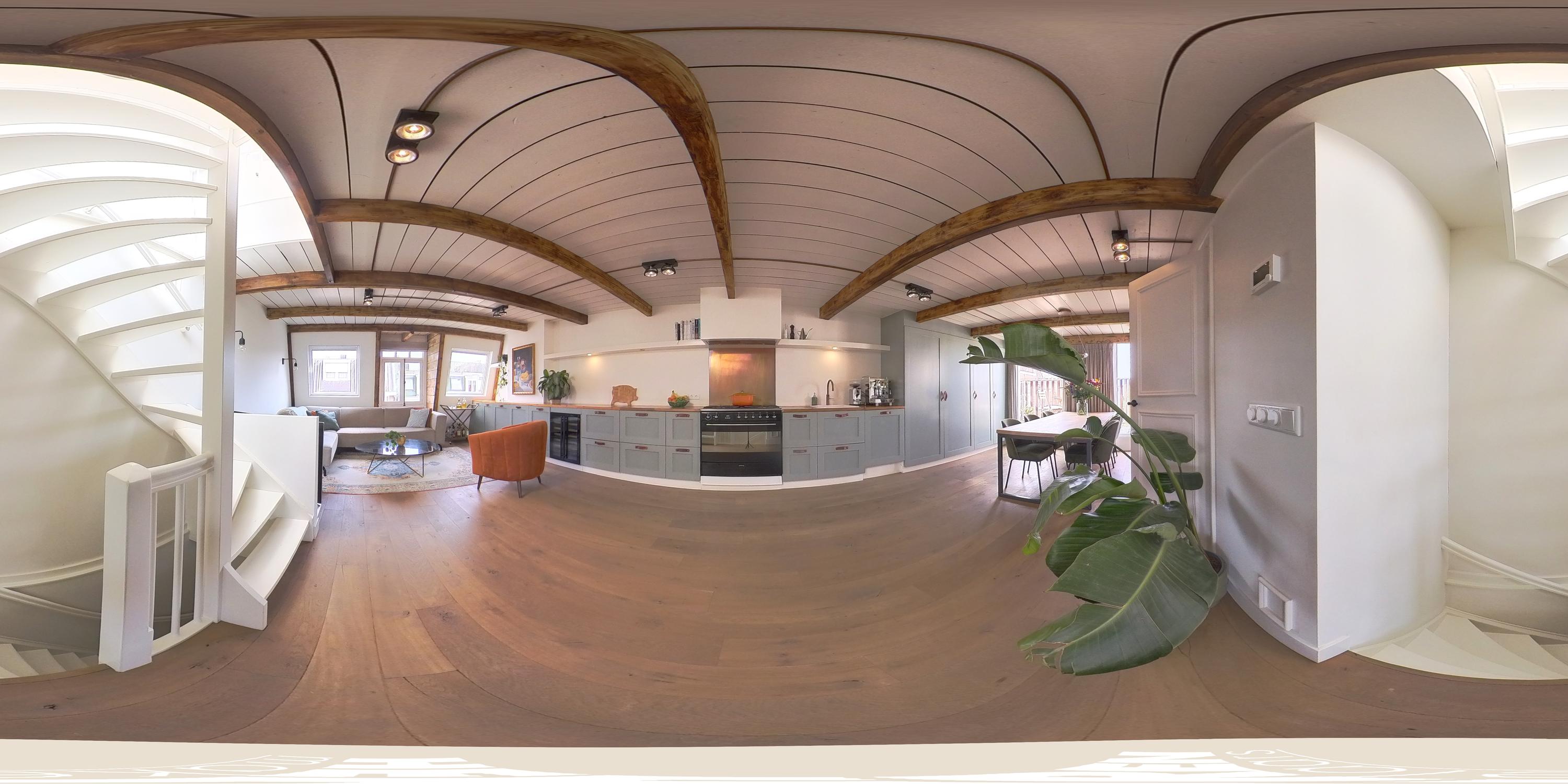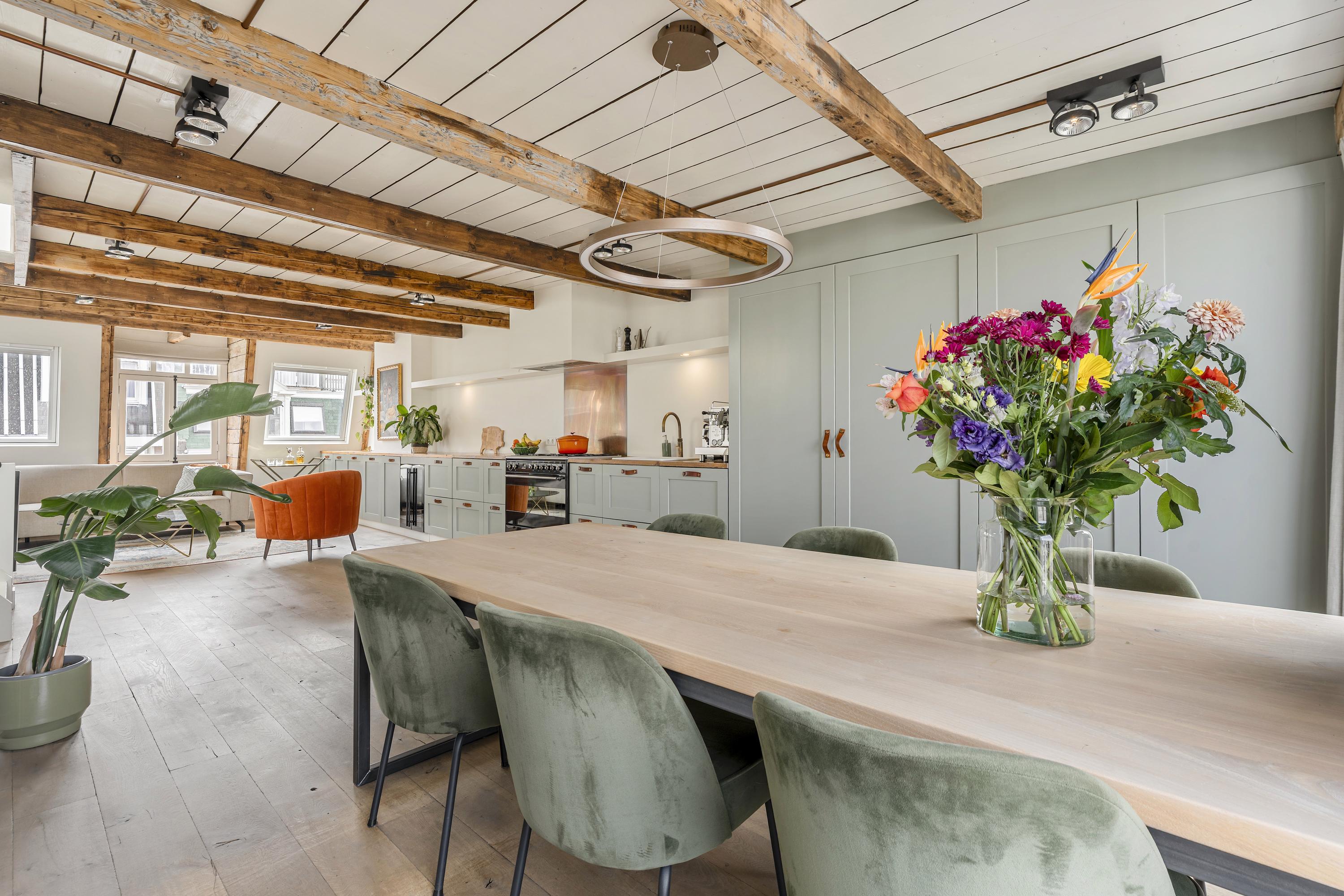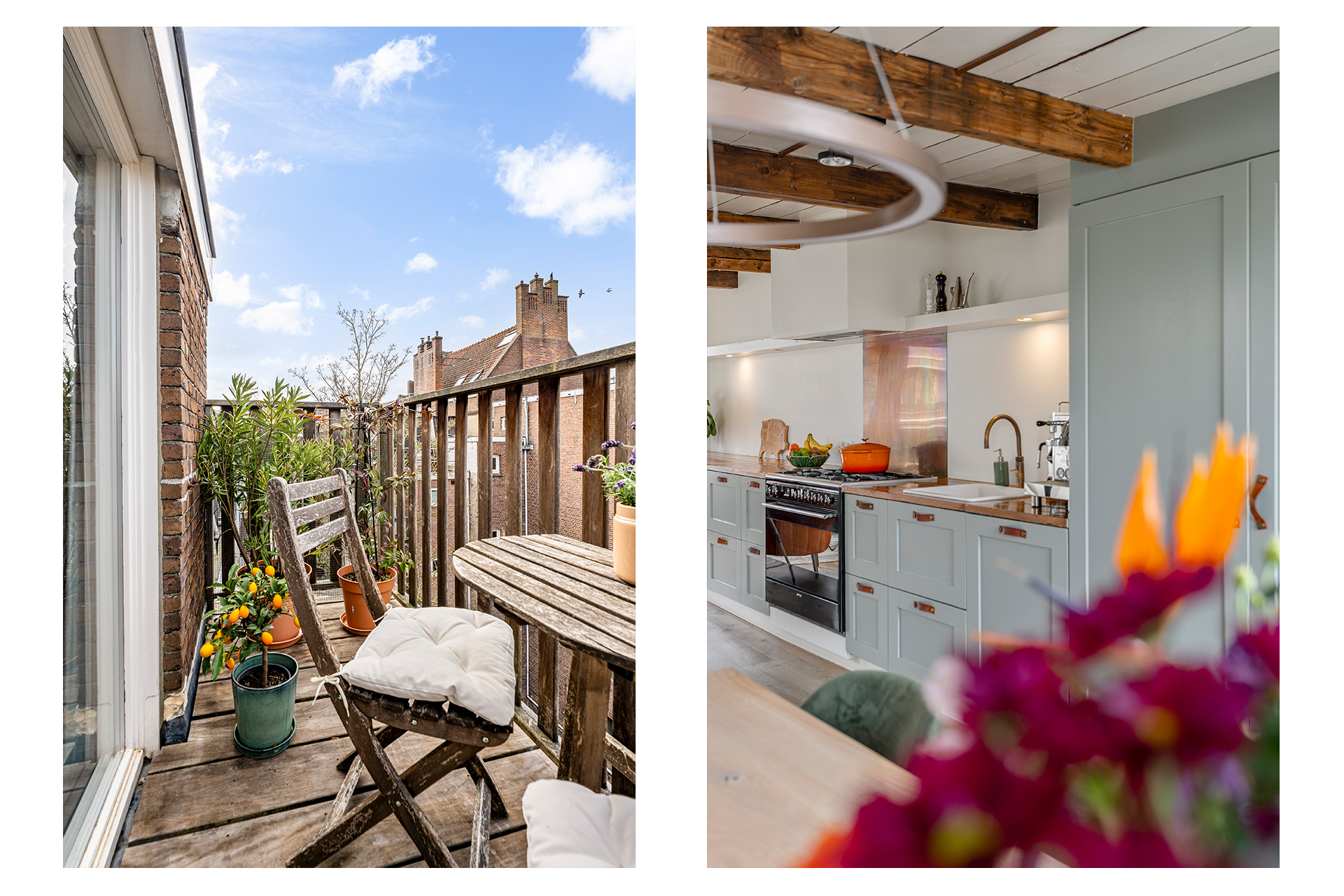 De woonverdieping, gelegen op de vierde verdieping, bestaat uit een royale en lichte woonkamer met open keuken. De ruimte kenmerkt zich door de sfeervolle houten balken, die zorgen voor karakter en warmte. Dankzij de raampartijen aan zowel de voor- als achterzijde, en het inkomende licht vanaf het dakterras, is er gedurende de dag een prettige lichtinval. De open keuken loopt over de gehele wand en beschikt over meer dan voldoende bergruimte. De keuken is uitgerust met een zes pits gasfornuis, afzuigkap, oven, vaatwasser, spoelbak met Quooker, koelkast, vriezer en wijnklimaatkast. Tevens is deze verdieping voorzien van een apart toilet met dubbele deur. Vanuit de woonkamer is er direct toegang tot het balkon aan de achterzijde, gelegen op het Westen. Een vaste trap leidt naar het waanzinnige dakterras. Dit ruime terras biedt volledige privacy en geniet van 360 graden zon, waardoor u hier de hele dag door kunt ontspannen. Het terras biedt volop ruimte voor meerdere zit- en loungeplekken en is een absolute eyecatcher van de woning. De slaapverdieping is gelegen op de derde etage. Hier bevinden zich drie goed bemeten slaapkamers. Aan de achterzijde liggen twee slaapkamers, beide met toegang tot het balkon. Deze kamers zijn ideaal te gebruiken als slaap-, werk- of logeerkamer. Aan de voorzijde bevindt zich de nog ruimere master bedroom met Frans balkon. De badkamer is centraal gelegen en voorzien van een inloopdouche, dubbele wastafel met meubel en toilet. Daarnaast is er een separate ruimte met aansluitingen voor de wasmachine en droger, evenals praktische kastruimte op de overloop. De woonlagen zijn omgedraaid, waardoor de woonverdieping zich op de bovenste laag bevindt en optimaal wordt geprofiteerd van lichtinval, privacy en een ruimtelijk gevoel.