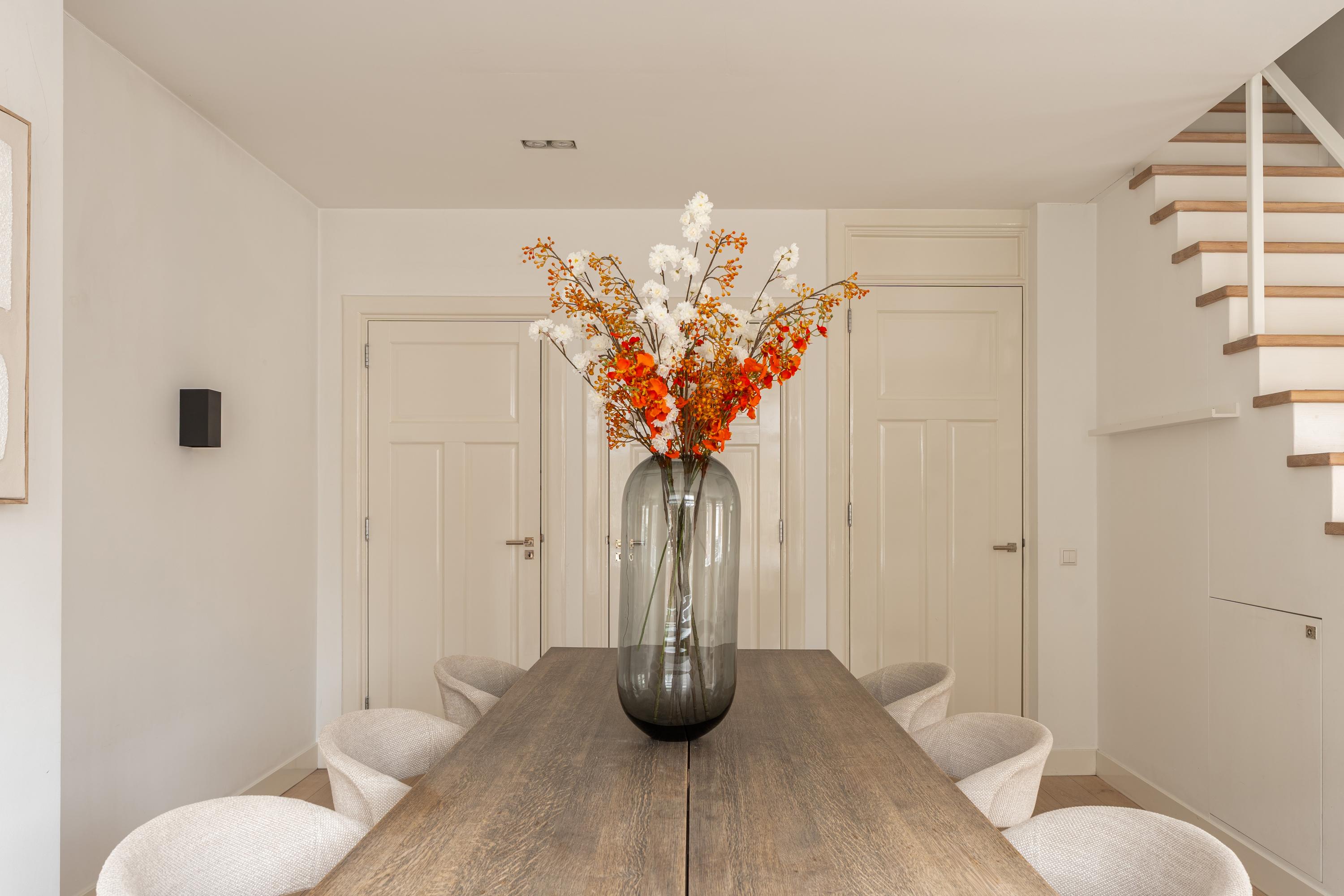 Via de ruime overloop bereikt u de bijzonder royale en lichte woonkamer, voorzien van een sfeervolle haard en een centraal geplaatste trap die de ruimte op speelse wijze indeelt in een zit- en eetgedeelte. Dankzij de vele raampartijen geniet de woonkamer van een prettige lichtinval. Daarnaast is er volop bergruimte aanwezig in de vorm van op maat gemaakte, ingebouwde kasten. De keuken is aan de achterzijde van de woning gesitueerd en uitgerust met een 4-pits gasfornuis met afzuigkap, oven, vaatwasser en een koel-vriescombinatie. Ook hier is voldoende kastruimte aanwezig. Op deze verdieping bevindt zich tevens de eerste slaapkamer, welke beschikt over een en-suite badkamer. Deze badkamer is voorzien van een inloopdouche en een wastafel met meubel. Een separaat toilet is toegankelijk vanuit de ruime hal.