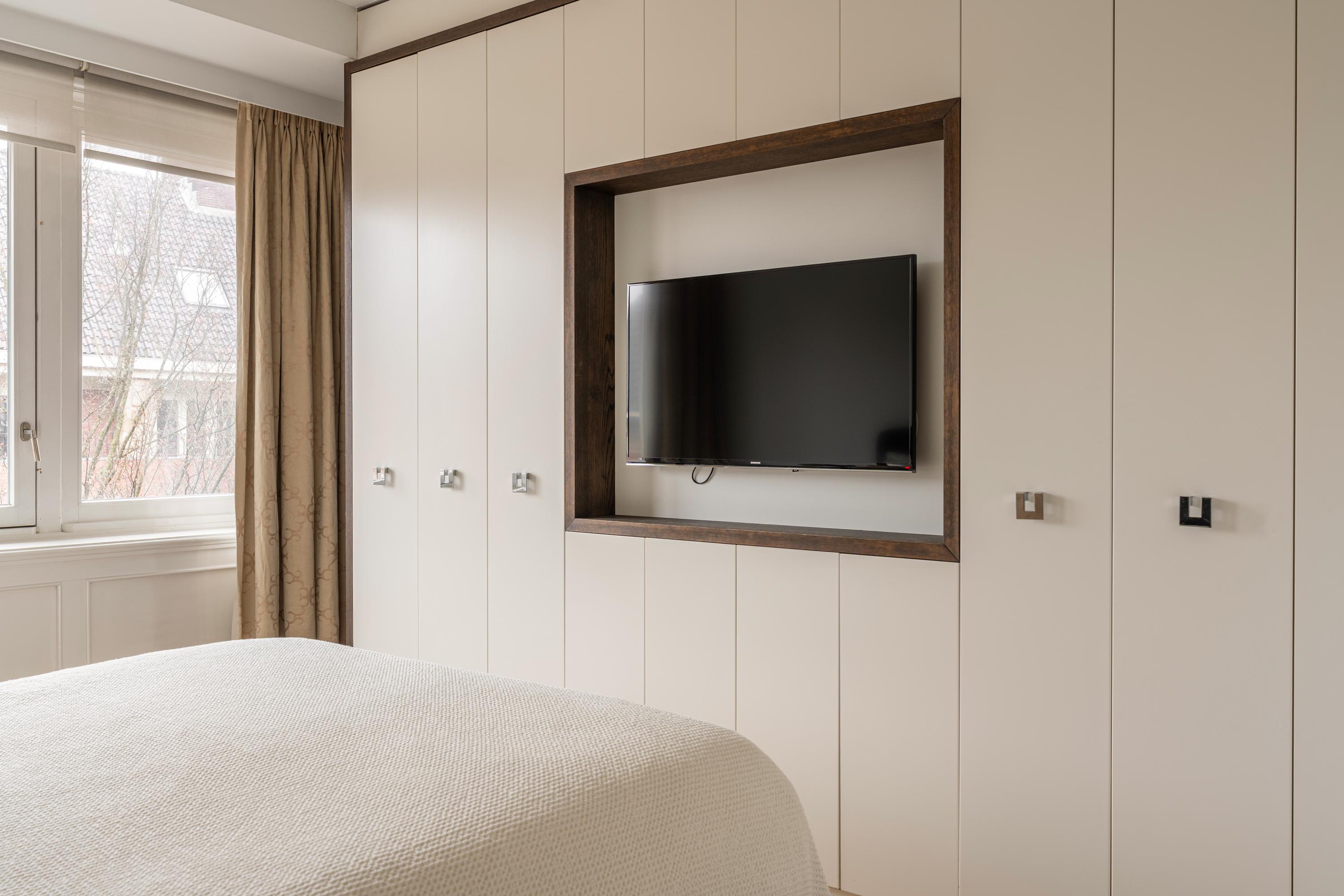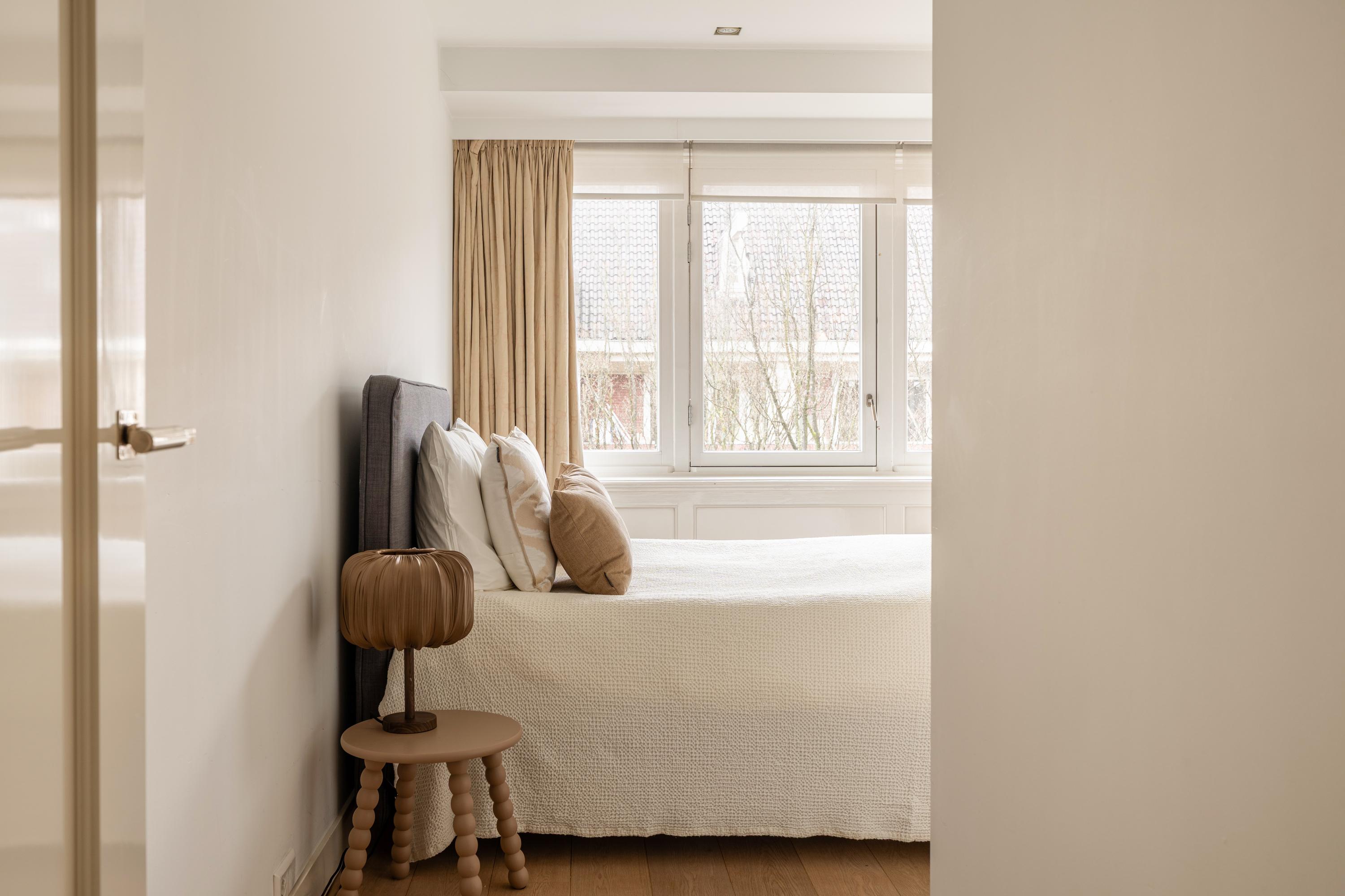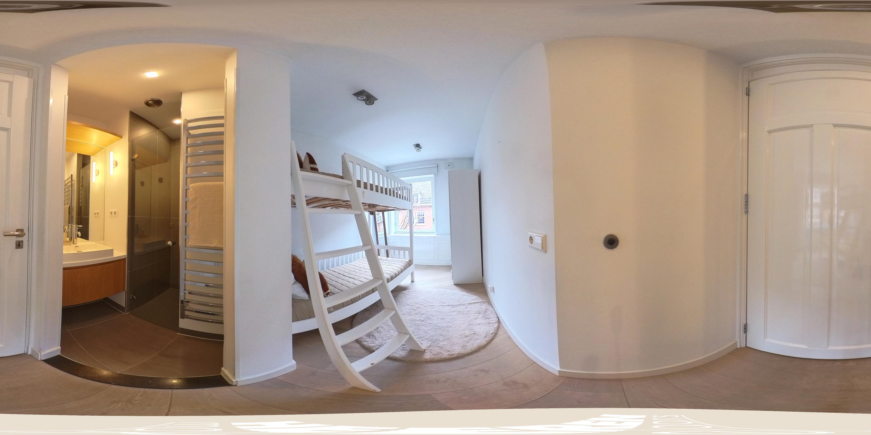 Via de trap in de woonkamer bereikt u de derde en tevens bovenste verdieping van het appartement. Hier bevinden zich twee goed bemeten slaapkamers, beide voorzien van grote raampartijen en maatwerk inbouwkasten. De master bedroom beschikt bovendien over een stijlvol geïntegreerde televisie in de kastenwand. De moderne badkamer is uitgerust met een ruim ligbad, een dubbele wastafel met meubel en een toilet. Tevens bevinden zich hier de aansluitingen voor wasmachine en droger.