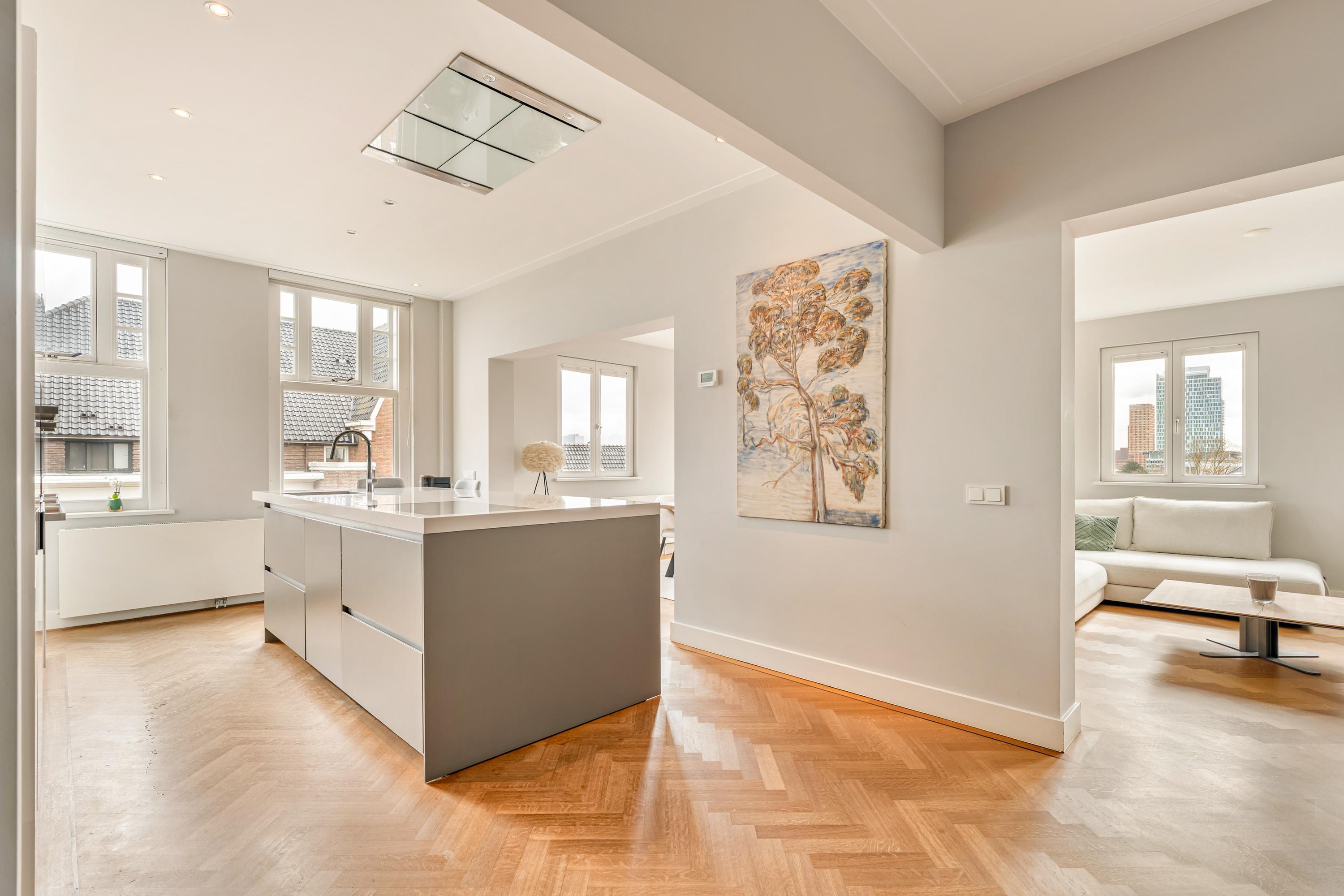 Het appartement is afgewerkt met een fraaie houten visgraatvloer en alle kozijnen zijn vernieuwd en uitgevoerd in hardhout met HR++ beglazing, waarbij het karakteristieke schuifraamsysteem is behouden en gemoderniseerd.