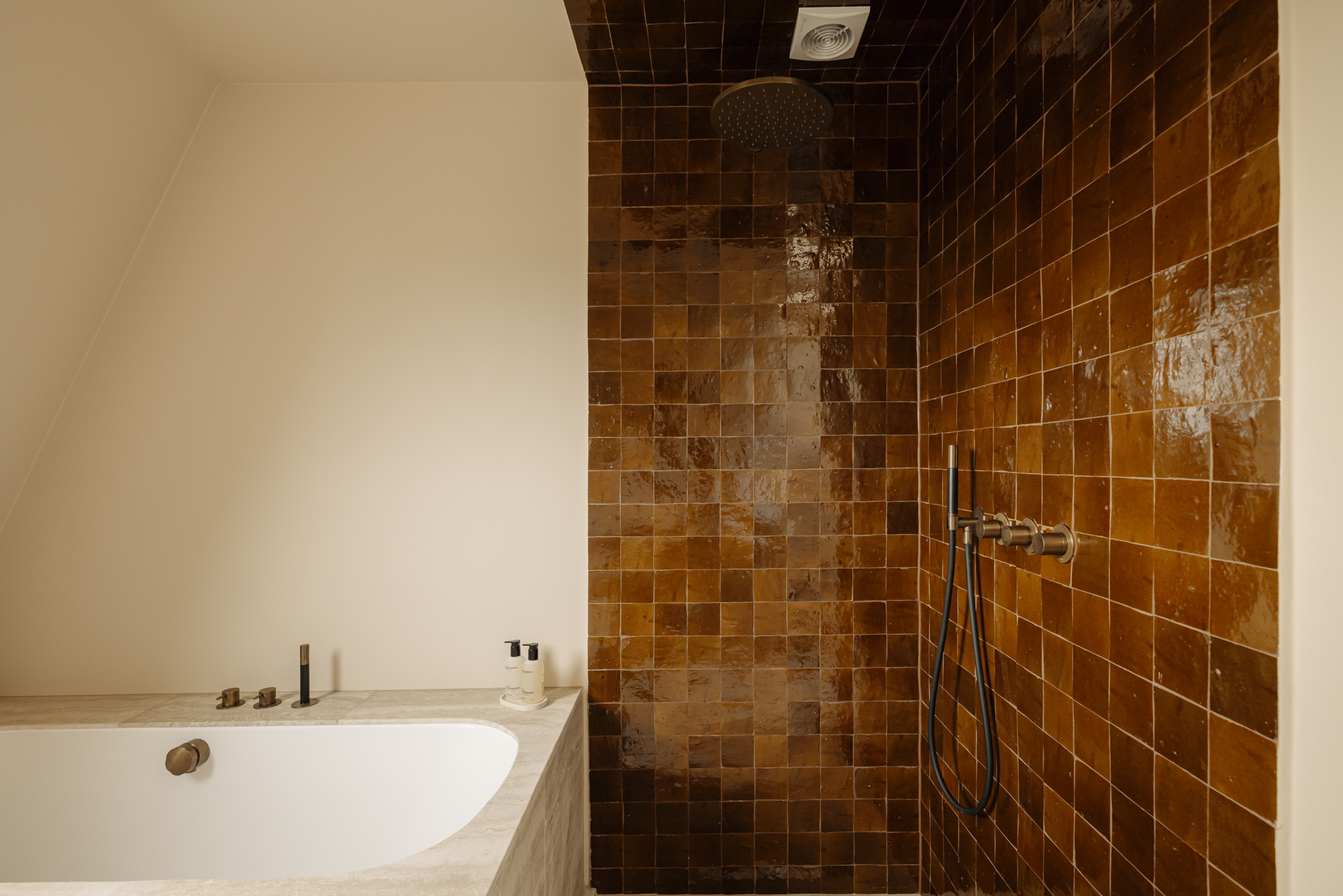 Het appartement is volledig gerenoveerd volgens de hoogste standaarden en voorzien van zeldzame, hoogwaardige materialen zoals natuursteen. De praktische indeling omvat een ruime woonkamer met plafonds van 3,44 meter hoog, een moderne open keuken met geïntegreerde apparatuur en een privé-slaapkamer met en-suite badkamer op de benedenverdieping. Grote ramen laten overvloedig daglicht binnenstromen, waardoor het zorgvuldig ontworpen interieur prachtig tot zijn recht komt en de historische omgeving extra wordt benadrukt. Op de bovenverdieping bevinden zich twee royale slaapkamers, waarvan één met toegang tot het balkon, een tweede luxe badkamer en een aparte wasruimte. Een separaat toilet op beide verdiepingen zorgt voor extra gemak. Het zuidwestelijk gelegen terras en balkon bieden een sereen uitzicht op de iconische bezienswaardigheden van de stad en creëren een harmonieuze verbinding tussen binnen- en buitenleven.