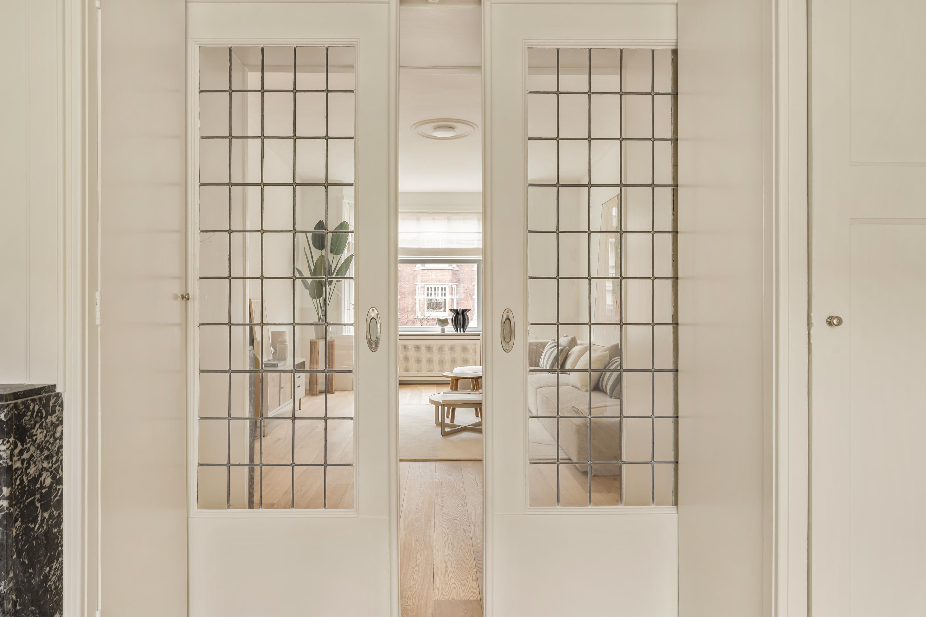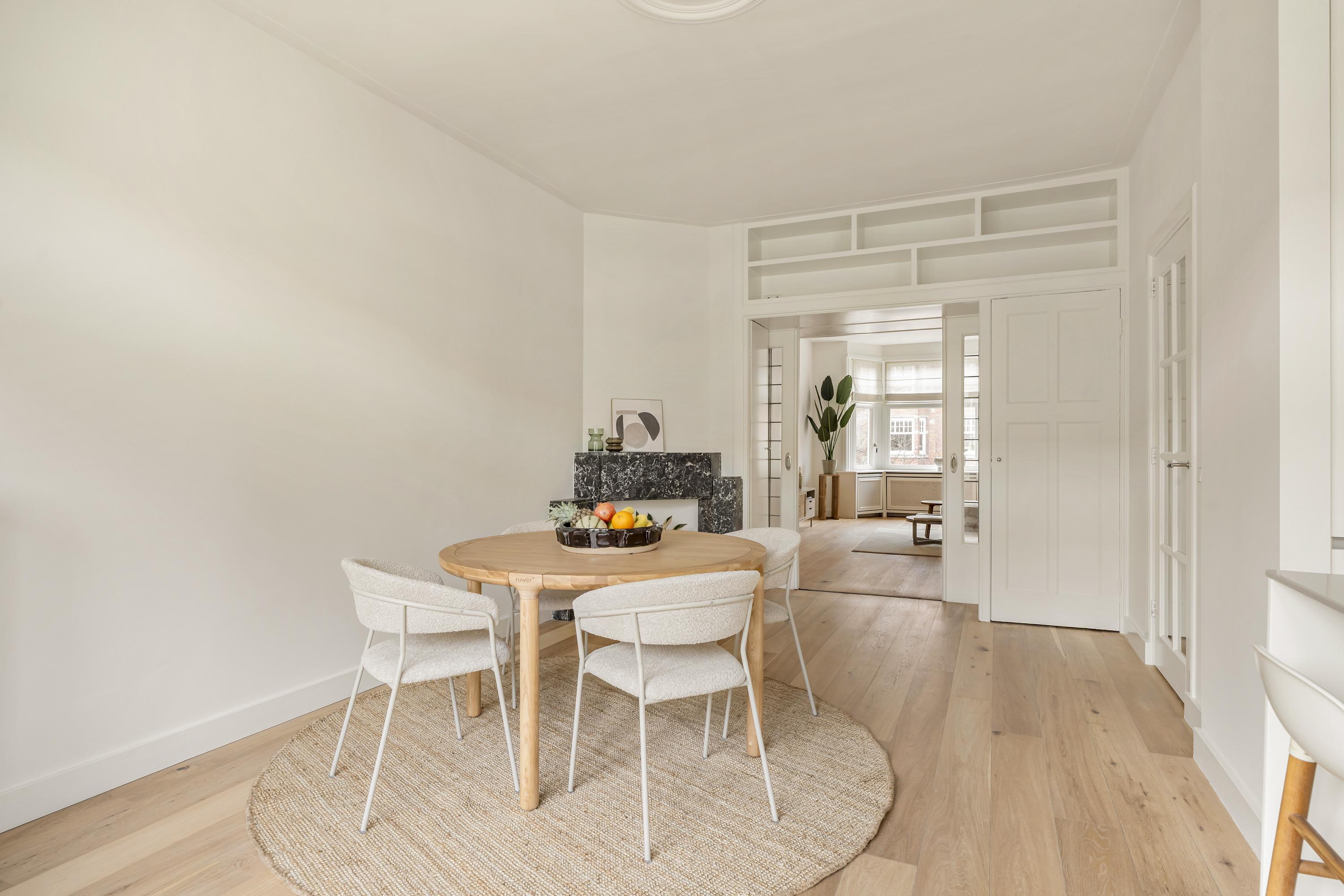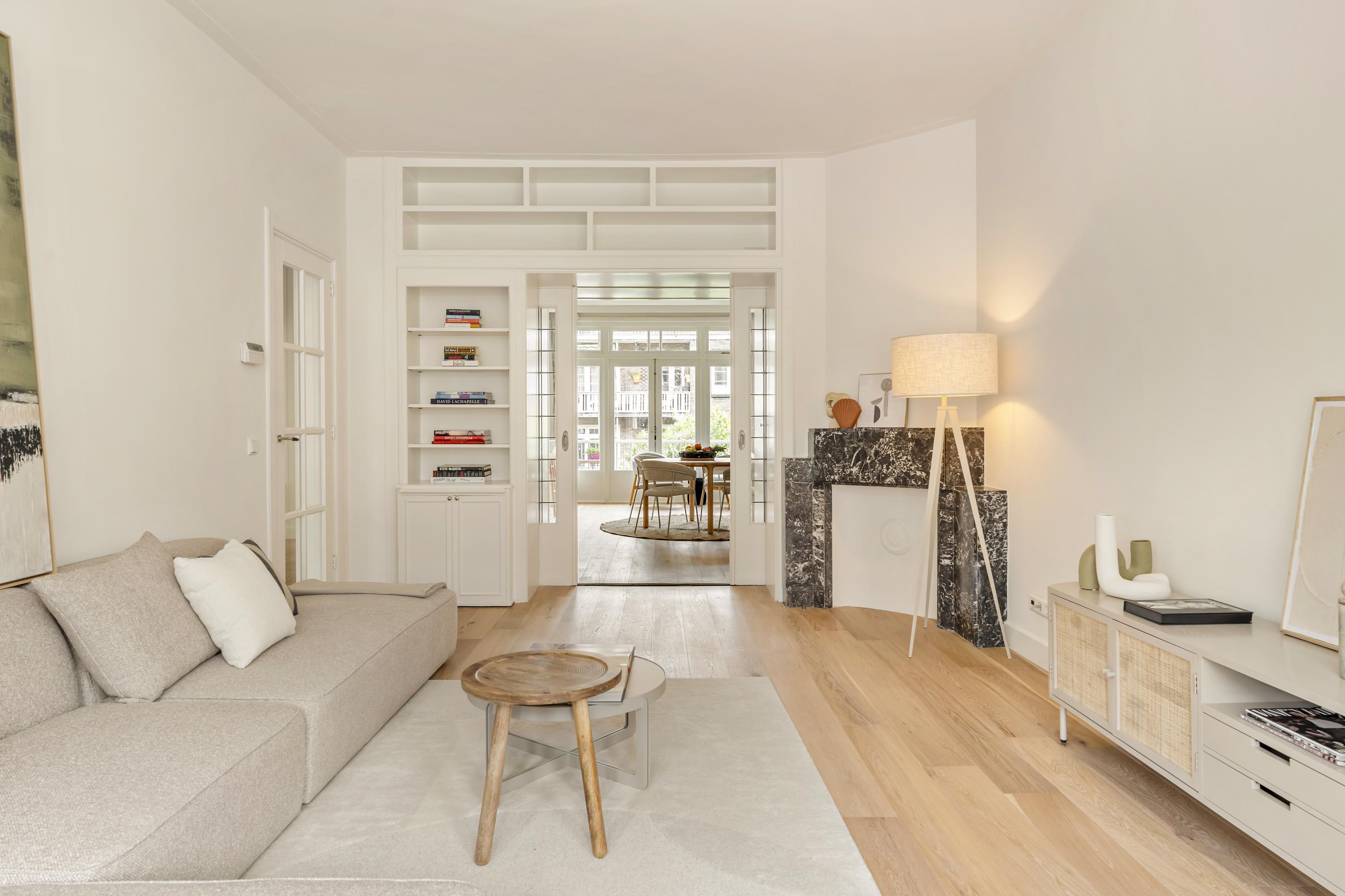 De woonkamer en suite strekt zich uit over de volledige diepte van de woning en is voorzien van originele schuifdeuren en vaste kasten. Aan de voorzijde bevindt zich de zitkamer met erker, waar de grote raampartijen zorgen voor een prettige lichtinval. Aan de achterzijde ligt de eetkamer, in directe verbinding met de open keuken.
