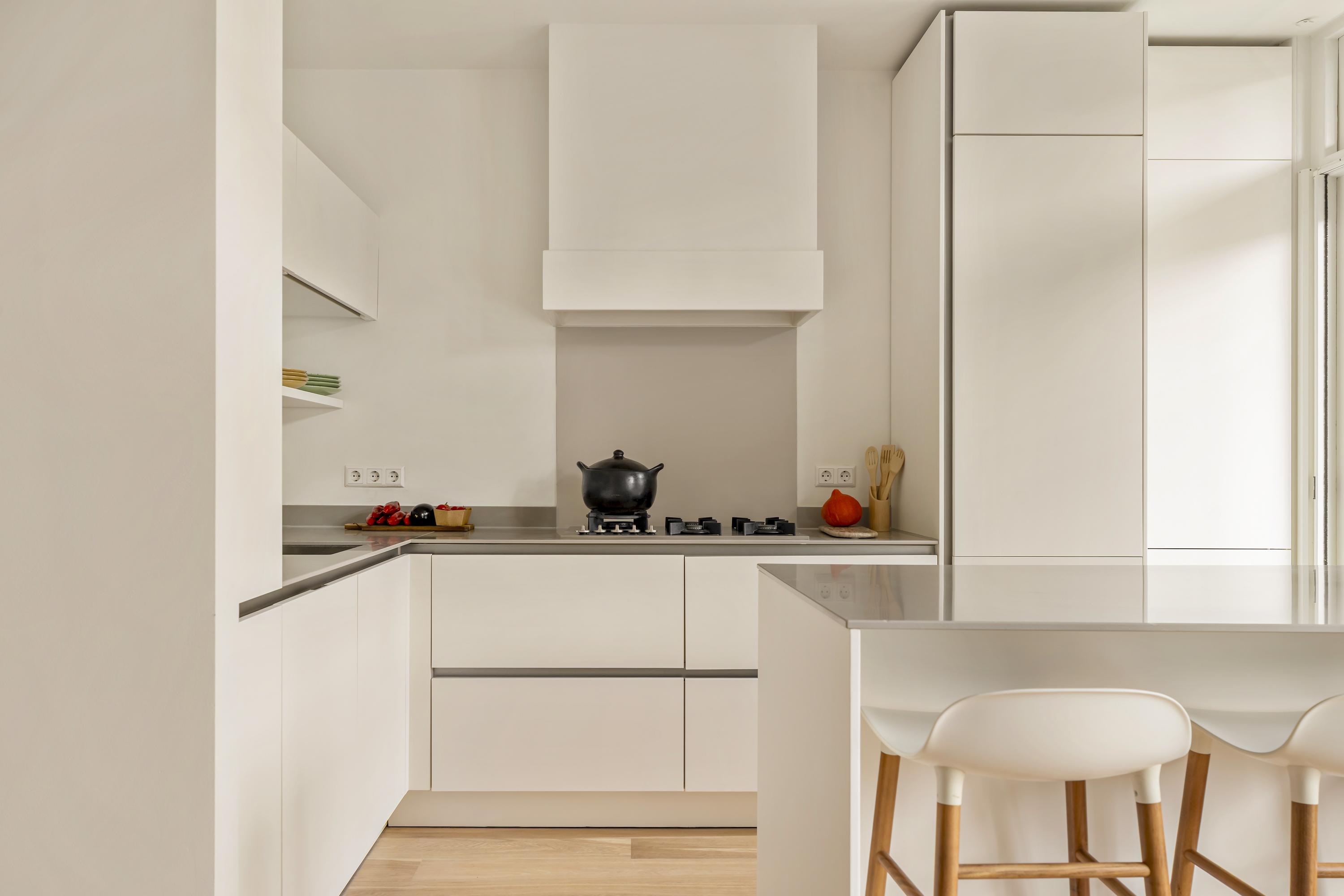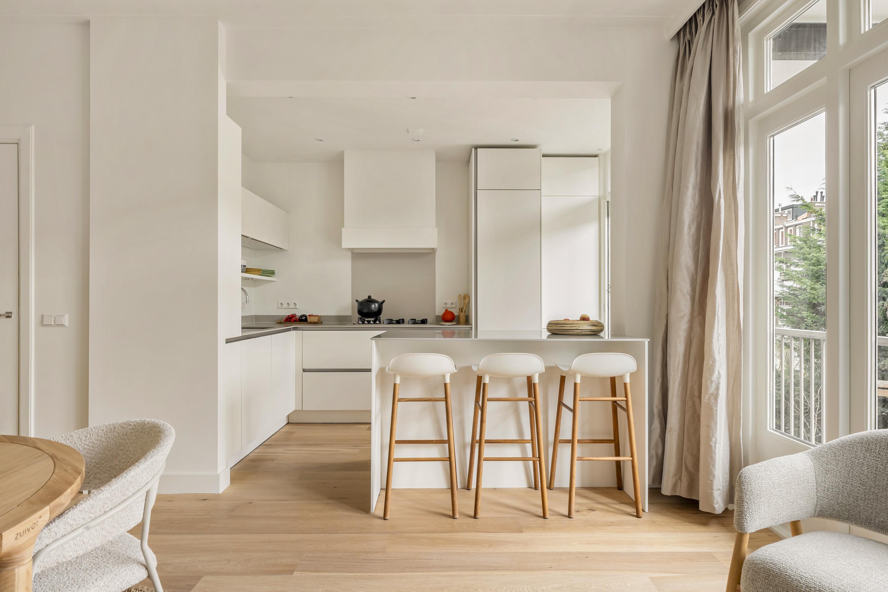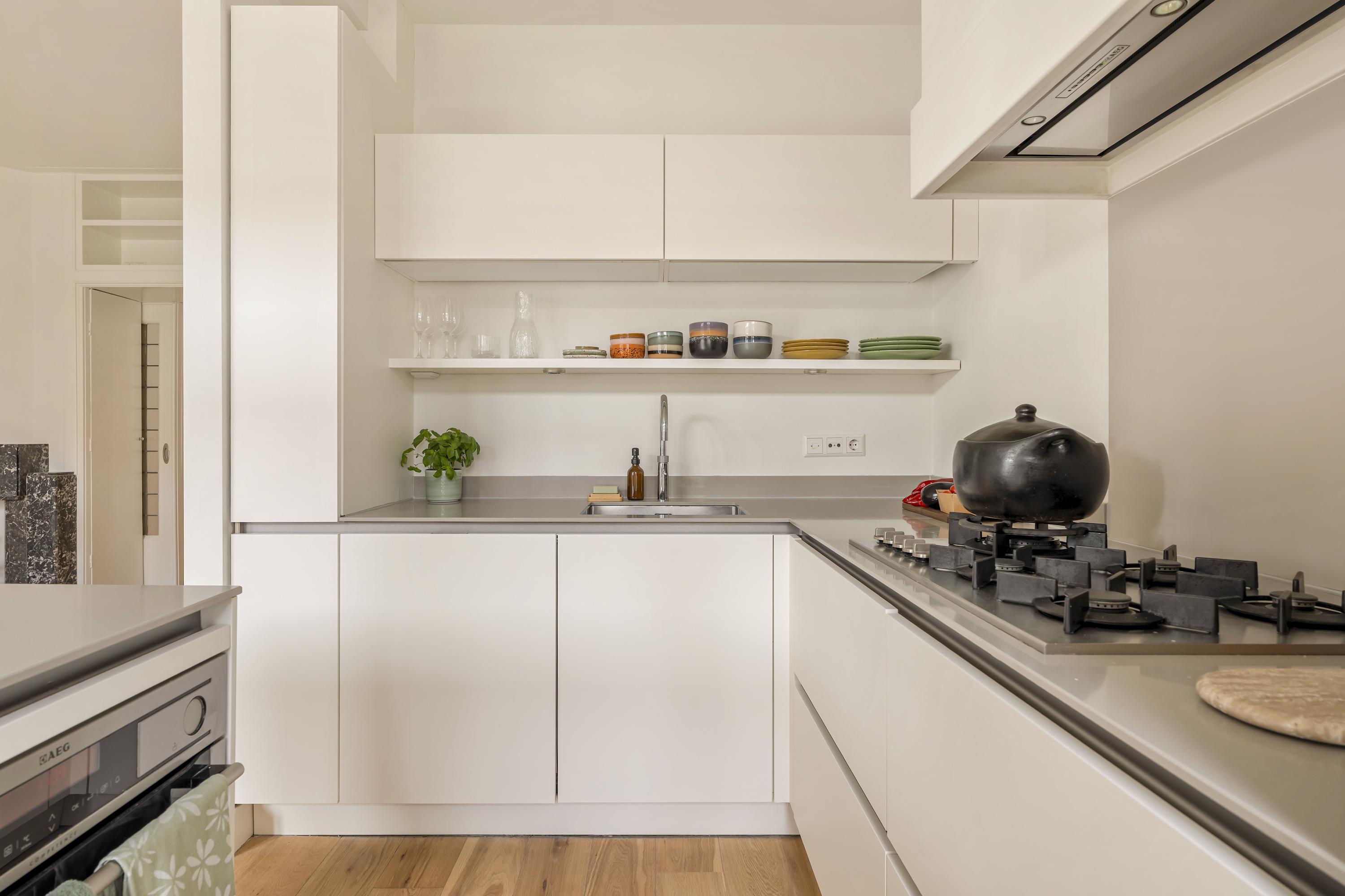 De keuken is uitgevoerd in een tijdloze opstelling en voorzien van diverse inbouwapparatuur, waaronder een 5-pits gasfornuis, oven met stoomfunctie, Quooker, vaatwasser en een koel-/vriescombinatie. Daarnaast is er veel opbergruimte aanwezig. Vanuit zowel de keuken als de eetkamer is middels openslaande deuren toegang tot het balkon aan de achterzijde.
