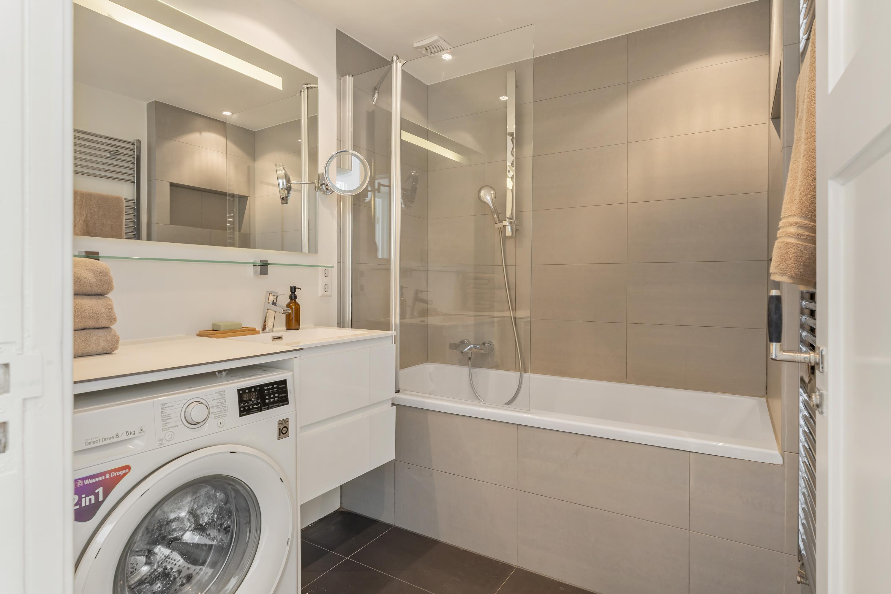 De badkamer is centraal in de woning gelegen en voorzien van een ligbad met douche, een dubbele wastafel en een spiegel met verwarming. Het separate toilet is bereikbaar vanuit de hal.