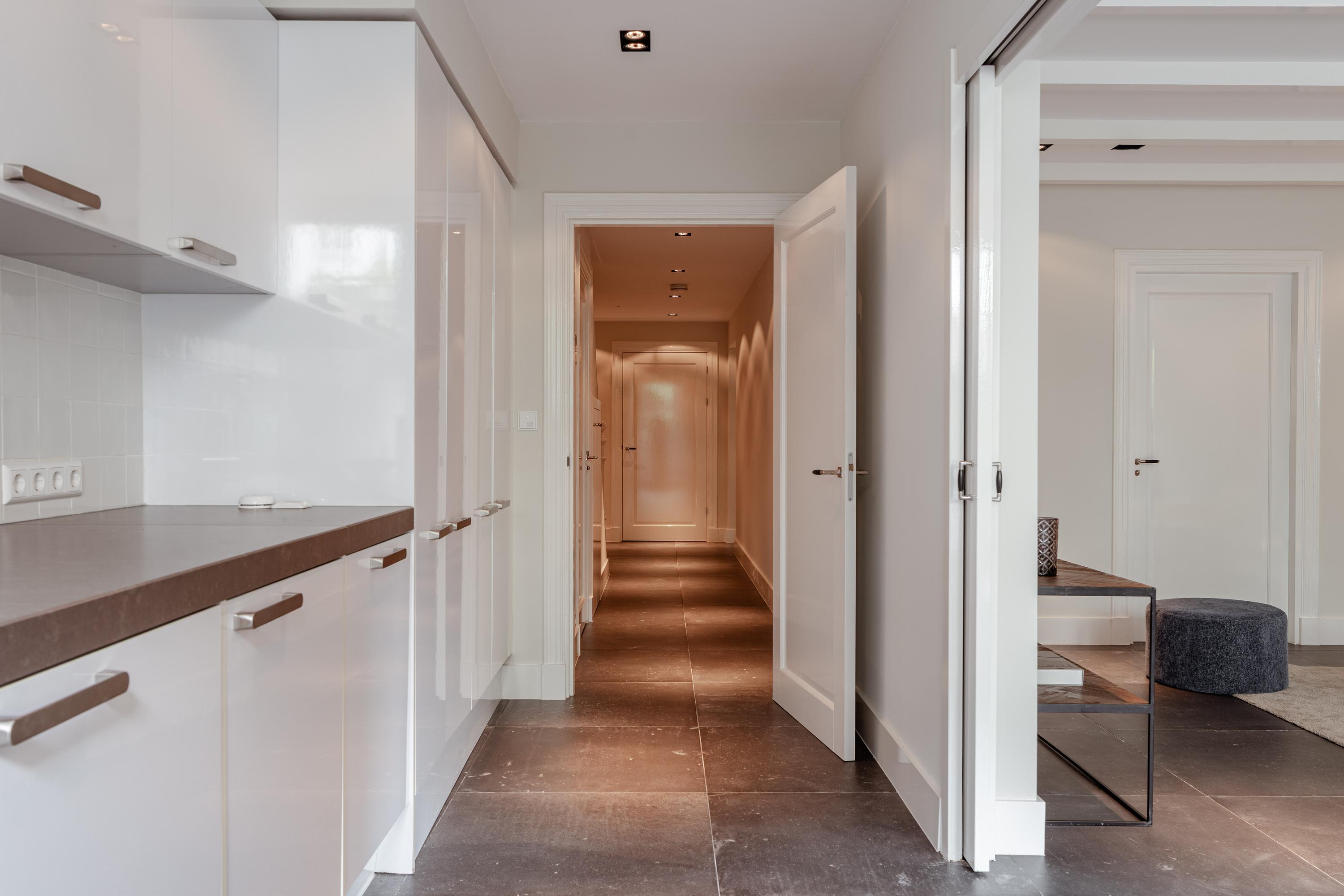 Middels de lift of de eigen entree op de eerste verdieping bereikt u de indrukwekkende leefverdieping. Hier valt direct de royale woonkamer op, met grote raampartijen welke zorgen voor een overvloed aan licht en een verfijnde sfeer. Aan de voorzijde bevindt zich de luxe woonkeuken, een absolute eyecatcher, voorzien van een royaal kookeiland met wijnklimaatkast, dubbele spoelbak met Quooker en hoogwaardige inbouwapparatuur: twee ovens, een volledige koelkast en een aparte vriezer. Deze keuken biedt alles voor de echte culinaire liefhebber en vormt het hart van de woning. Vanuit hier heeft u toegang tot het balkon met karakteristieke glas-in-loodramen, ideaal voor een ontspannen ontbijt in de ochtendzon. Op deze verdieping zijn tevens een garderoberuimte en separaat toilet te vinden.