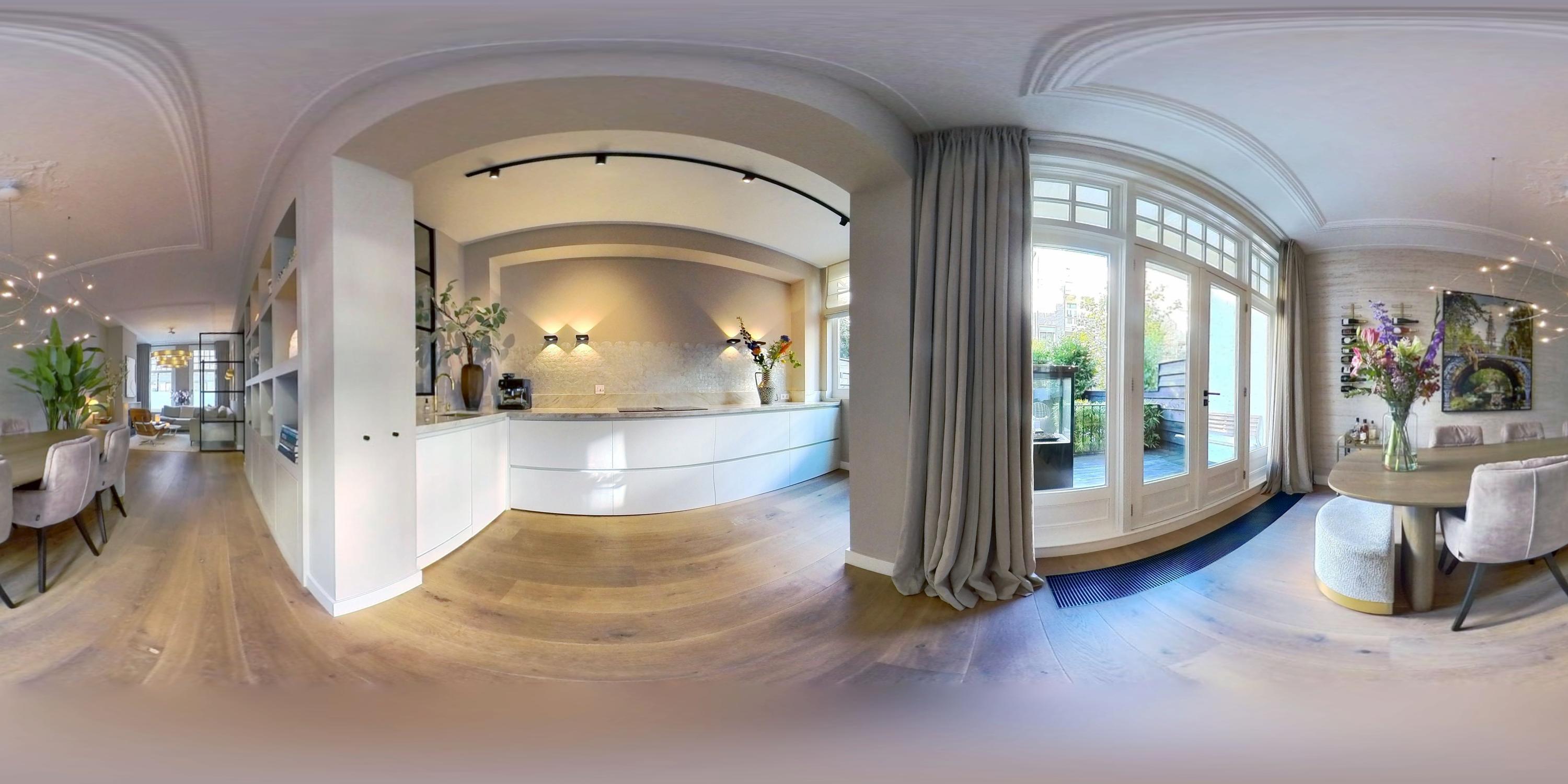 Middels de eigen entree bereikt u het tochtportaal en de hal, welke toegang biedt tot de vertrekken op de begane grond. Hier bevindt zich een separaat toilet met fontein en een praktische bergkast met toegang naar de kelder, bestaande uit twee goed bruikbare ruimtes, ideaal als opslag, hobbyruimte of wijnkelder. De royale woonkamer strekt zich uit over de volledige lengte van de woning en wordt betreden middels een stijlvolle stalen look deure. Dankzij het hoge plafond en grote raampartijen is de living bijzonder licht, met aan de voorzijde ruimte voor een comfortabele zithoek met gashaard en aan de achterzijde plek voor een ruime eettafel. De moderne keuken is gelegen aan de achterzijde en is uitgerust met een inductiekookplaat met ingebouwde afzuiging, ijskast, vriezer, oven, combi-oven, vaatwasser en een spoelbak met Quooker-kraan. Zowel vanuit de keuken als vanuit de eetkamer bereikt u middels openslaande deuren het terras. Vanaf het terras leidt een trap naar de royale achtertuin: een heerlijke plek met volop ruimte voor loungesets, een eettafel en een veilige speelplek voor kinderen.