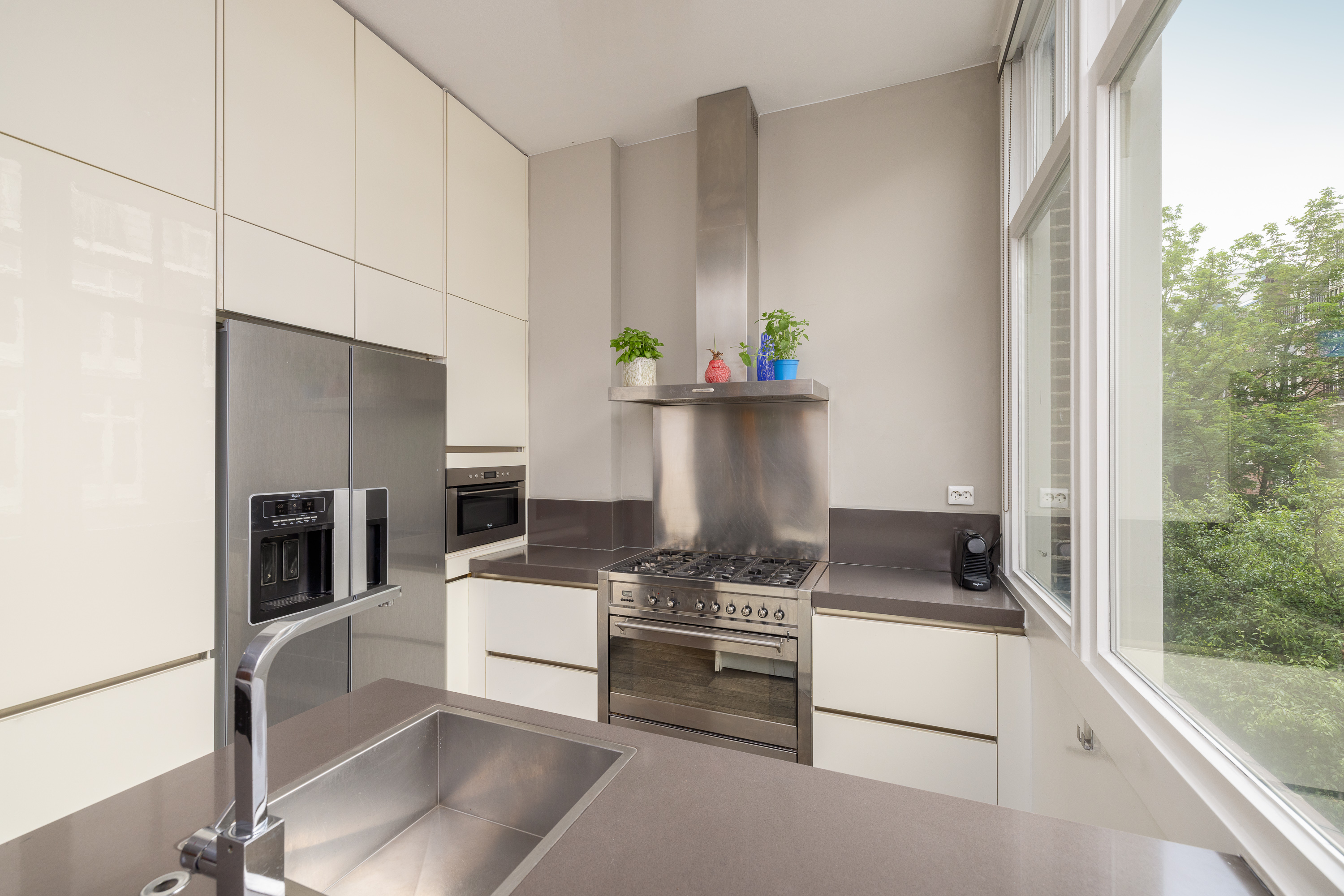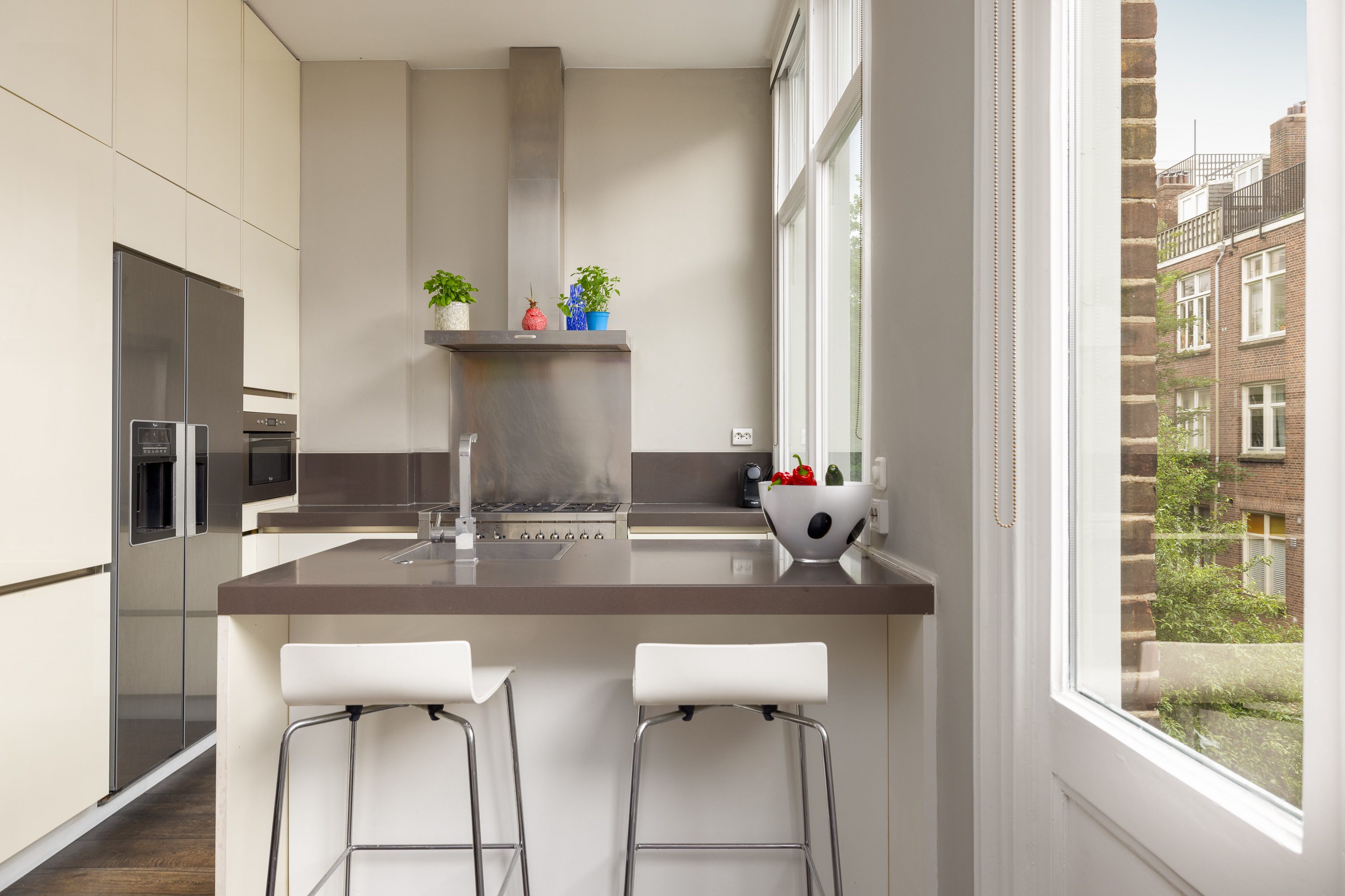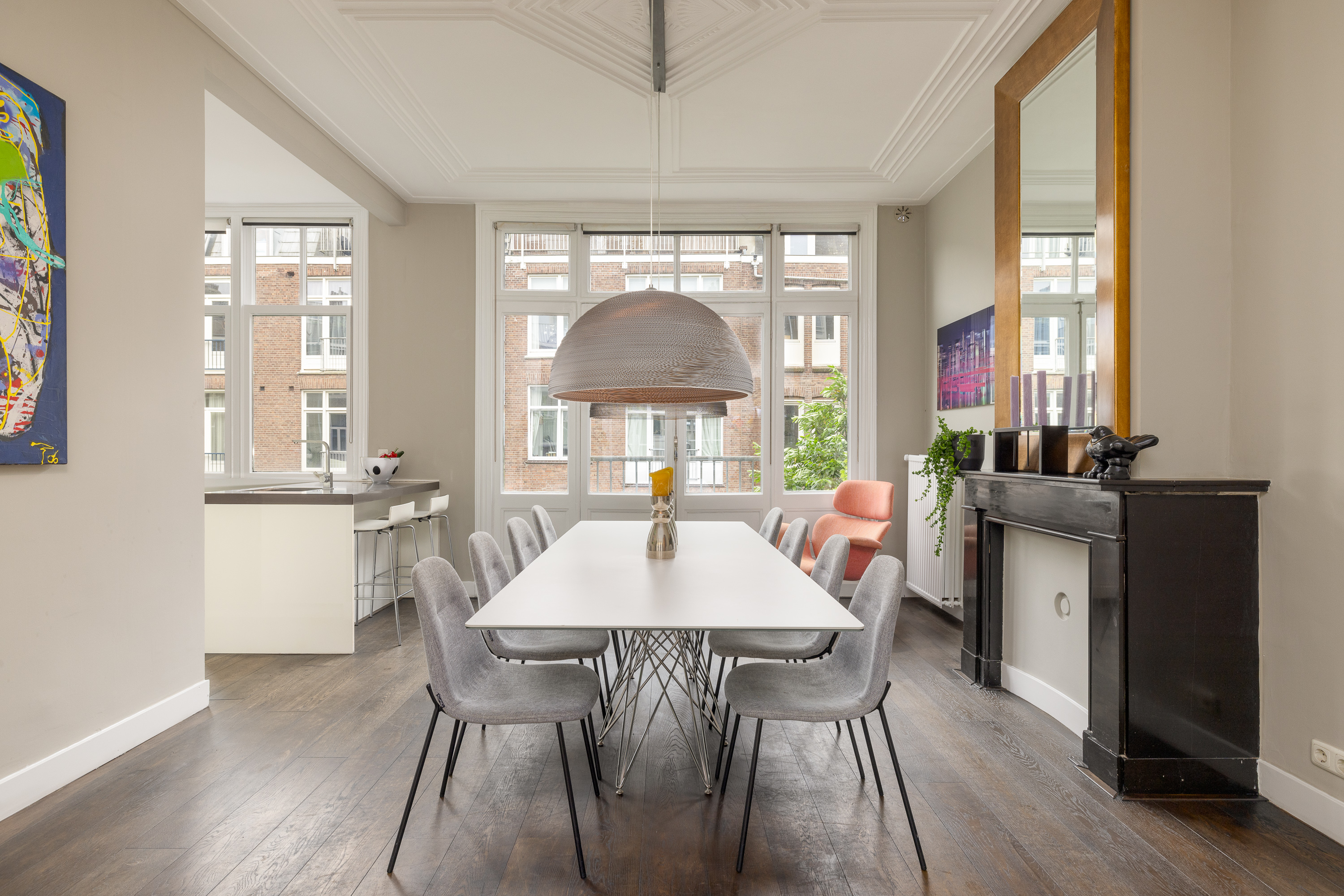 Aan de achterzijde van de woning bevindt zich de eetruimte, open keuken met eiland, en een Frans balkon. De keuken is uitgerust met een 5-pits gasfornuis, oven, magnetron en een koel-/vriescombinatie. Door de overvloed aan glas en de plafondhoogte van 3.07 meter, is deze verdieping bijzonder licht en ruimtelijk.