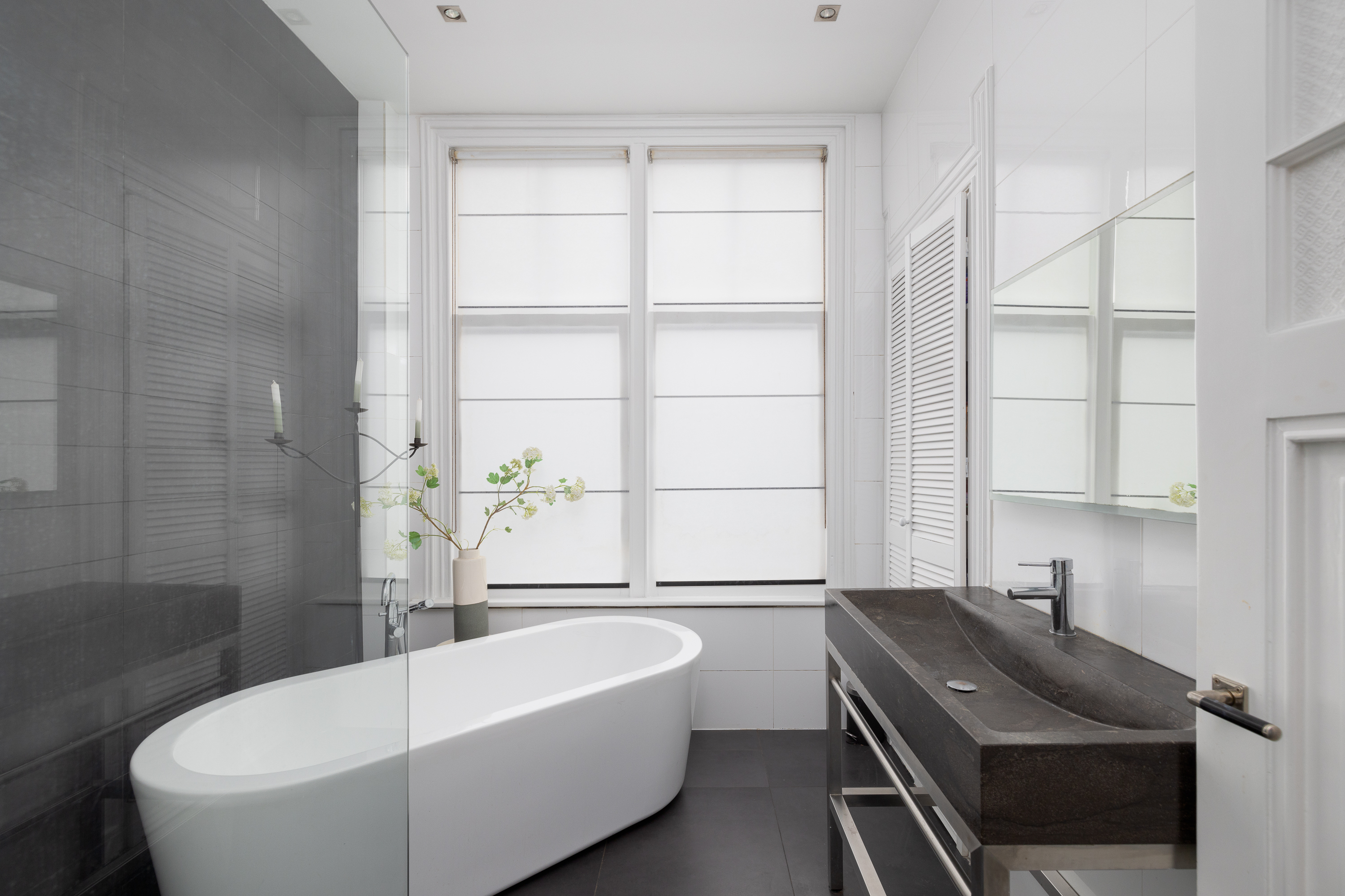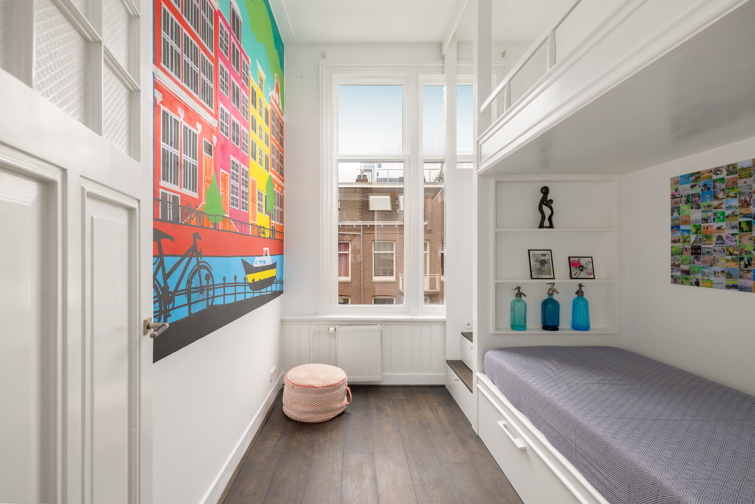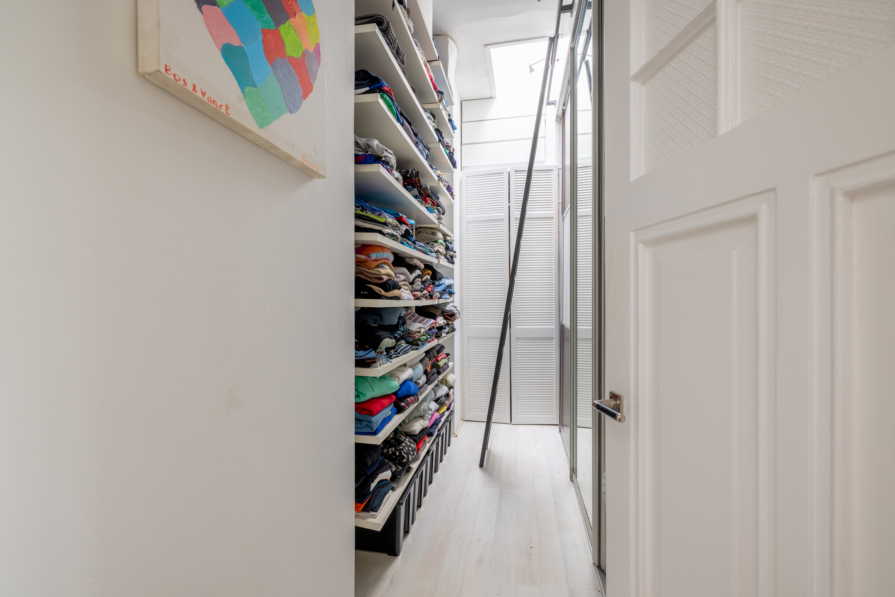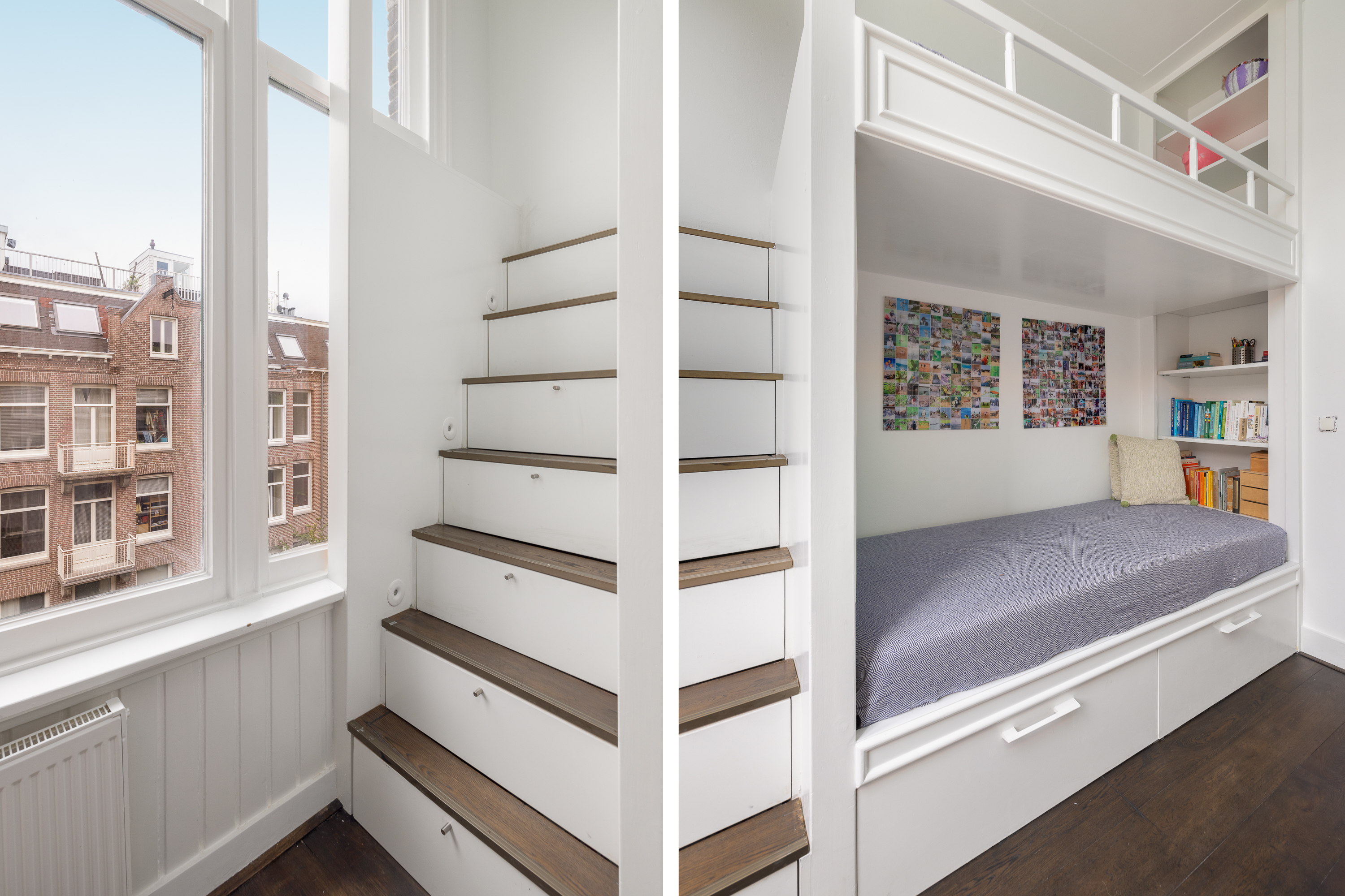 Overloop. Hier treft u ook een separaat toilet met fontein. Aan de achterzijde bevindt zich een goed bemeten slaapkamer met twee inbouwkasten en grote raampartijen. De badkamer beschikt over een ruim ligbad, inloopdouche, brede wastafel met spiegel en een inbouwkast die toegang biedt tot de slaapkamer aan de achterzijde van de woning. Aan de voorzijde van de woning bevinden zich twee slaapkamers. De ene slaapkamer biedt ruimte voor een King-size bed met inbouwkast en de andere slaapkamer beschikt over een praktisch en gezellig op maat gemaakt stapelbed met ruime lades zowel onder het bed als in de trap van het bed. Deze functioneren ook als trap, om het bovenste bed te bereiken. Het onderste bed is gemakkelijk weg te halen zodat een hoogslaper overblijft. Centraal gelegen op deze verdieping vindt u ook een erg ruime inloopkast, die tevens ook in te richten is als werkkamer.