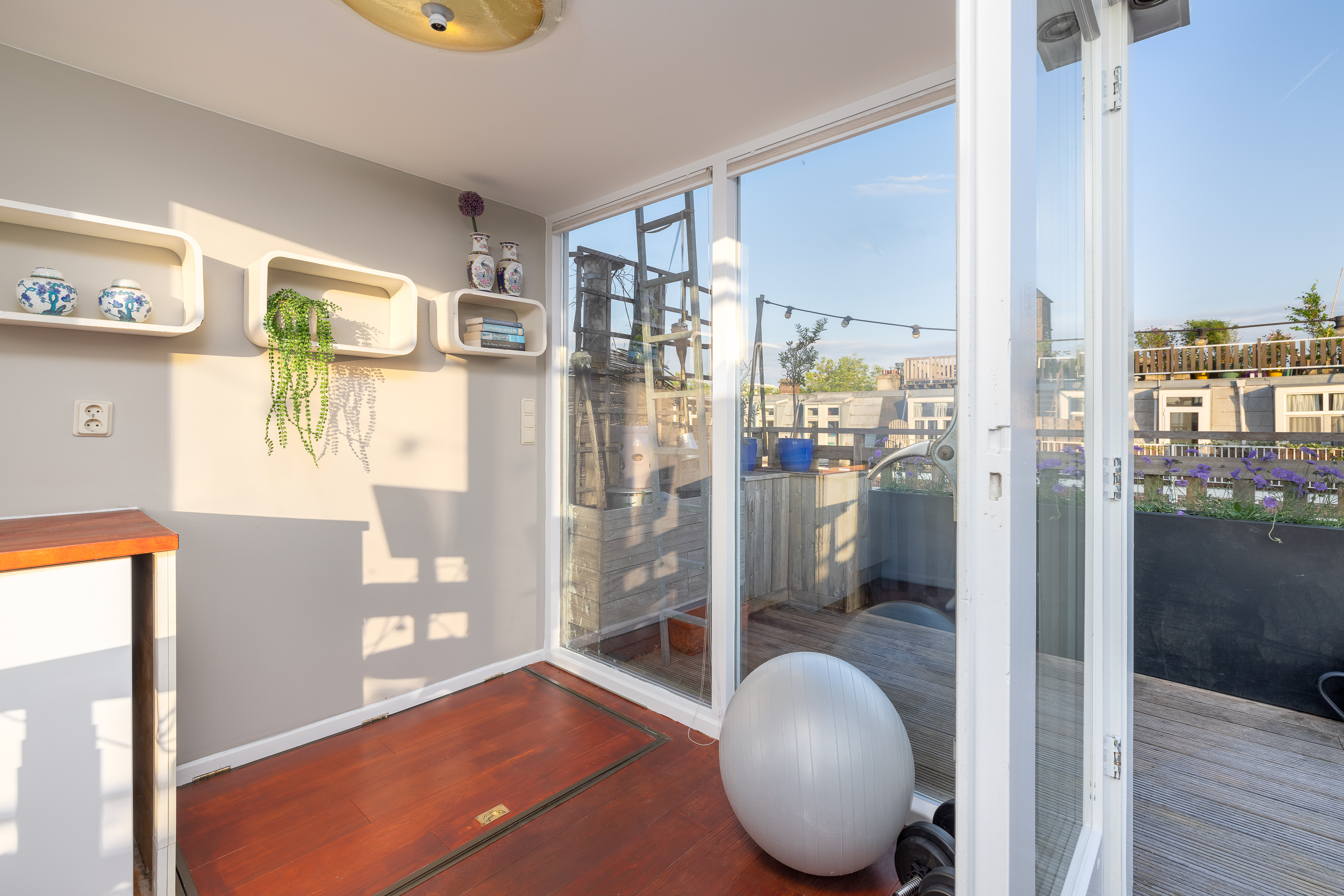 Hier krijgt u toegang tot het zeer ruime, gezellige en fraai afgewerkte dakterras. Op deze verdieping heeft u ook een wastafel en koeling tot uw beschikking. Handig is ook dat de toegang naar het dakhuis kan worden afgesloten, waardoor een fijne ruimte ontstaat van circa 6m². Kortom, genoeg ruimte voor het creëren van een home gym, bijvoorbeeld voor het beoefenen van yoga, of een heerlijke thuiswerkplek.