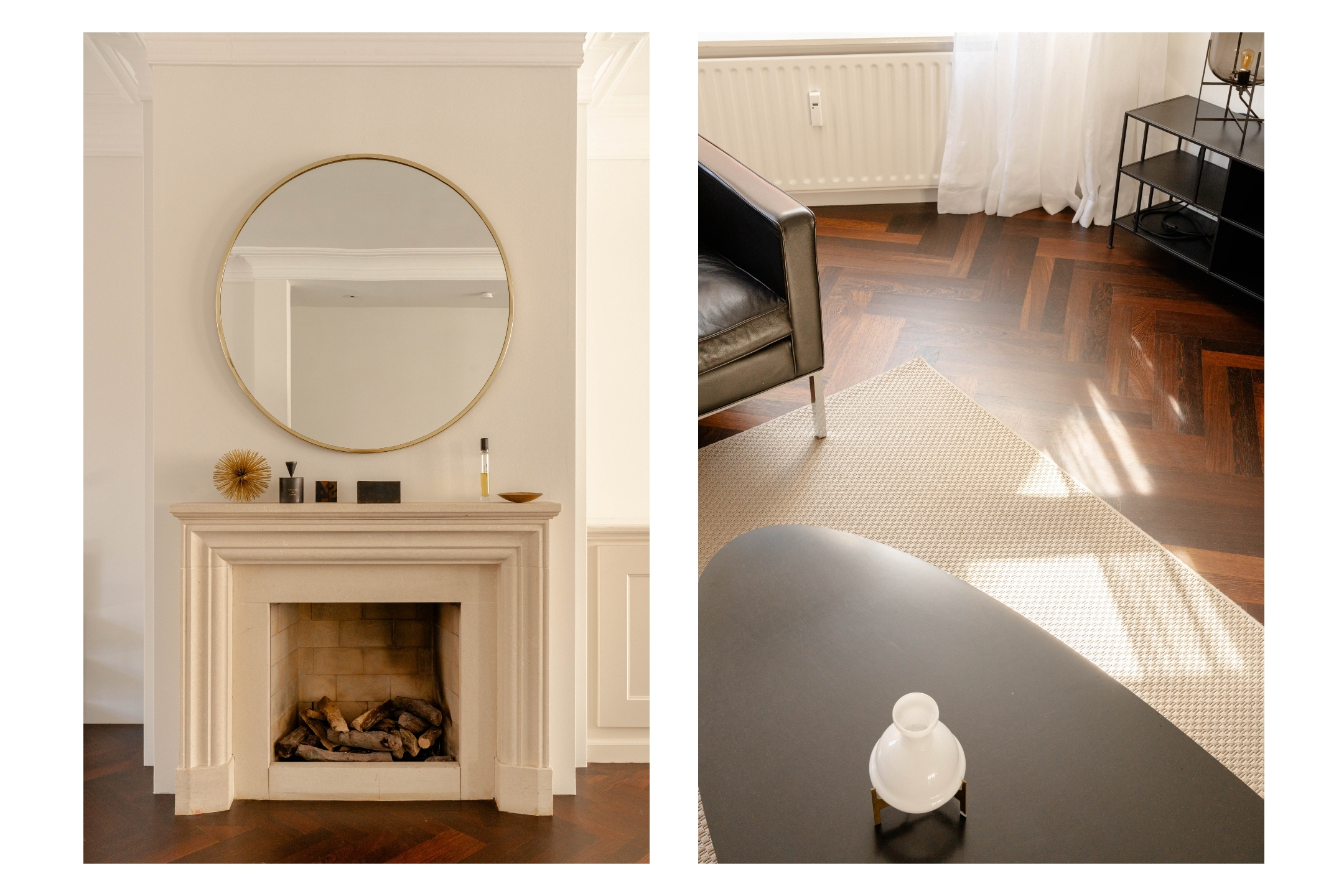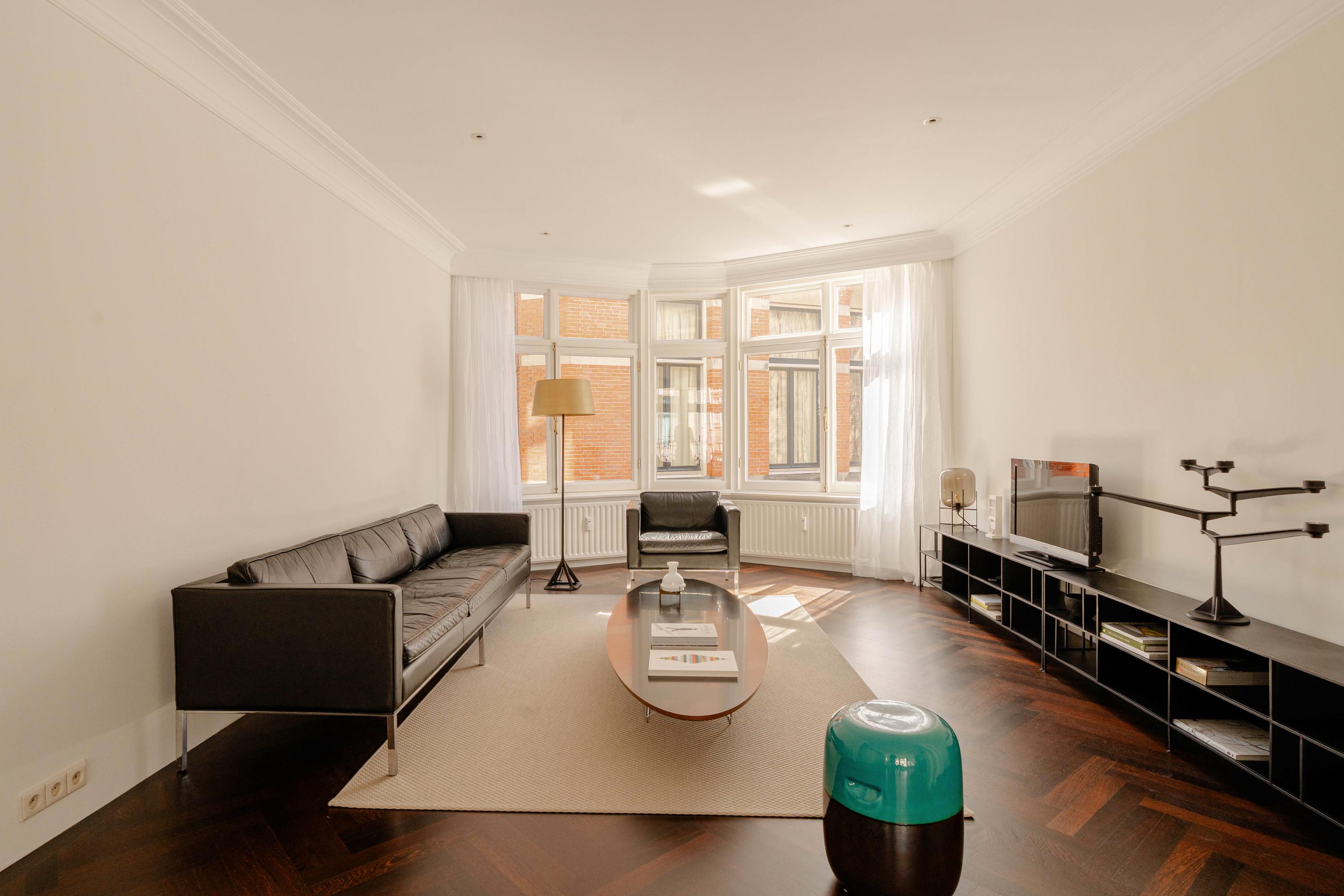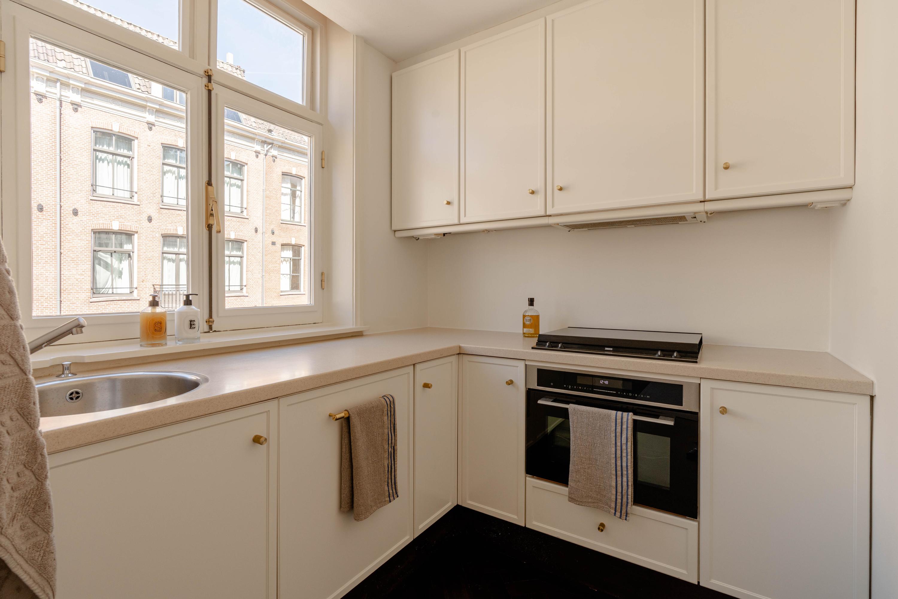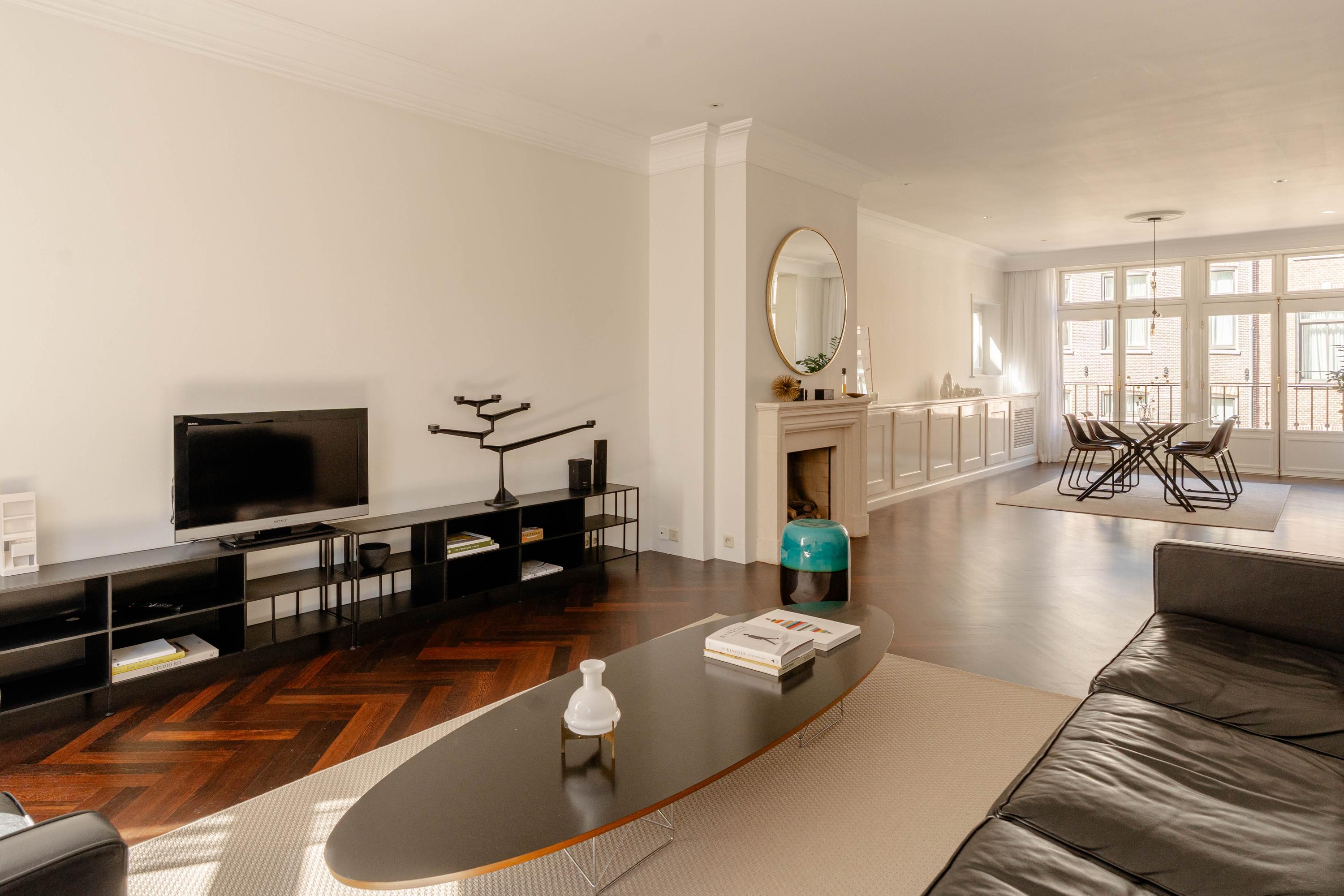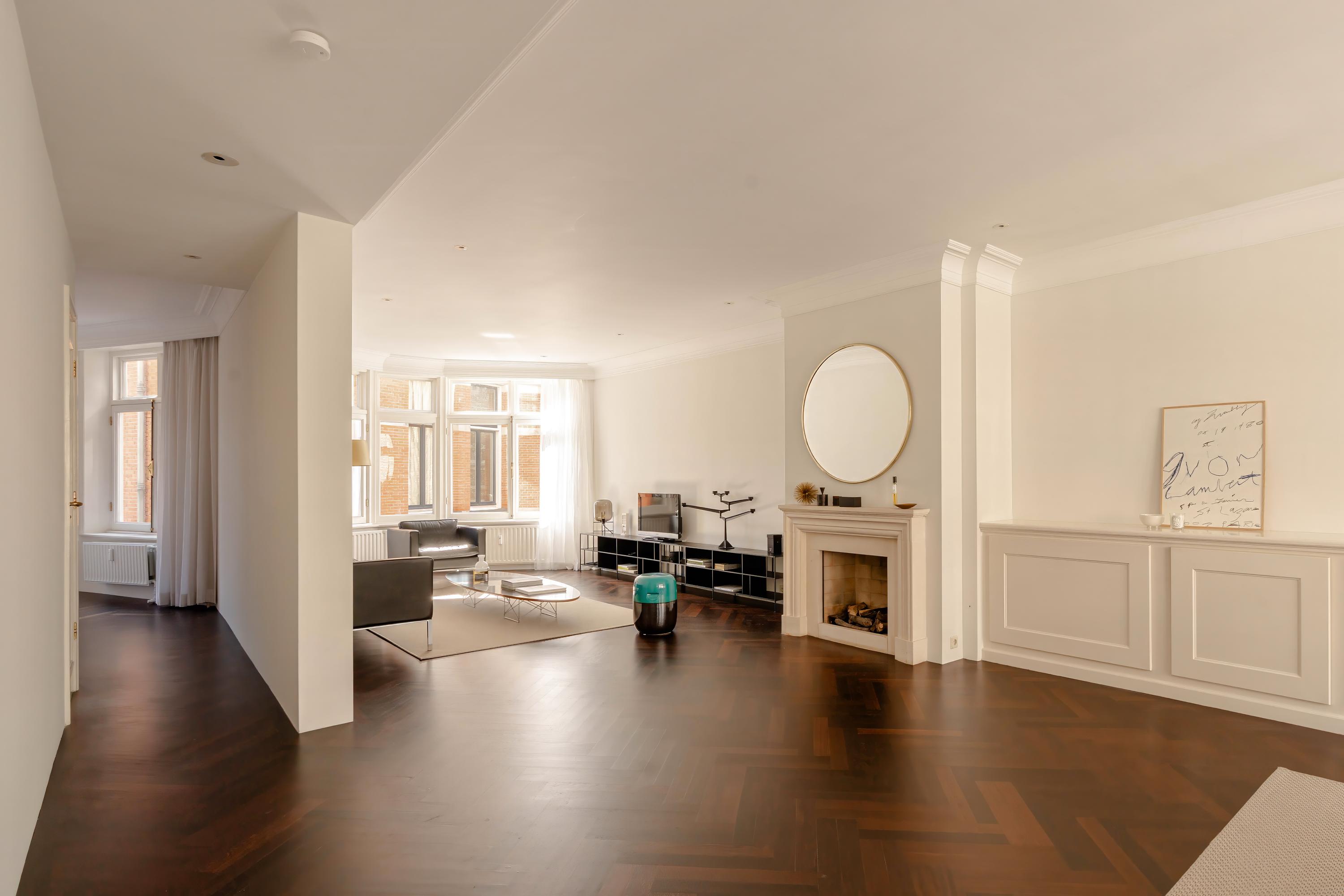 De woonkamer kenmerkt zich door authentieke details, zoals sierlijsten, een open haard met klassieke schouw, een fraaie wengéhouten visgraadvloer en stijlvolle lambrisering. De openslaande deuren naar het Frans balkon zorgen voor een prettige verbinding met buiten. De open keuken is functioneel ingericht en voorzien van diverse inbouwapparatuur en voldoende bergruimte.