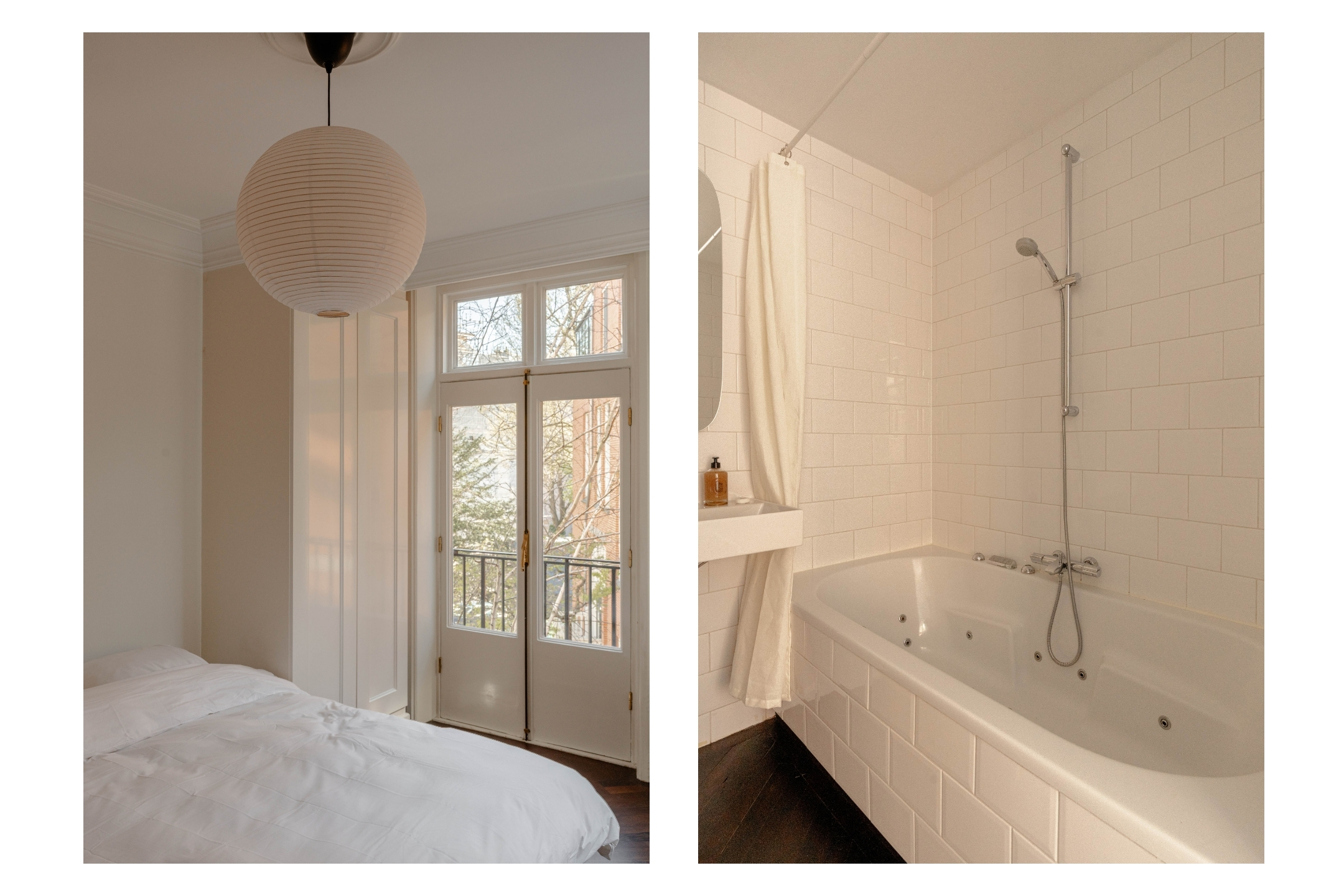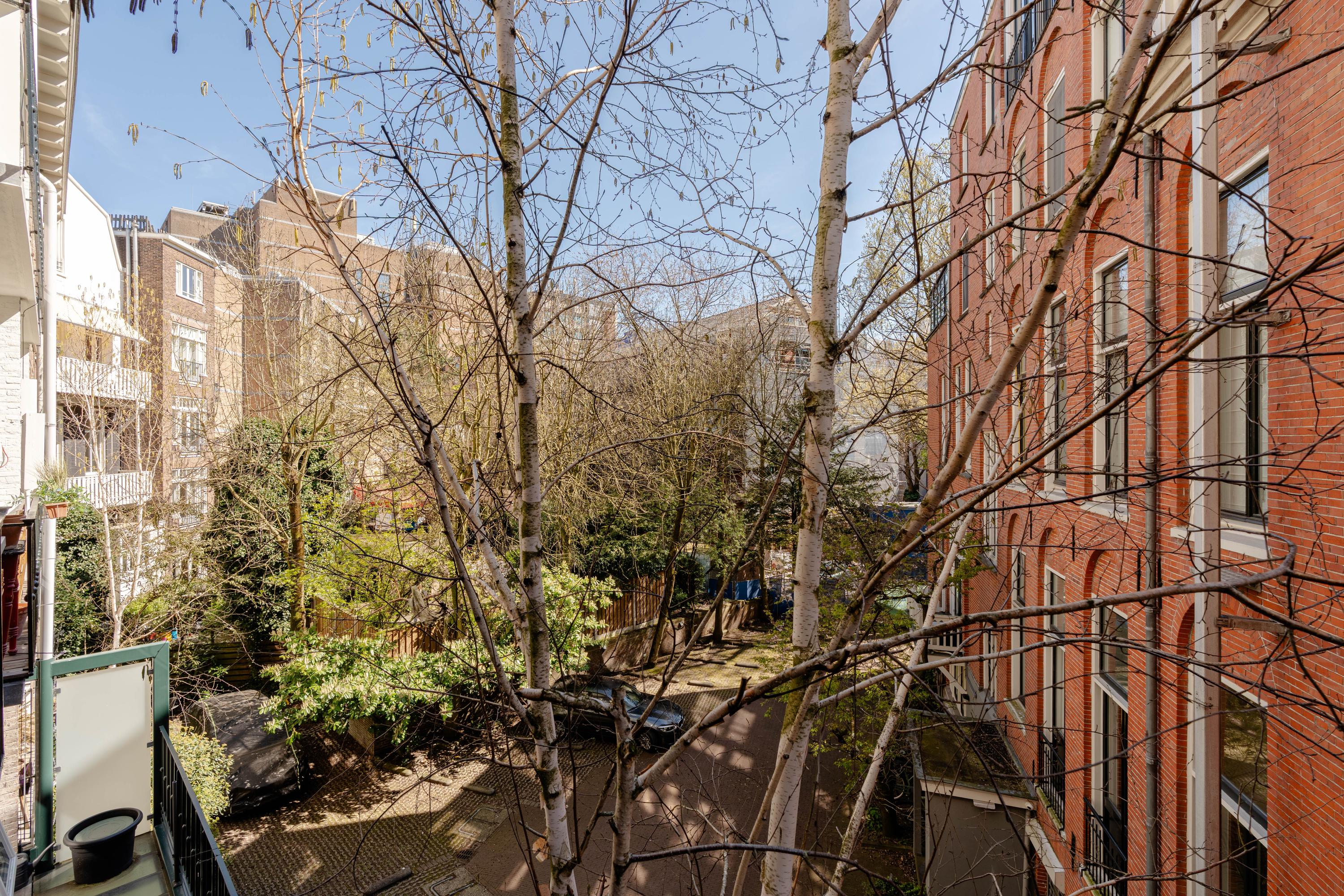 Aan de achterzijde ligt de ruime slaapkamer, eveneens met openslaande deuren naar een Frans balkon en praktische inbouwkasten. De en-suite badkamer beschikt over een ligbad en wastafel. Het separate toilet is bereikbaar vanuit de living.