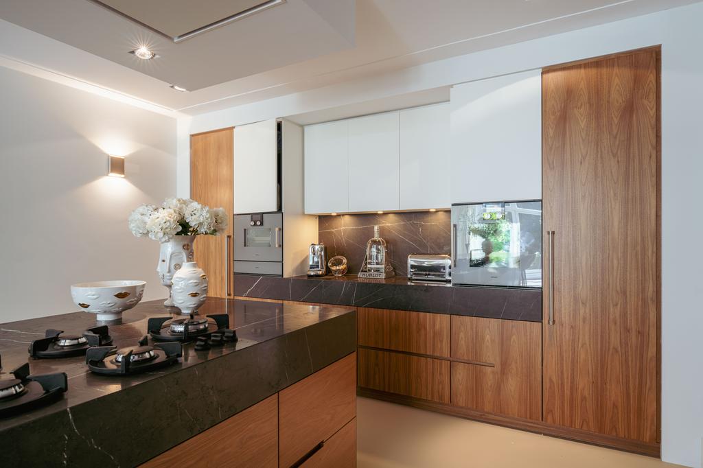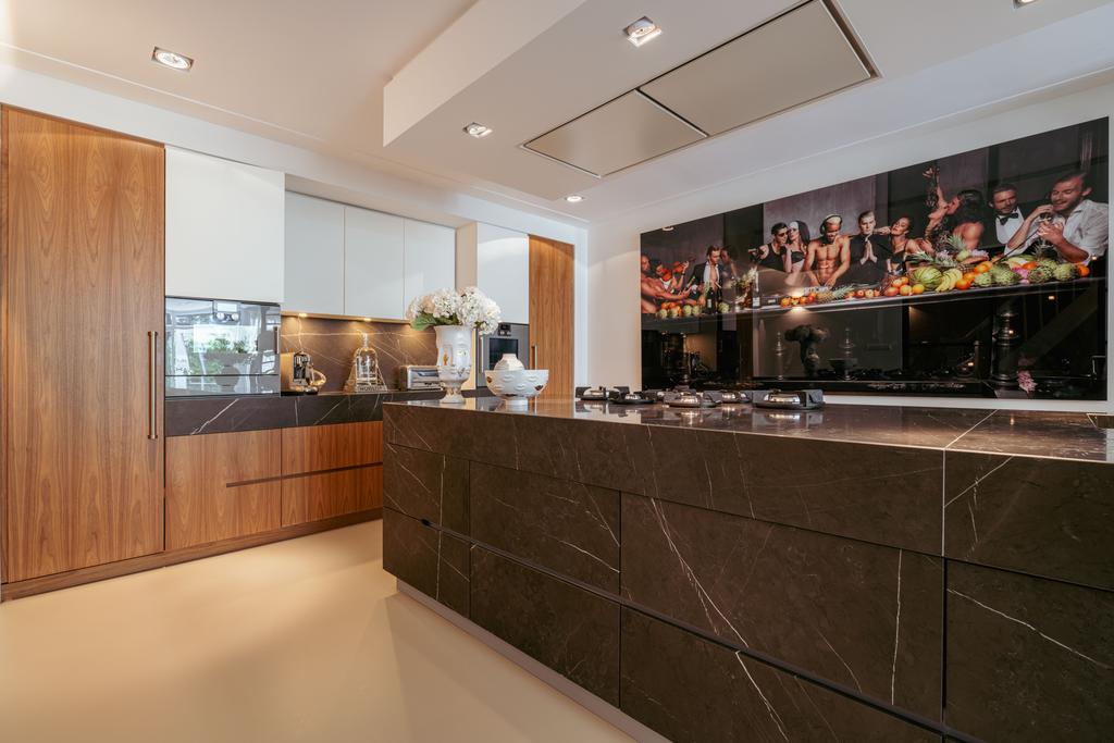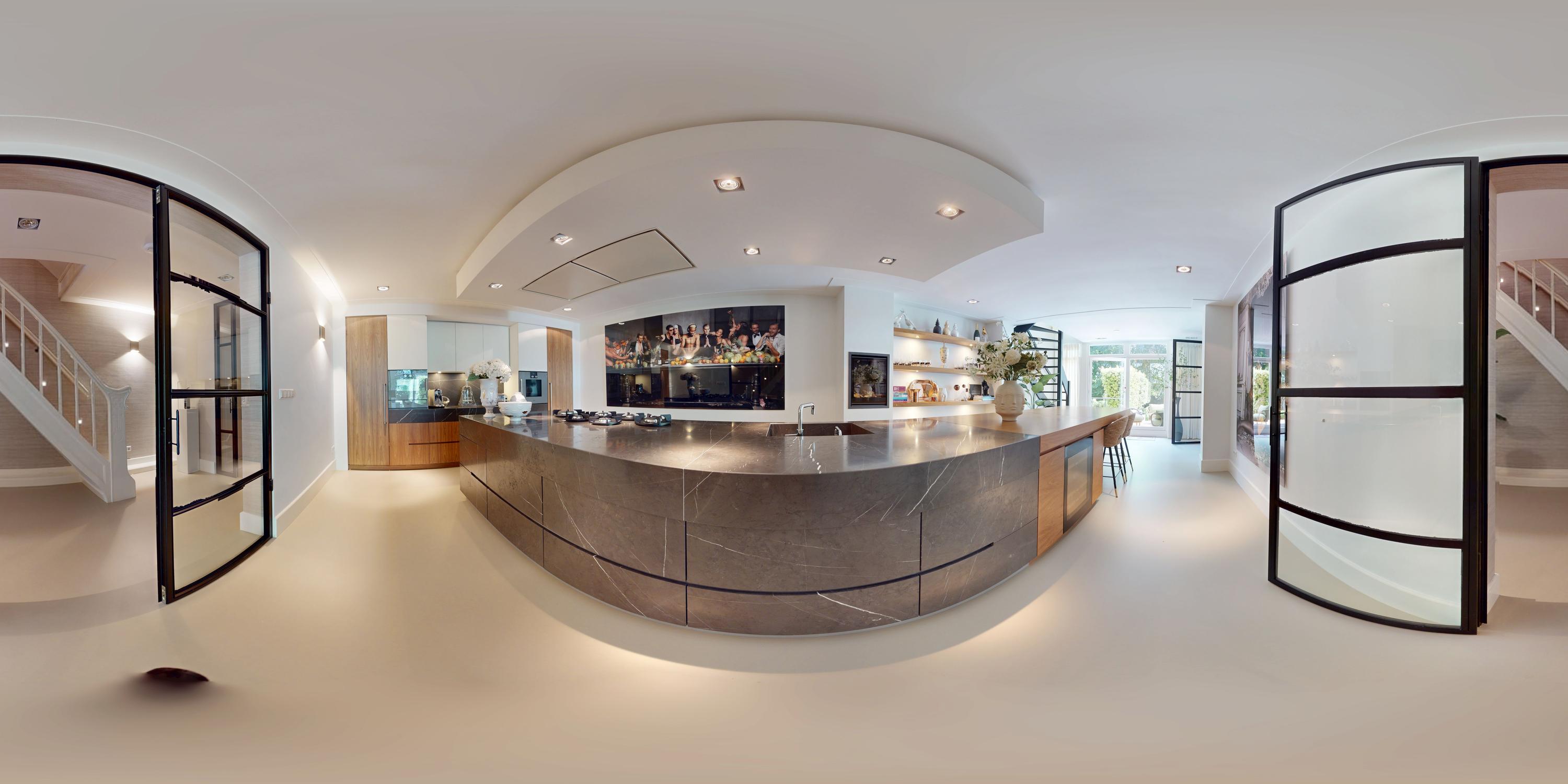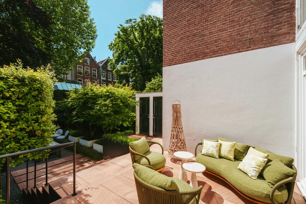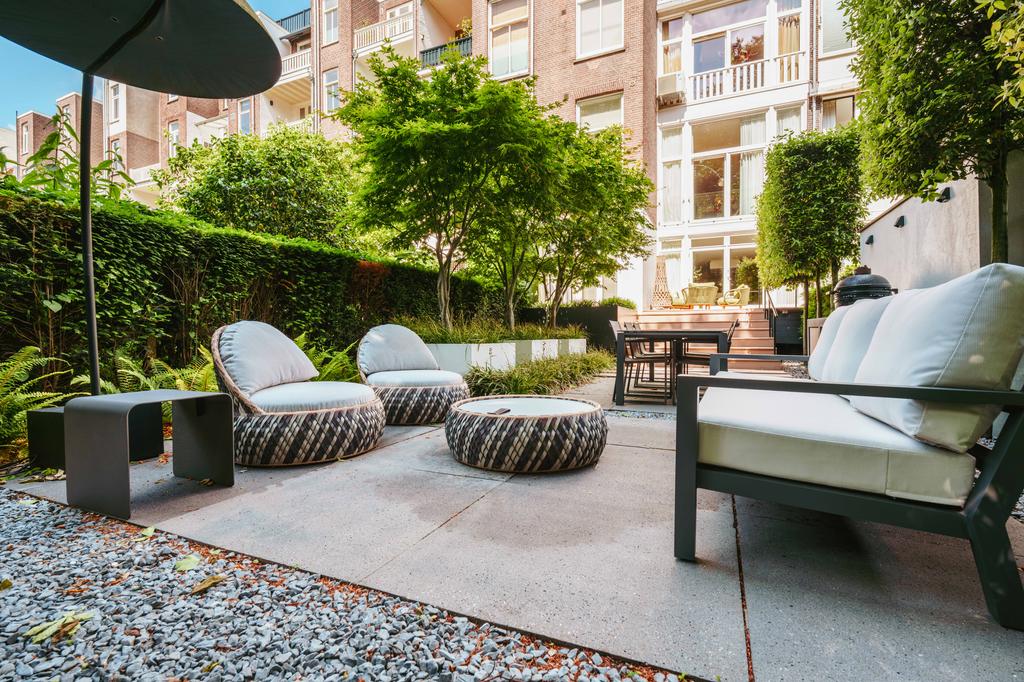 De woning is toegankelijk zowel vanaf de bel-etage als vanuit het souterrain, dat bereikbaar is via de trap of lift vanuit de hal of direct vanuit de bovengelegen eetkamer. Bij binnenkomst op deze verdieping treedt u de hal binnen, waar zich een separaat toilet bevindt. Aan de voorzijde ligt een slaapkamer met een en-suite badkamer, voorzien van een wastafel en douche. Deze multifunctionele ruimte wordt momenteel gebruikt als gym, maar is flexibel inzetbaar. De luxe uitgevoerde open woonkeuken bevindt zich aan de achterzijde en vormt het kloppend hart van deze verdieping. De keuken is uitgerust met hoogwaardige inbouwapparatuur van het merk Gaggenau, waaronder een koelkast, vriezer, Quooker, vijfpits gasfornuis geïntegreerd in het aanrecht, oven, stoomoven, vaatwasser en wijnklimaatkast. Het massief natuurstenen aanrechtblad in combinatie met het houten bargedeelte zorgt voor een warme, stijlvolle uitstraling. De keuken beschikt bovendien over bijzonder veel opbergruimte en is toegankelijk vanuit de eetkamer op de bel-etage of via openslaande deuren vanuit de hal. Een sfeervolle gashaard maakt de ruimte helemaal af. Aangrenzend aan de keuken bevindt zich een slaapkamer – momenteel in gebruik als werkkamer – die, net als de keuken, via openslaande deuren directe toegang biedt tot het ruime terras. Dit terras leidt via een trap naar de fraai aangelegde, op het zuiden gelegen achtertuin, die ook bereikbaar is via een achterom aan het Schapenburgerpad. Deze toegang biedt de zeldzame mogelijkheid om de achtertuin te betreden en bijvoorbeeld fietsen direct in de tuin te plaatsen, uniek in het centrum van Amsterdam. De tuin, onder architectuur aangelegd door Erik van Gelder, beschikt over een complete buitenkeuken, ideaal voor lange zomeravonden, en is ook voorzien van een vrijstaande berging. Hier geniet u in alle rust van zon en privacy, tot in de late uurtjes.
