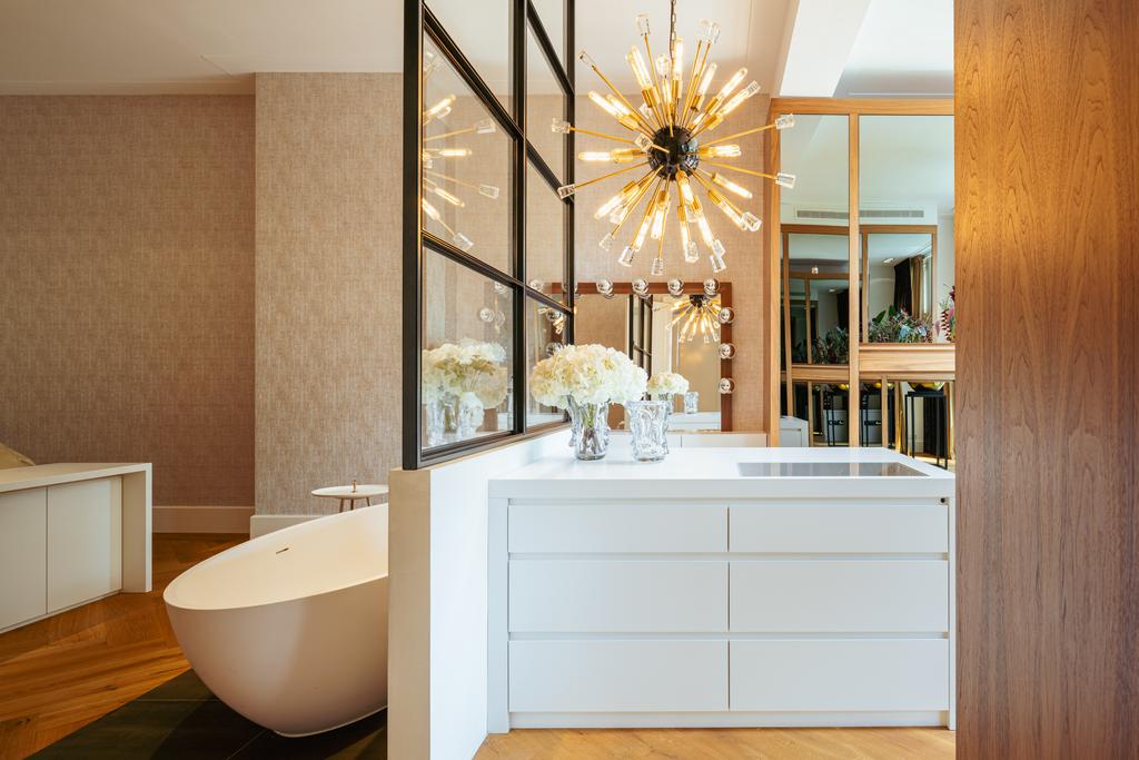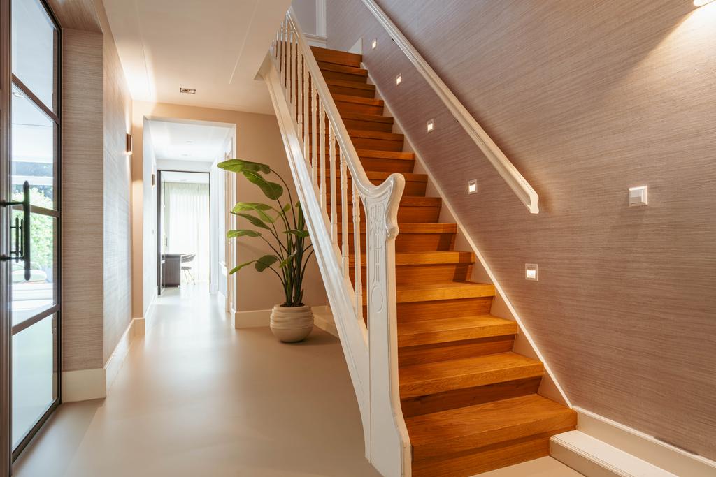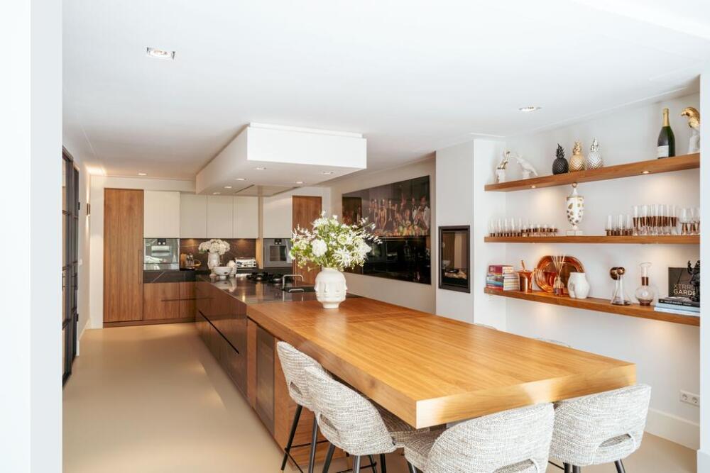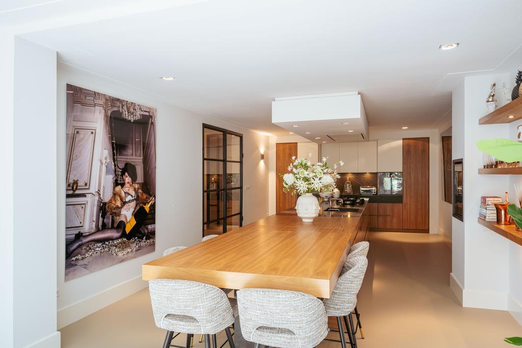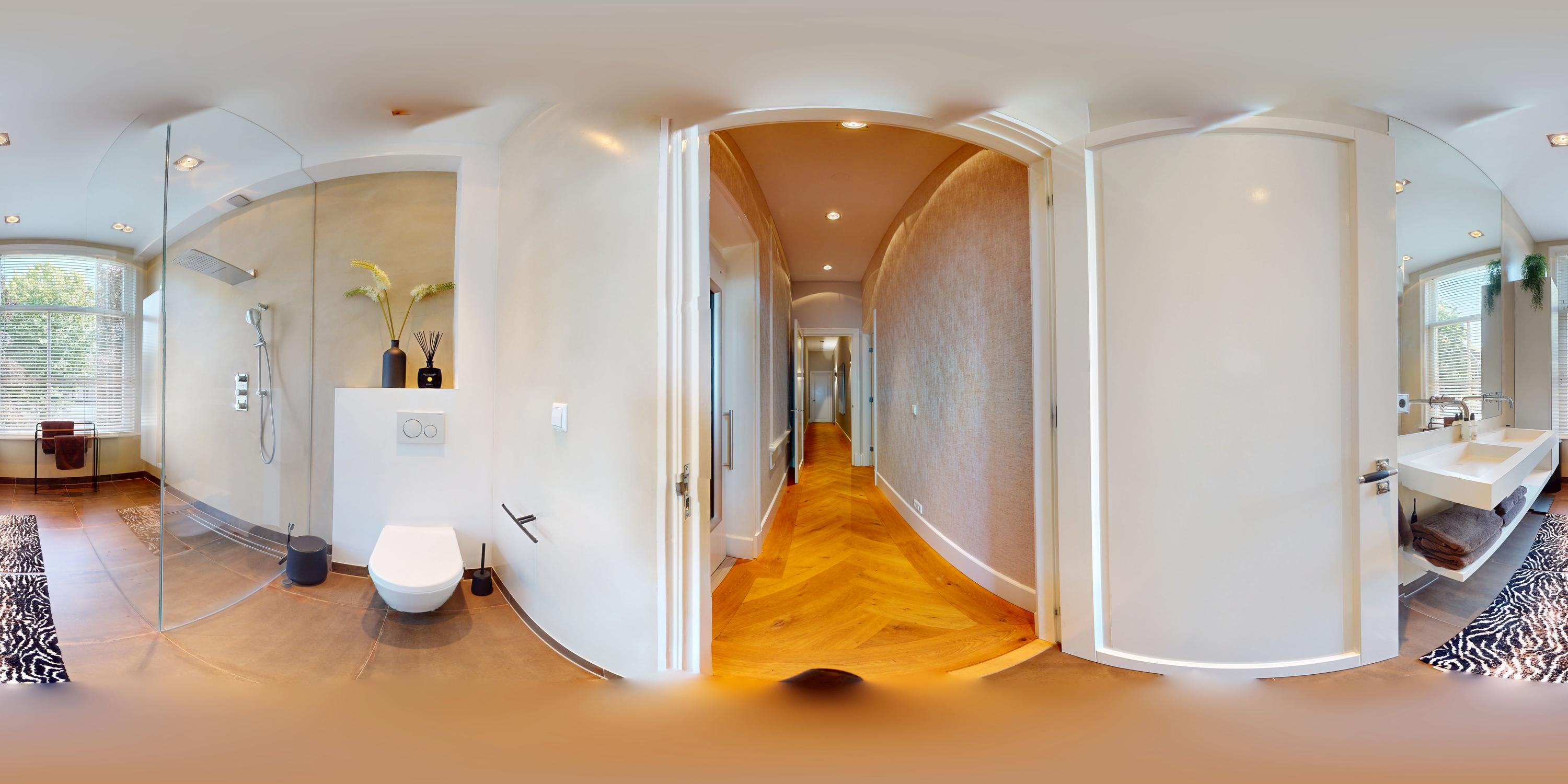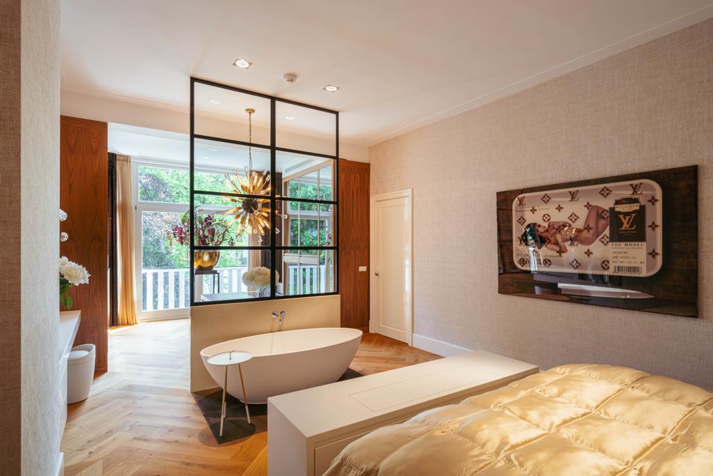 De gehele verdieping is hoogwaardig afgewerkt met stijlvol en sfeervol behang, wat de ruimte warmte en karakter geeft. Grote raampartijen aan beide zijden van de verdieping zorgen voor een uitzonderlijke hoeveelheid daglicht en benadrukken de ruimtelijkheid en luxe van het geheel.