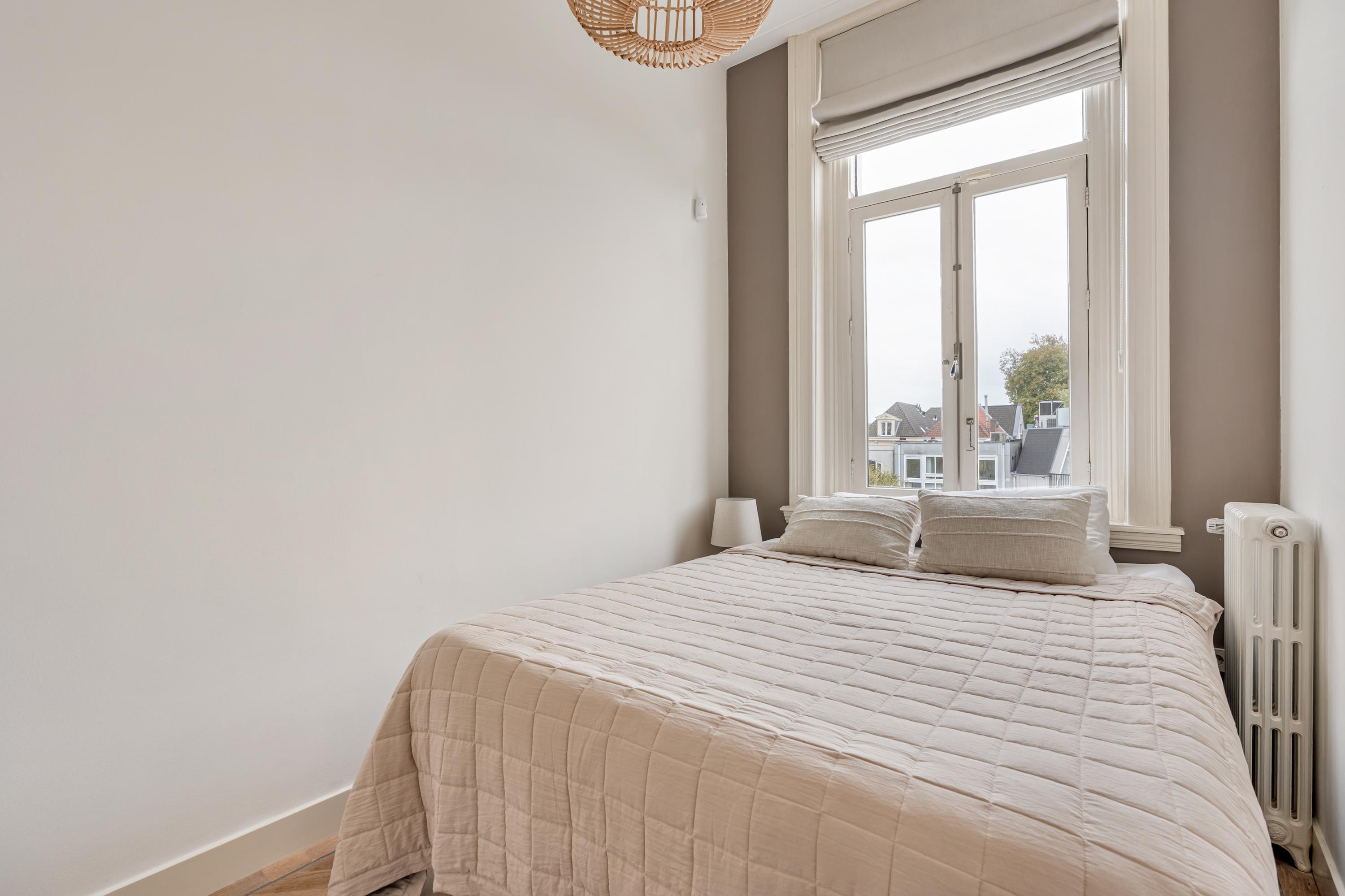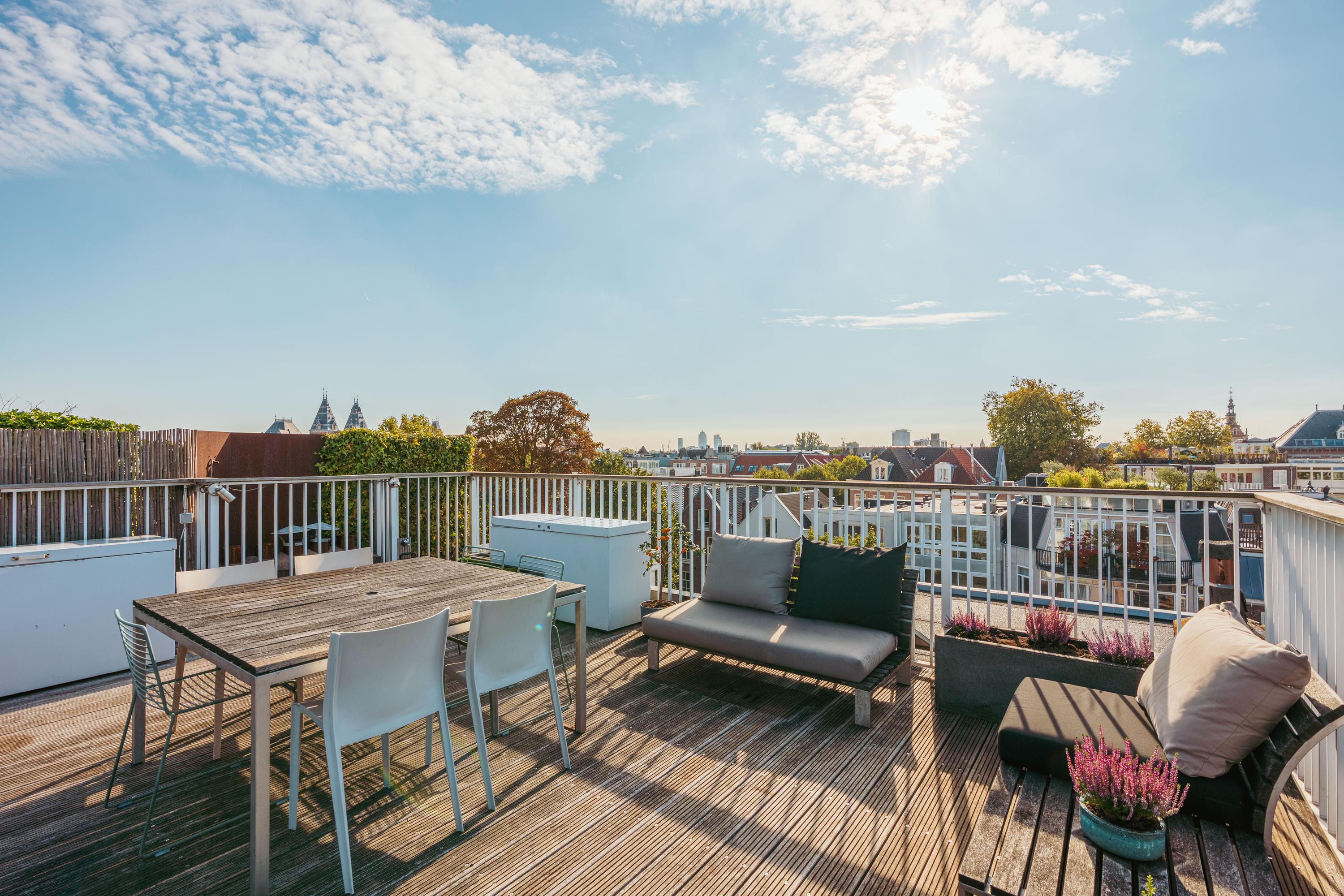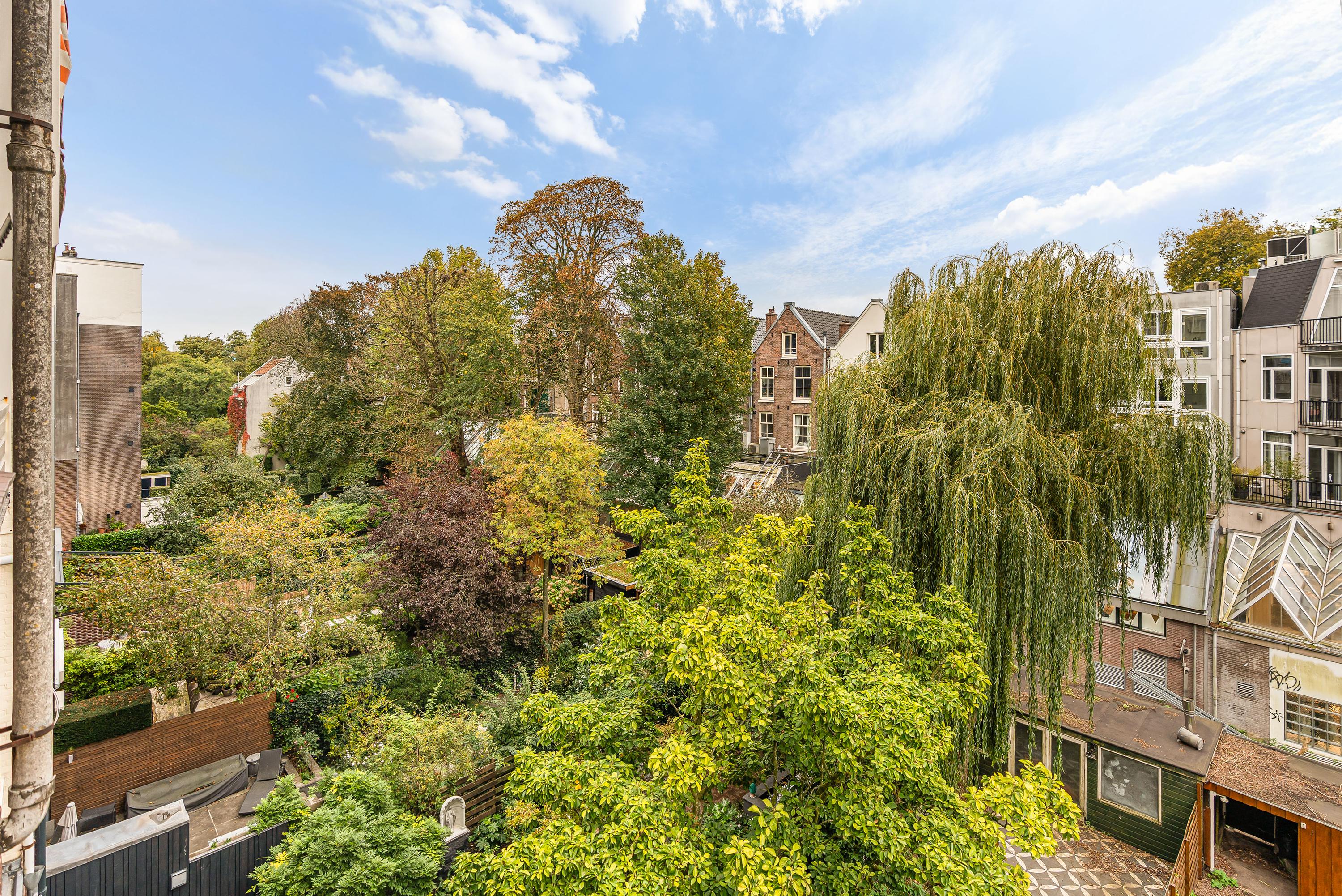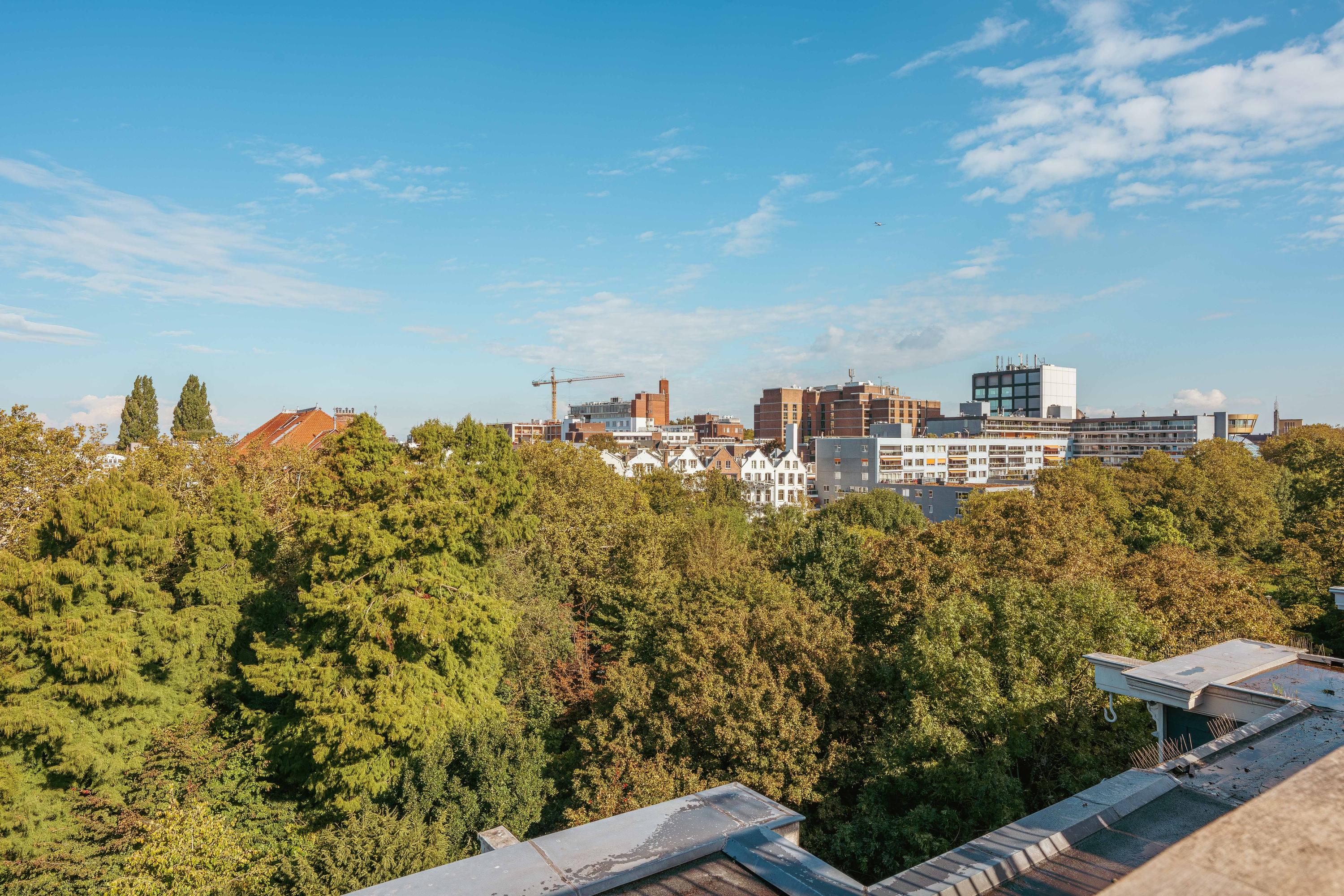 De grote raampartijen aan zowel de voor- als achterzijde van de woning zorgen voor een overvloed aan licht en een open, uitnodigende sfeer. Aan de voorzijde heeft u een uniek uitzicht over het groen van het Vondelpark, terwijl u aan de achterzijde uitkijkt over de weelderige binnentuinen. Elk seizoen kleurt het uitzicht anders en geeft de woning een nieuw karakter. Het ruime balkon en het dakterras bieden volop zon en privacy ,de ideale plekken om buiten te ontbijten, te ontspannen met een boek of te genieten van lange, zwoele zomeravonden met uitzicht over de stad.