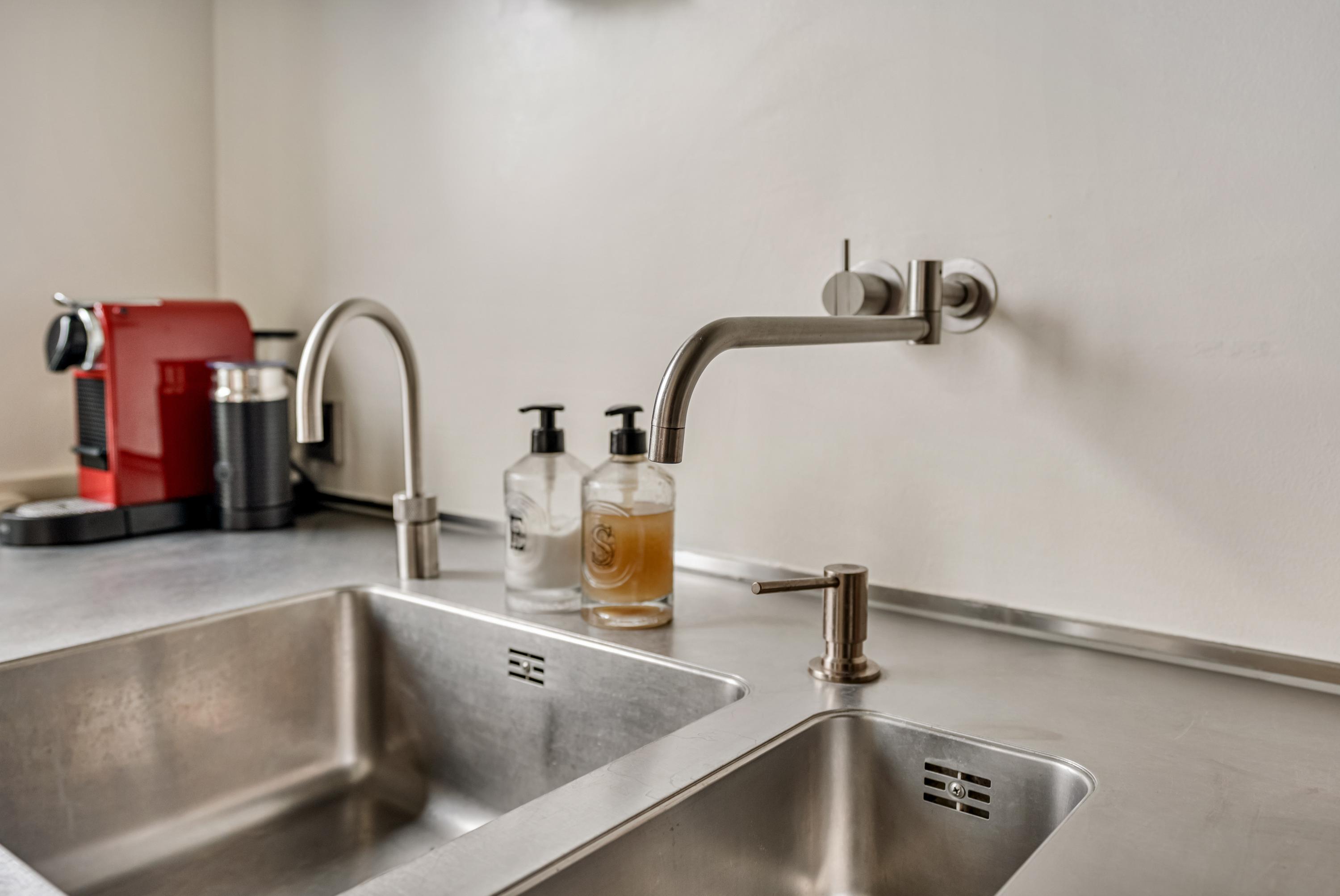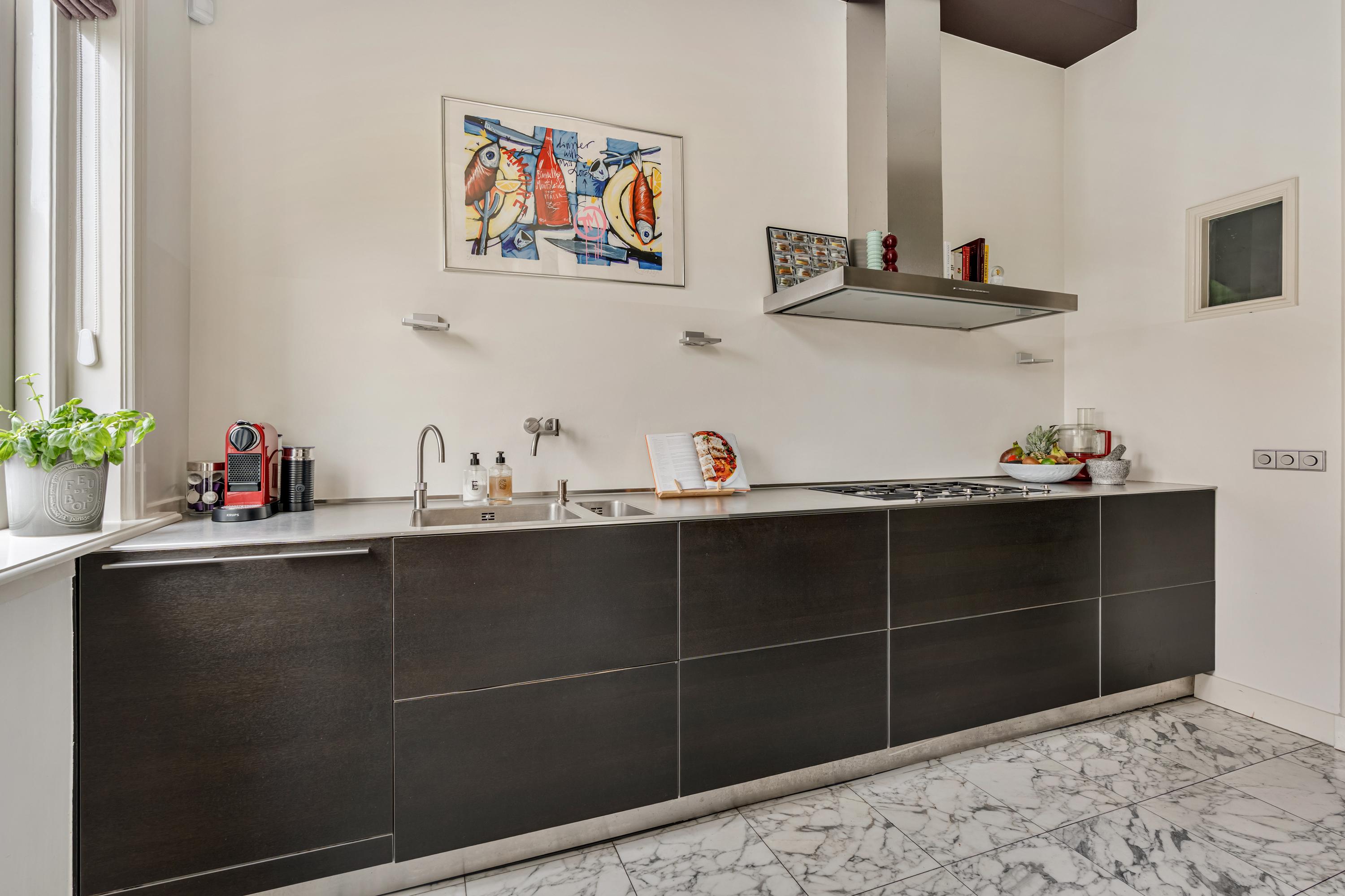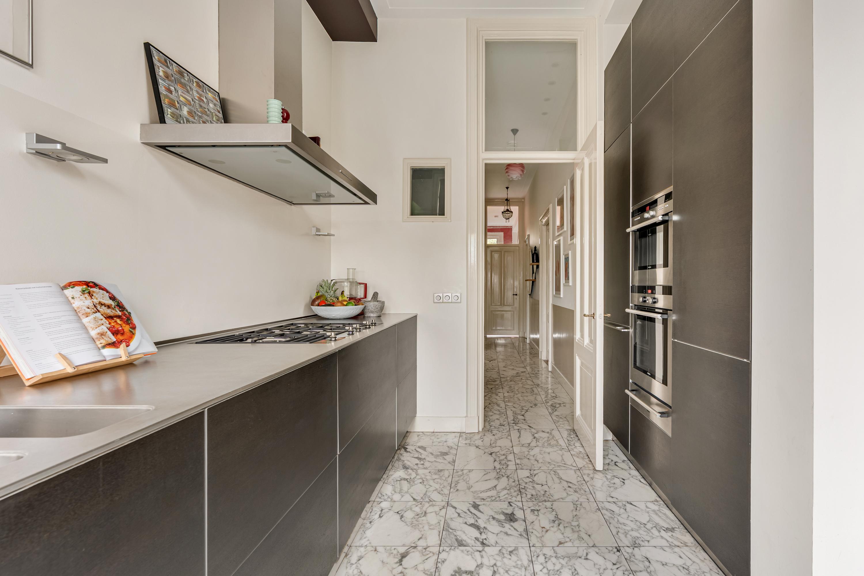 Aan de achterzijde ligt de halfopen keuken, die aansluit op het eetgedeelte. De keuken is modern uitgevoerd en voorzien van een marmeren vloer en hoogwaardige inbouwapparatuur, waaronder een 5-pits gasfornuis, Quooker, koel-vriescombinatie, oven en magnetron met warmhoudplaat voor borden, en een vaatwasser. Een stijlvolle en functionele ruimte met voldoende opbergruimte.