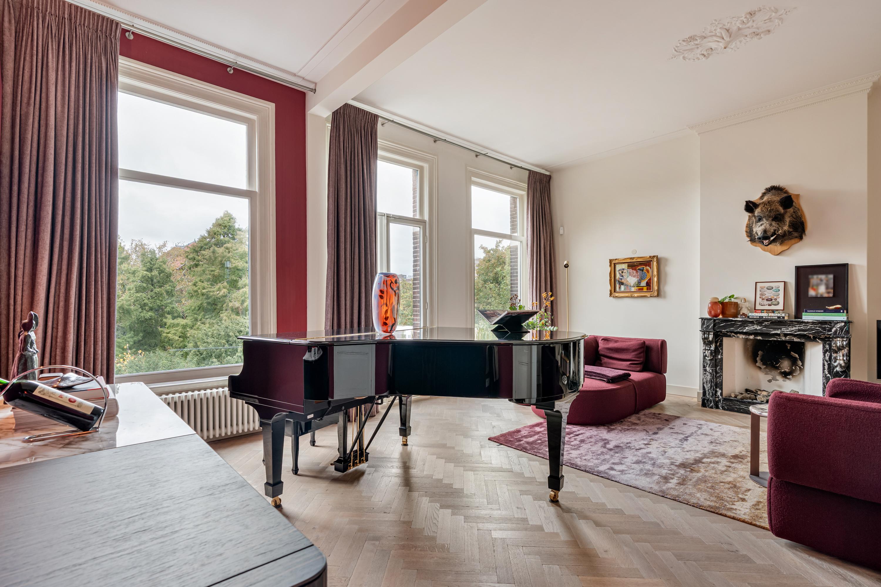 De royale woonkamer en-suite strekt zich uit over een lengte van ruim vijftien meter en wordt gescheiden door originele houten en-suite deuren. De ruimte ademt elegantie dankzij de hoge plafonds met originele ornamenten, inbouwkasten en een prachtige lichte visgraat eikenhouten vloer met bies. Aan zowel de voor als achterzijde bevindt zich een open gashaard, wat zorgt voor een warme, huiselijke sfeer. Aan de voorzijde biedt een Frans balkon een schitterend uitzicht over het Vondelpark, een uniek, groen uitzicht midden in Amsterdam.