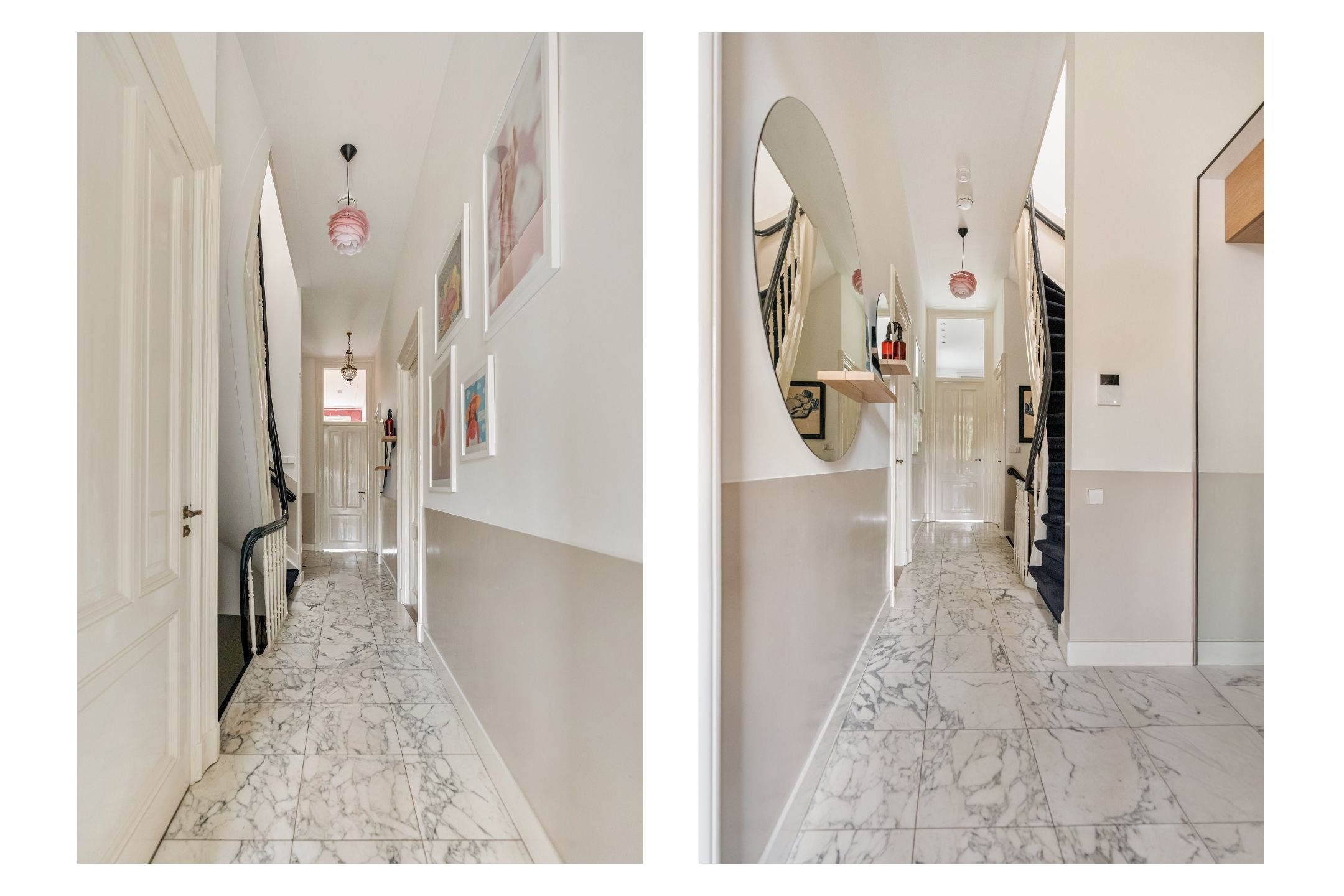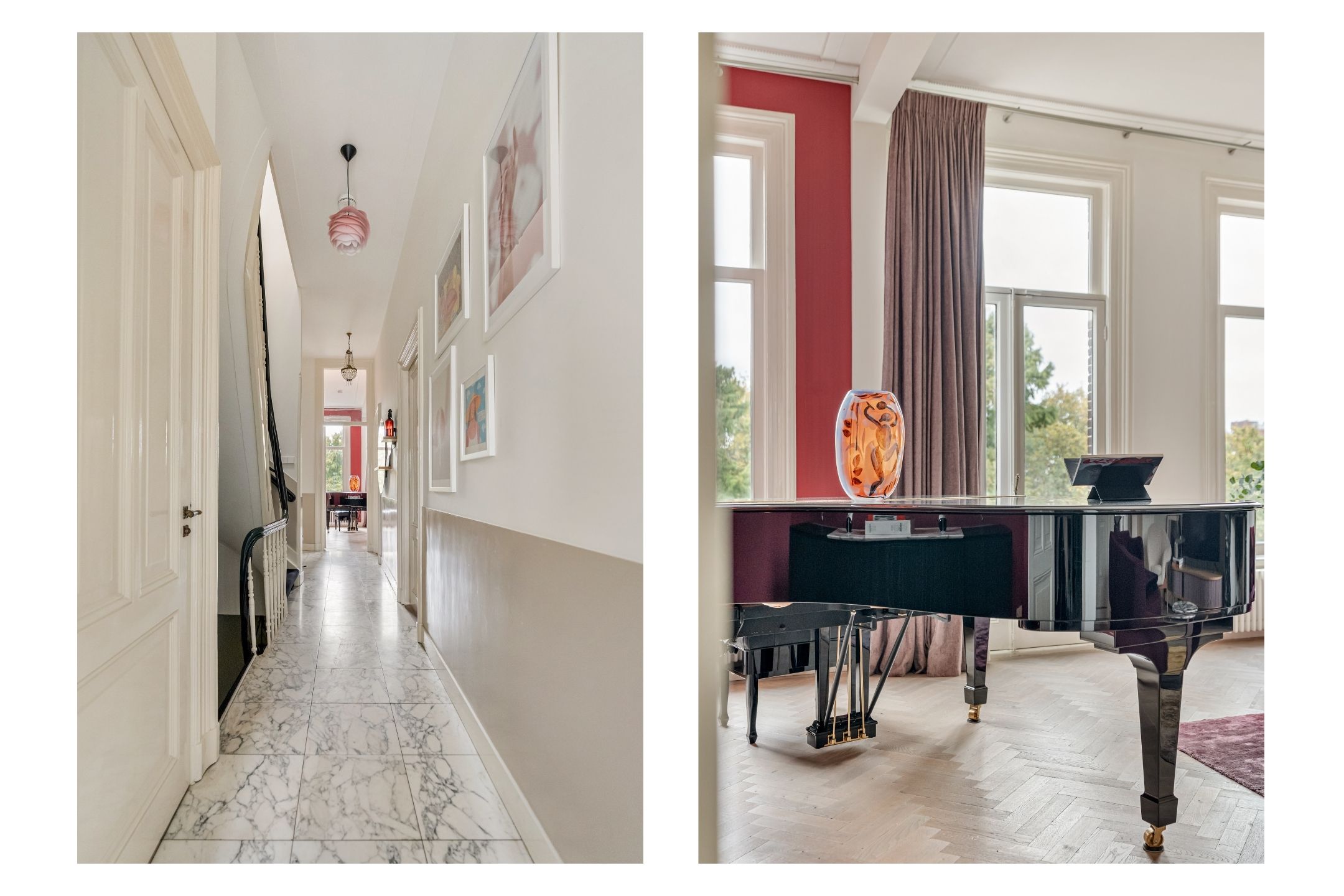 Via de eigen entree bereikt u de tweede verdieping van dit ruime en karaktervolle appartement van circa 184 m². De hal, voorzien van een marmeren vloer, biedt toegang tot alle vertrekken en beschikt over een garderobe en een toilet met fonteintje.