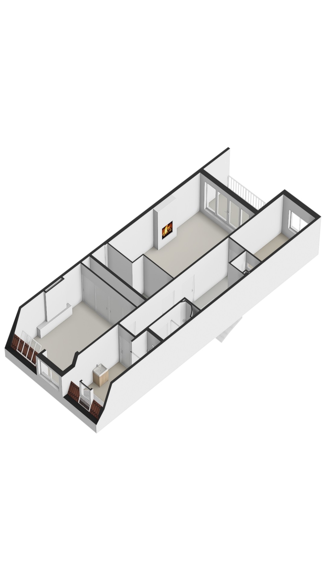 Op de derde verdieping bevindt zich een ruime overloop met separaat toilet en meerdere kamers, waaronder twee slaapkamers aan de achterzijde, één daarvan met vaste kasten, open haard en toegang tot het zonnige balkon op het zuiden. Vanuit deze kamer leiden openslaande deuren naar het royale dakterras van circa 58 m², waar u de hele dag door van de zon en het weidse uitzicht over de stad kunt genieten. Deze kamer wordt momenteel gebruikt als werkkamer, maar is flexibel in te delen als extra slaapkamer, logeerkamer of atelier.