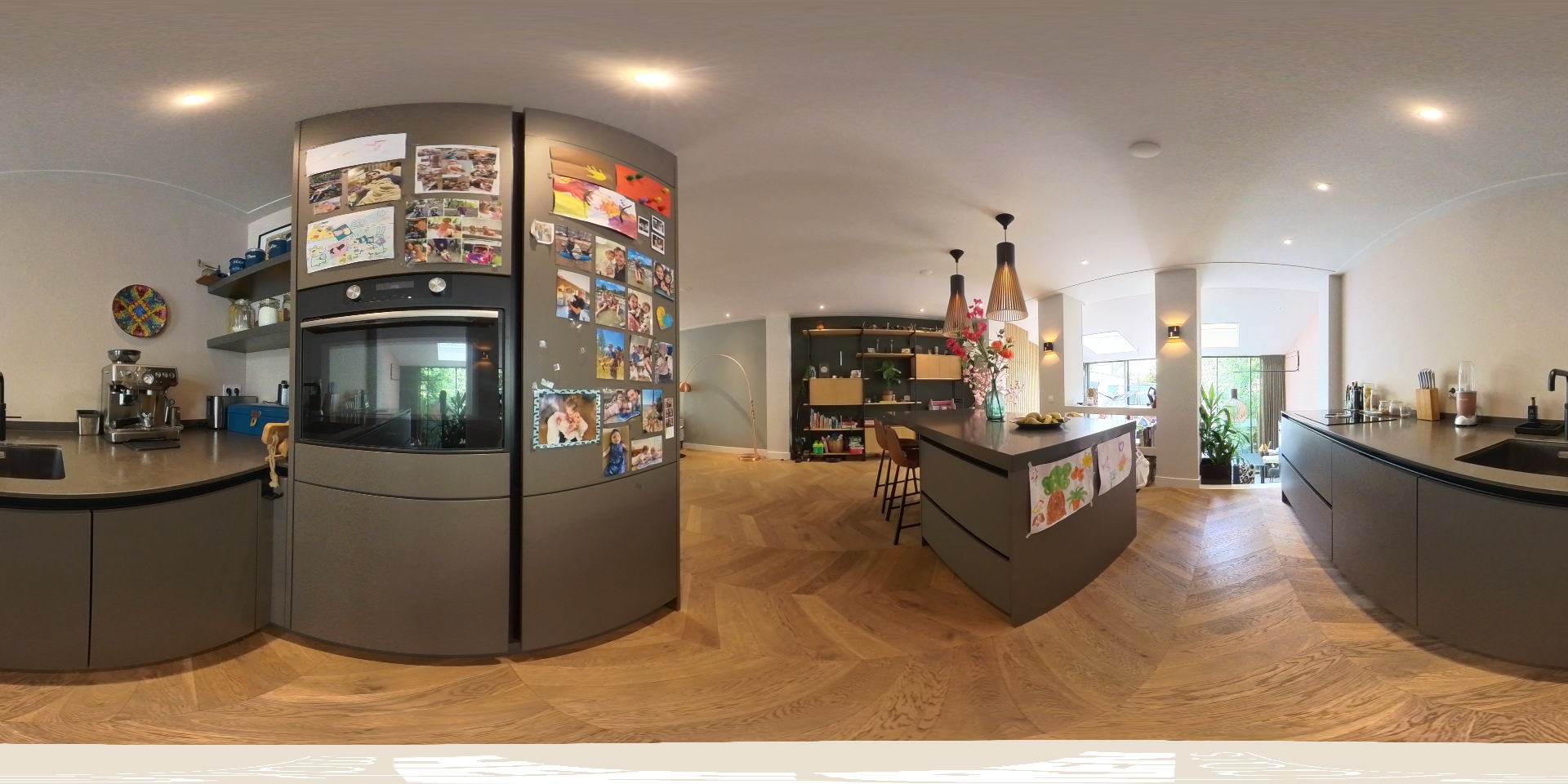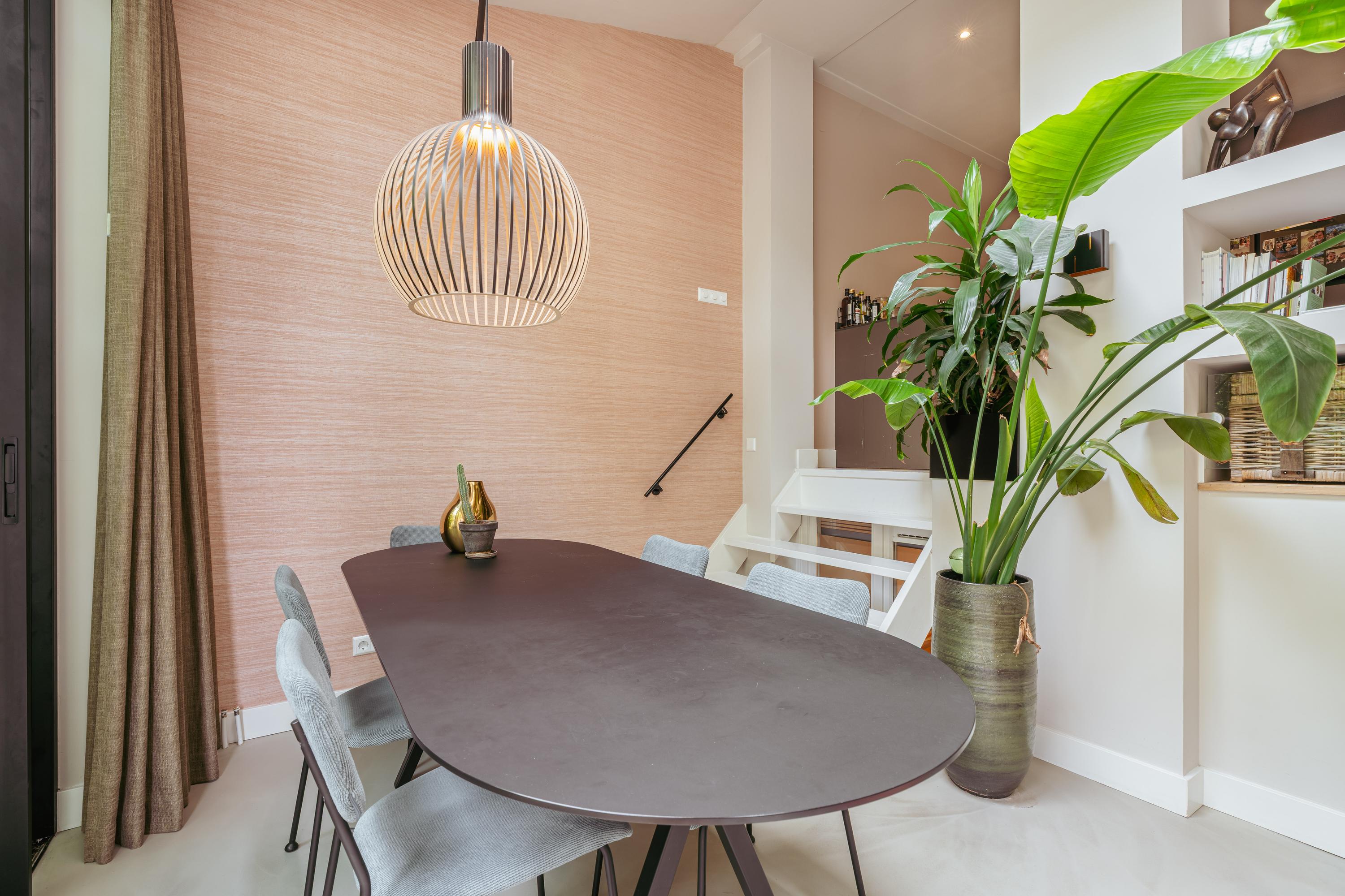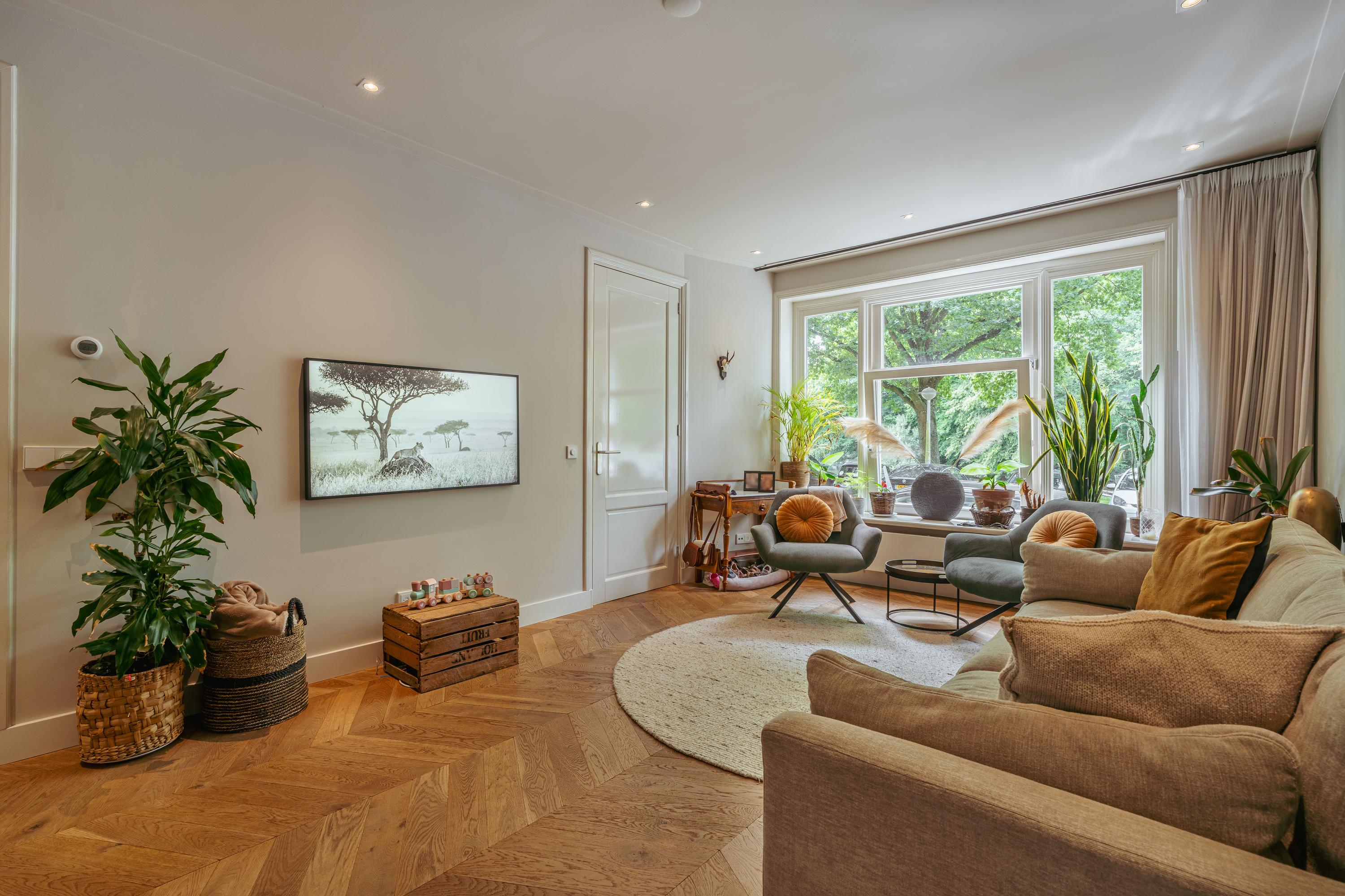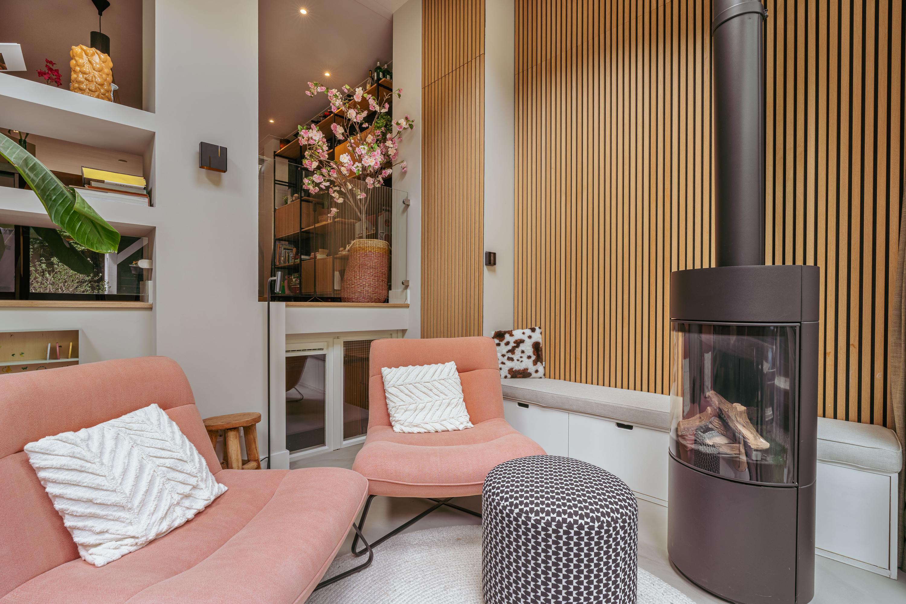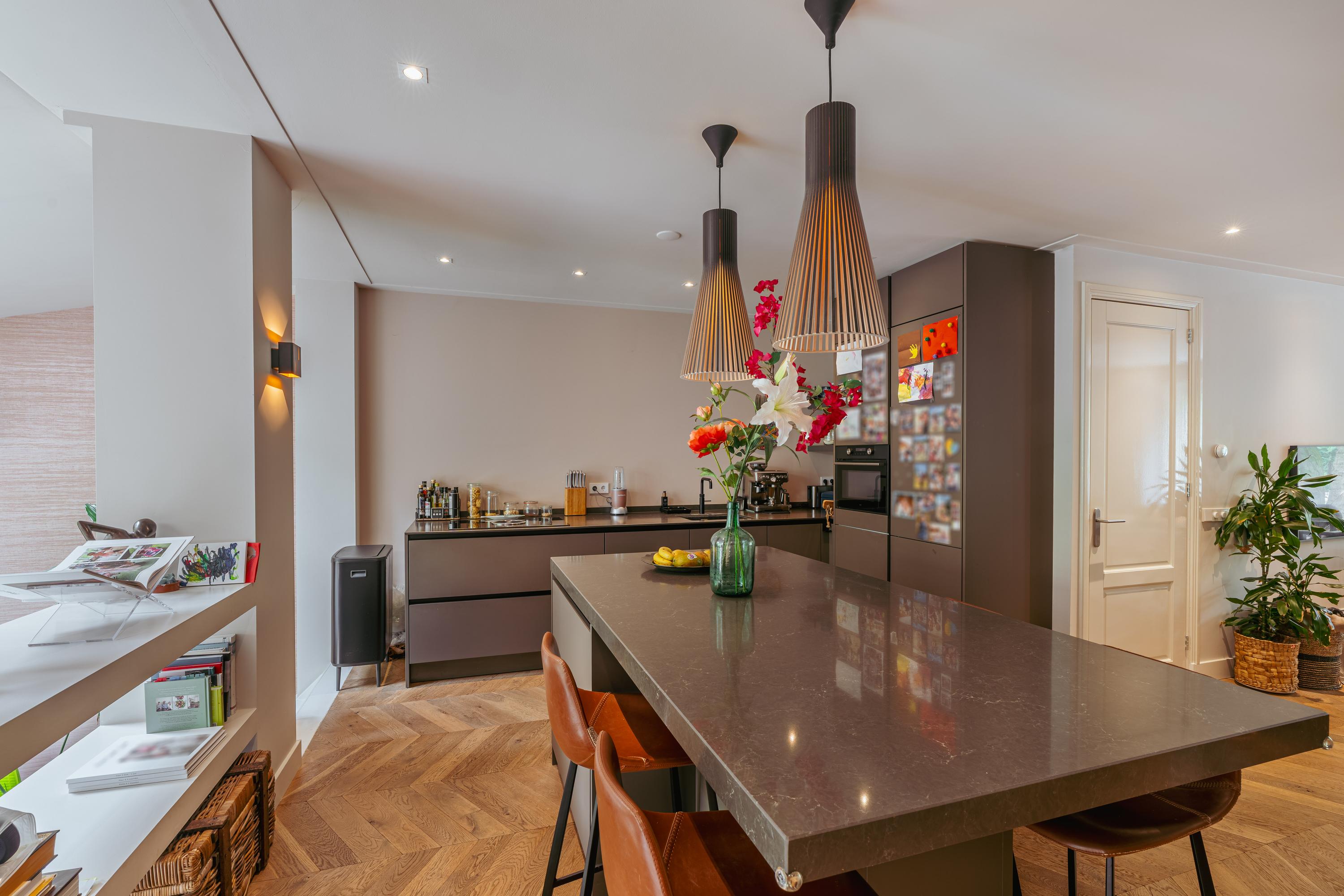 Aan de voorzijde bevindt zich de royale woonkamer, waar eenvoudig een comfortabele zithoek kan worden ingericht. Centraal in de woning treft u de open keuken met een stijlvol kookeiland en een gezellig bargedeelte. De keuken is uitgerust met hoogwaardige inbouwapparatuur, waaronder een 4-pits inductiekookplaat met geïntegreerde afzuiging, een vaatwasser, een koel-/vriescombinatie, een combi-oven en een Quooker. Een paar treden lager komt u in de recent gerealiseerde uitbouw met dakramen, die veel natuurlijk licht binnenlaten. Hier is momenteel een sfeervolle eetruimte ingericht, met daarnaast een extra zithoek rondom een moderne gashaard. Via plafondhoge glazen schuifdeuren bereikt u de fraai aangelegde tuin van circa 32 m², gelegen op het oosten. Daarnaast beschikt u over een praktische berging in de tuin.