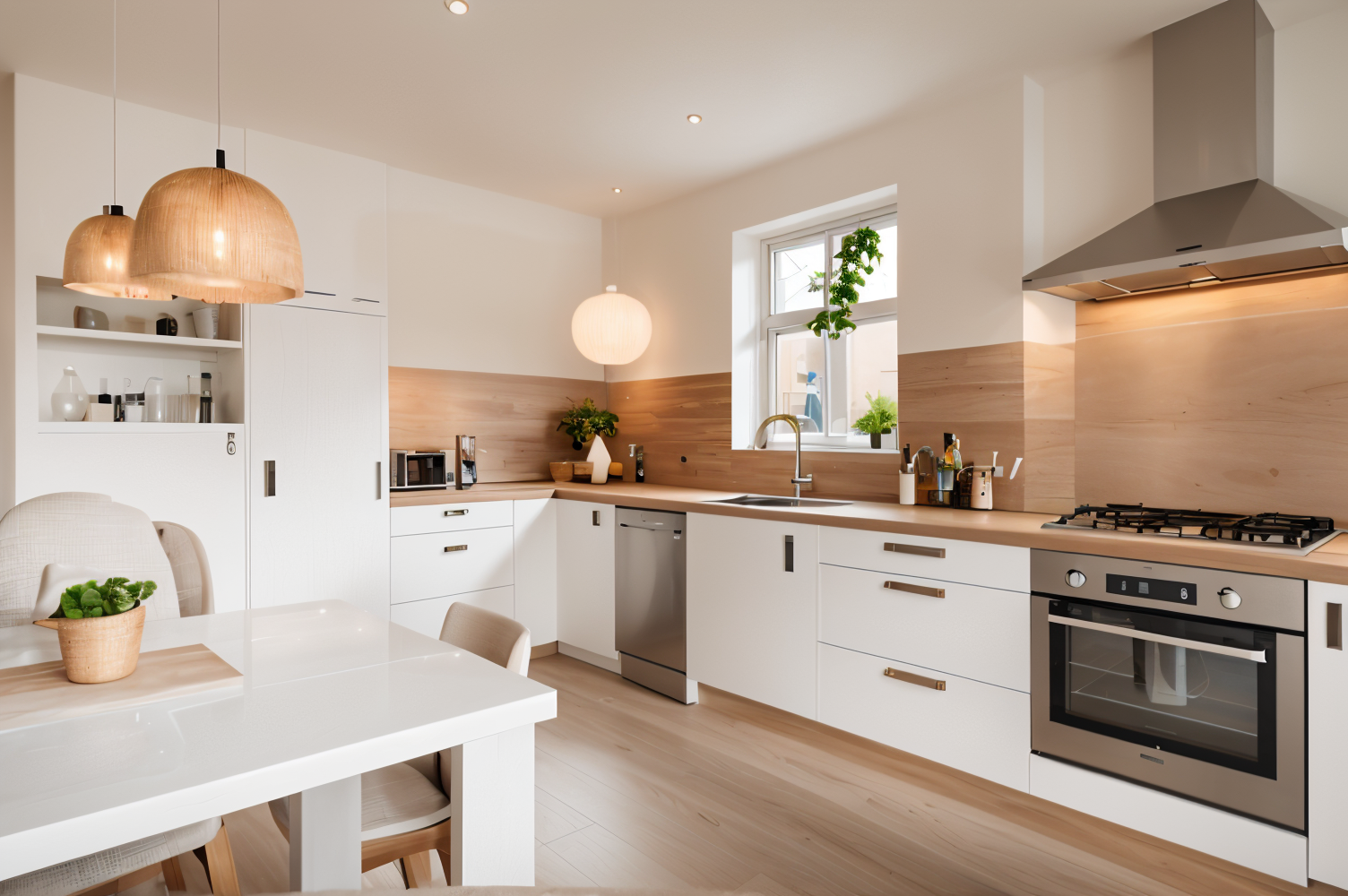 Aan de voorzijde van de woning bevindt zich de ruime woonkeuken met een charmante driehoekige erker. De roomwitte keukenopstelling met RVS accenten is voorzien van inbouwapparatuur: een 5-pits gaskookplaat, schouwkap, combi-oven, vaatwasser, koelkast en ruimte voor een vriezer. De ruimte biedt voldoende plek voor een grote eettafel met 10 stoelen en een buffetkast, waardoor dit een fijne plek is om te koken en gezellig samen te zijn.