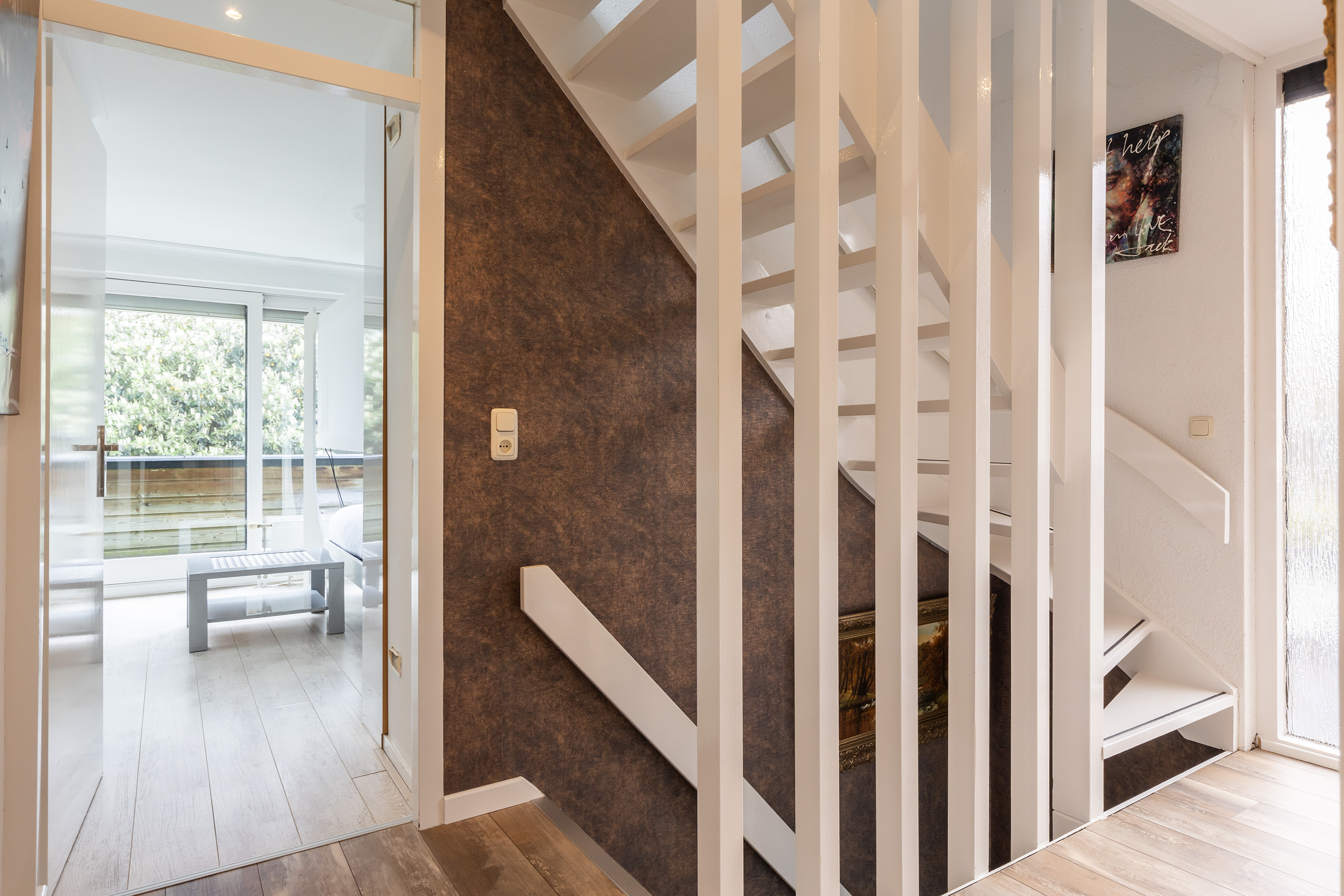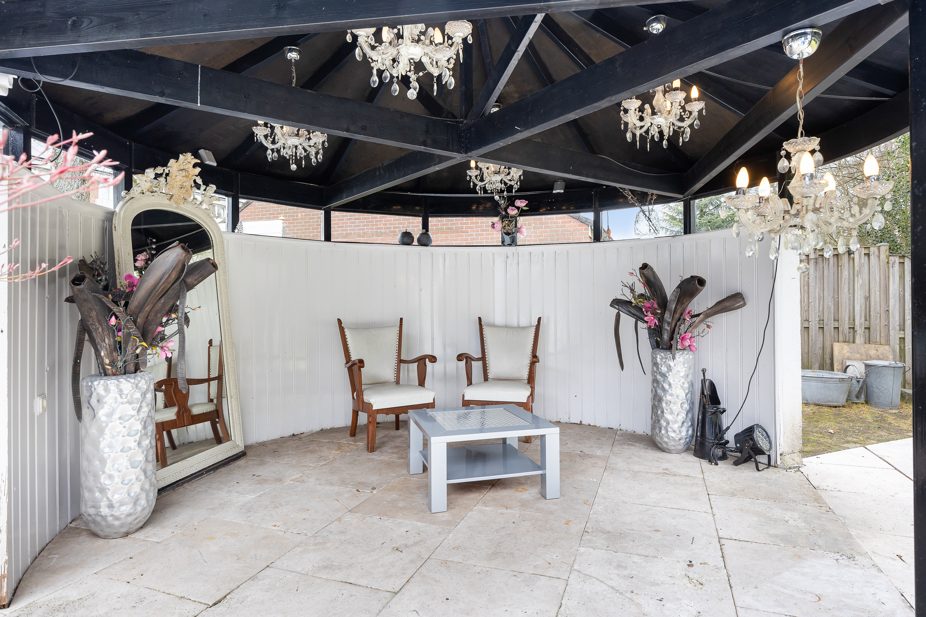 De aangrenzende living biedt verschillende indelingsmogelijkheden met meerdere zithoeken. Een moderne gashaard vormt het centrale punt, terwijl de schuifpui directe toegang biedt tot de achtertuin. Aansluitend is de tuinkamer gerealiseerd, compleet met airconditioning en warmtewisselaar. Dit is een comfortabele ruimte om te gebruiken als tweede zithoek, televisiekamer of thuiskantoor.