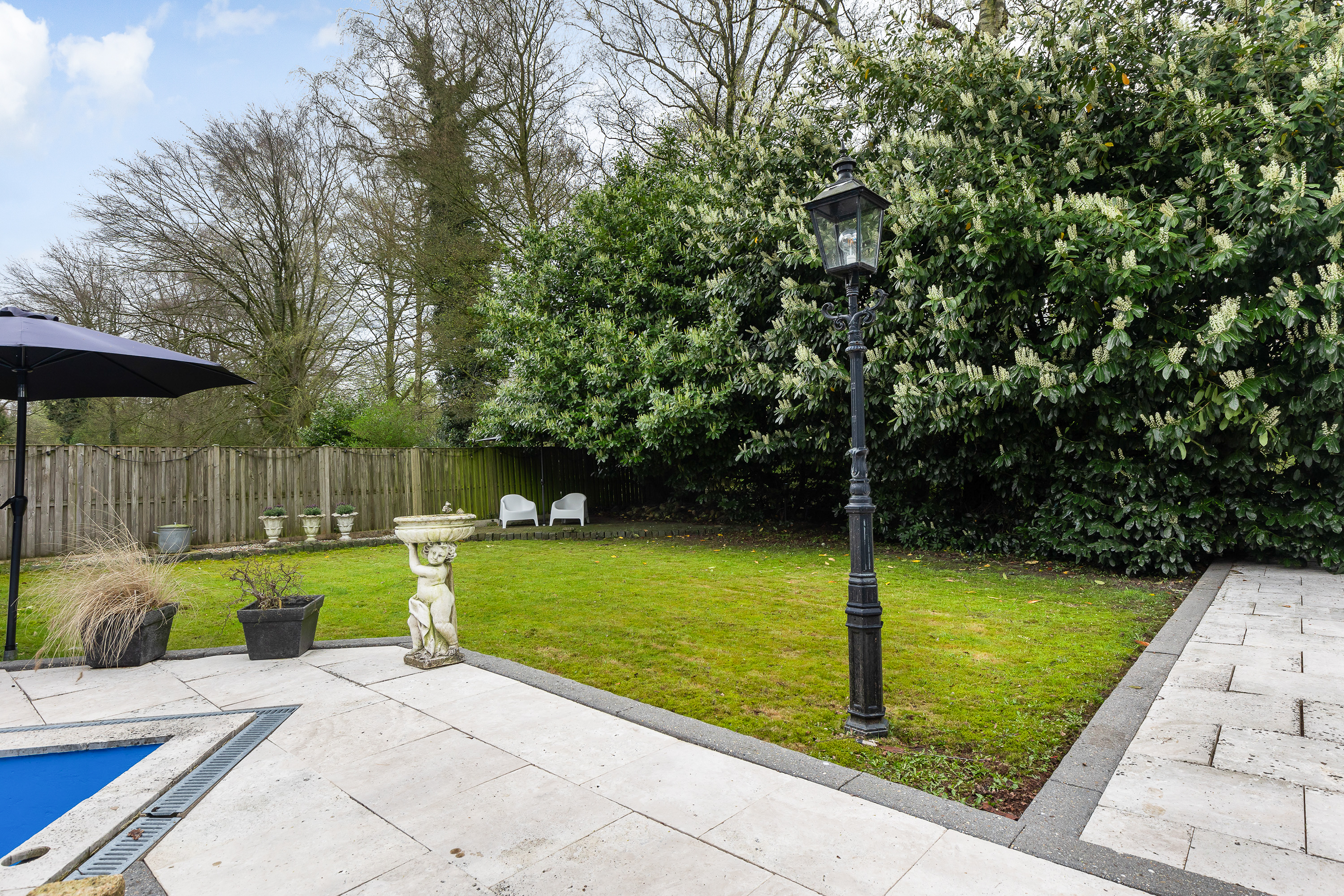 De tuin is één van de grote troeven van deze woning. Met een ligging op het zuiden en grenzend aan een gemeentelijke groenstrook met vijverpartij biedt de achtertuin rust, privacy en de hele dag zon. Het grote terras sluit aan op een sfeervol prieel met loungegedeelte. Daarnaast is er een speels vliegervormig zwembad, een barbecuehoek en een ruime houten berging. Dankzij het onderhoudsvriendelijke ontwerp is de tuin eenvoudig in te richten en te onderhouden.