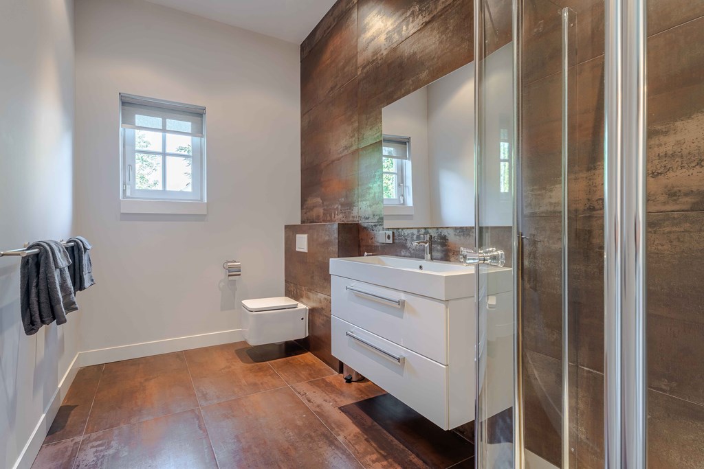 De tweede badkamer is voorzien van een wandcloset, een douche en een brede wastafel met meubel. Op de overloop bevindt zich een extra separate toiletruimte.