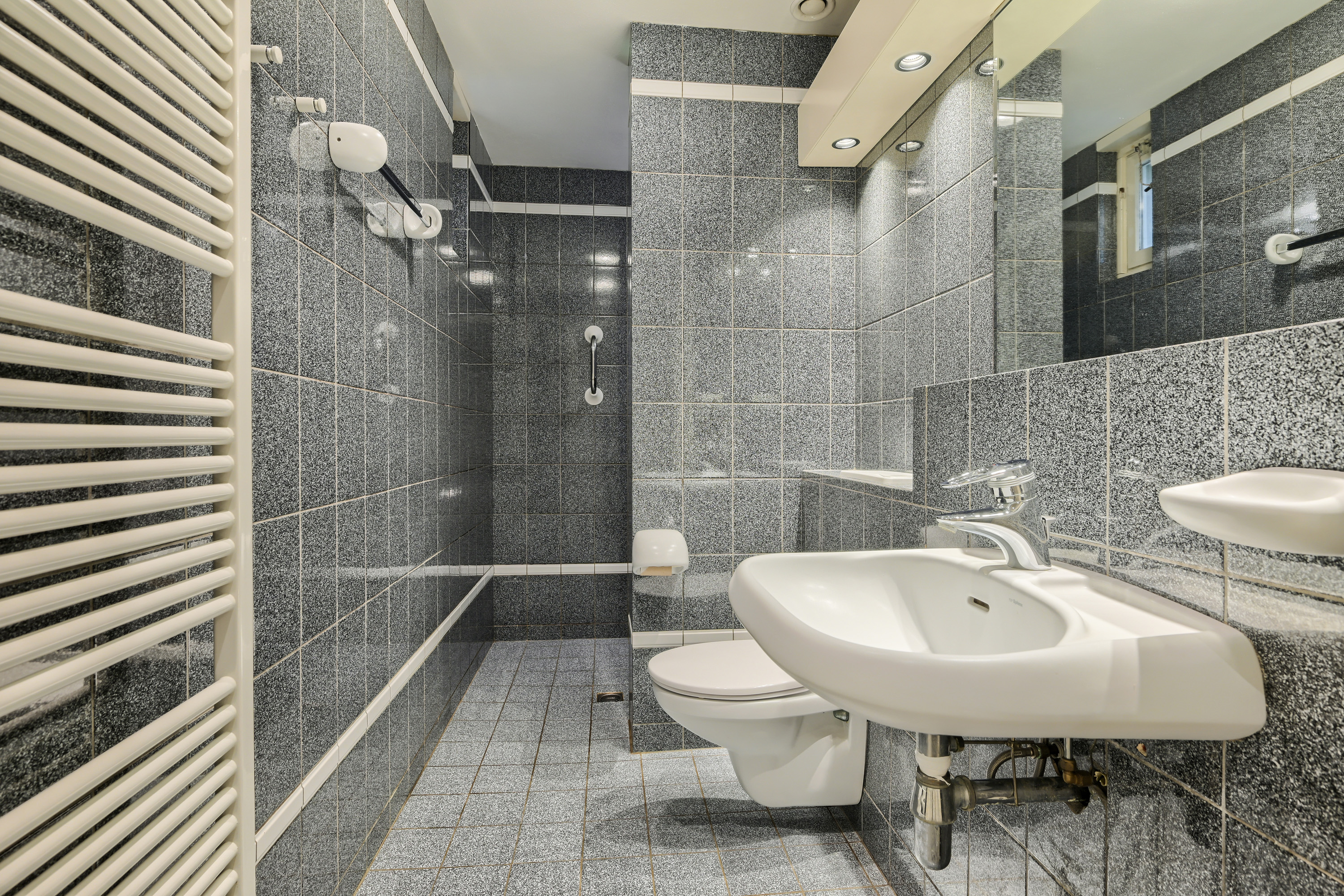 De toiletruimte is stijlvol afgewerkt met natuurstenen betegeling en voorzien van een wandcloset met inbouwreservoir, alsmede een fonteintje.