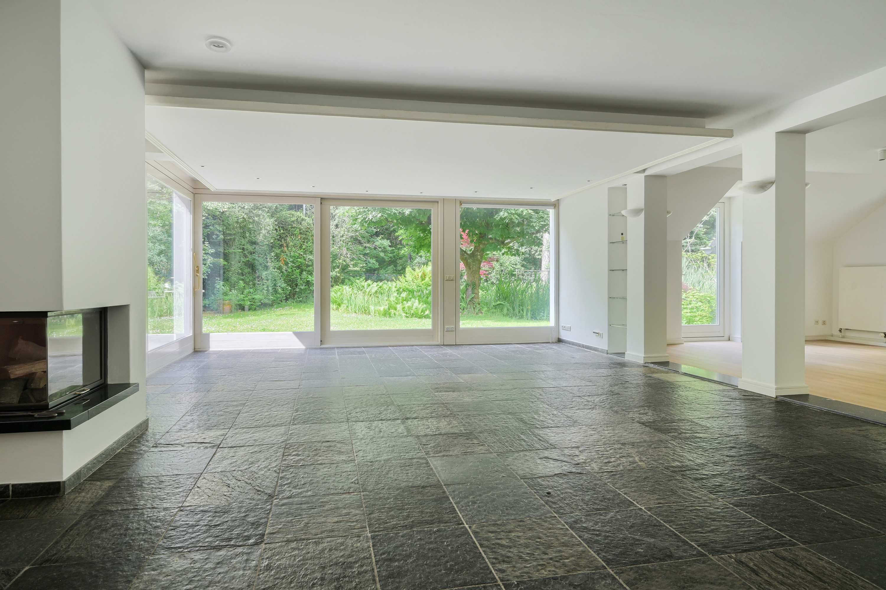 Tussen de zit- en eetkamer is een sfeervolle open haard gesitueerd, welke beide vertrekken op harmonieuze wijze met elkaar verbindt.
