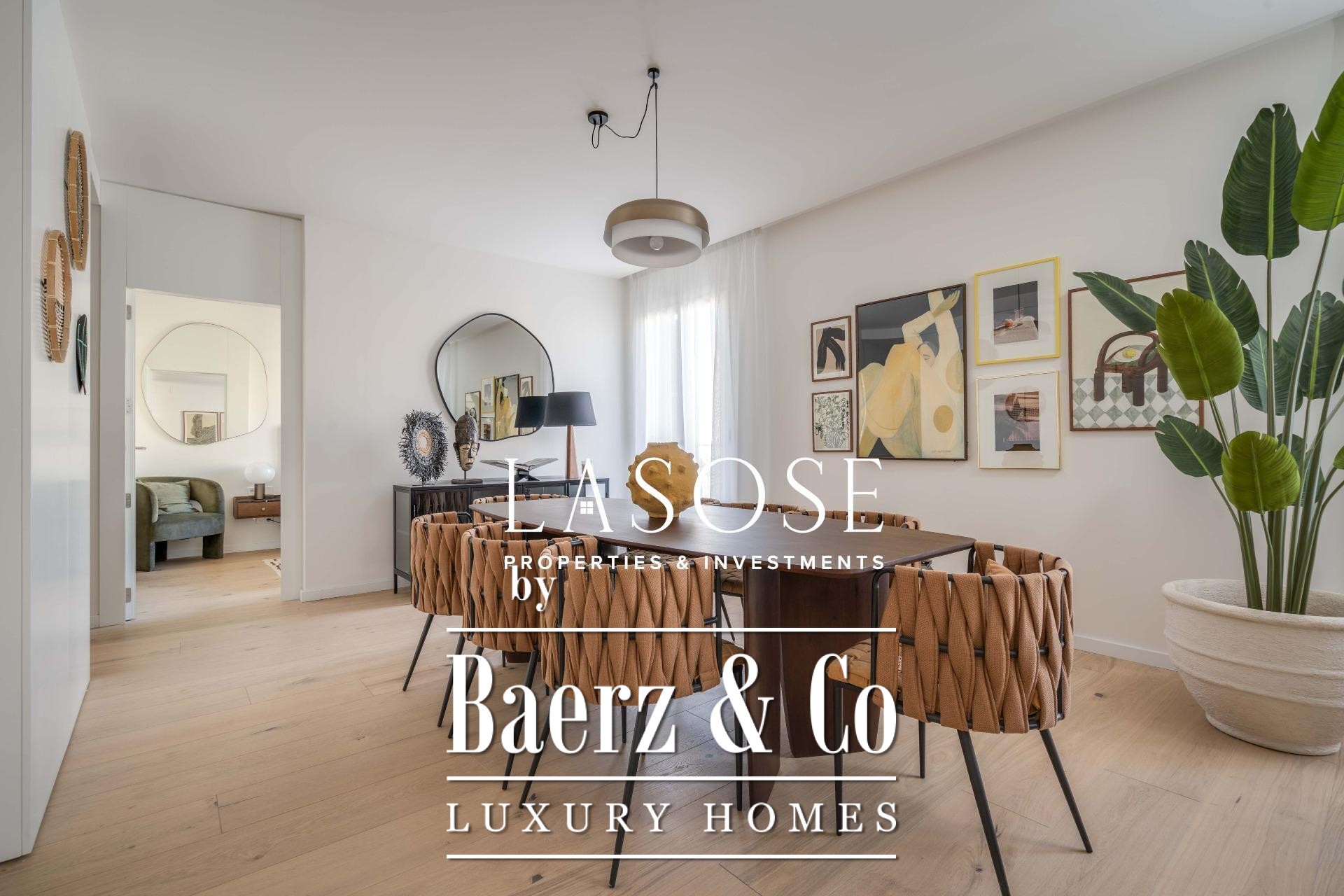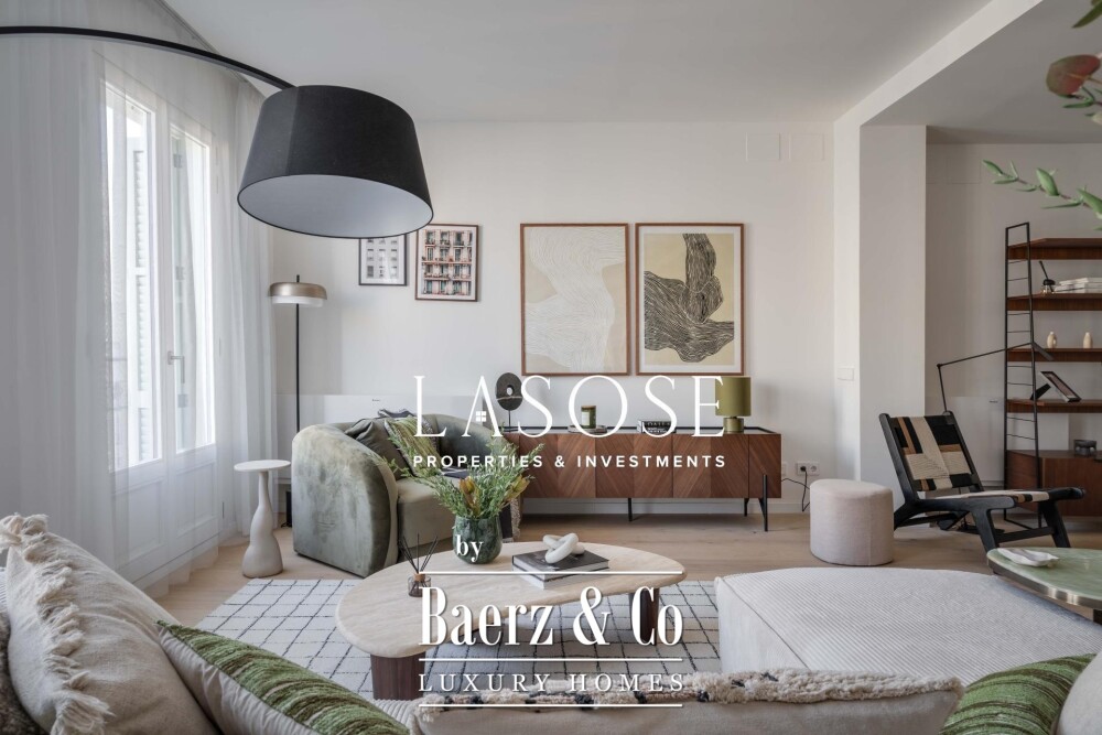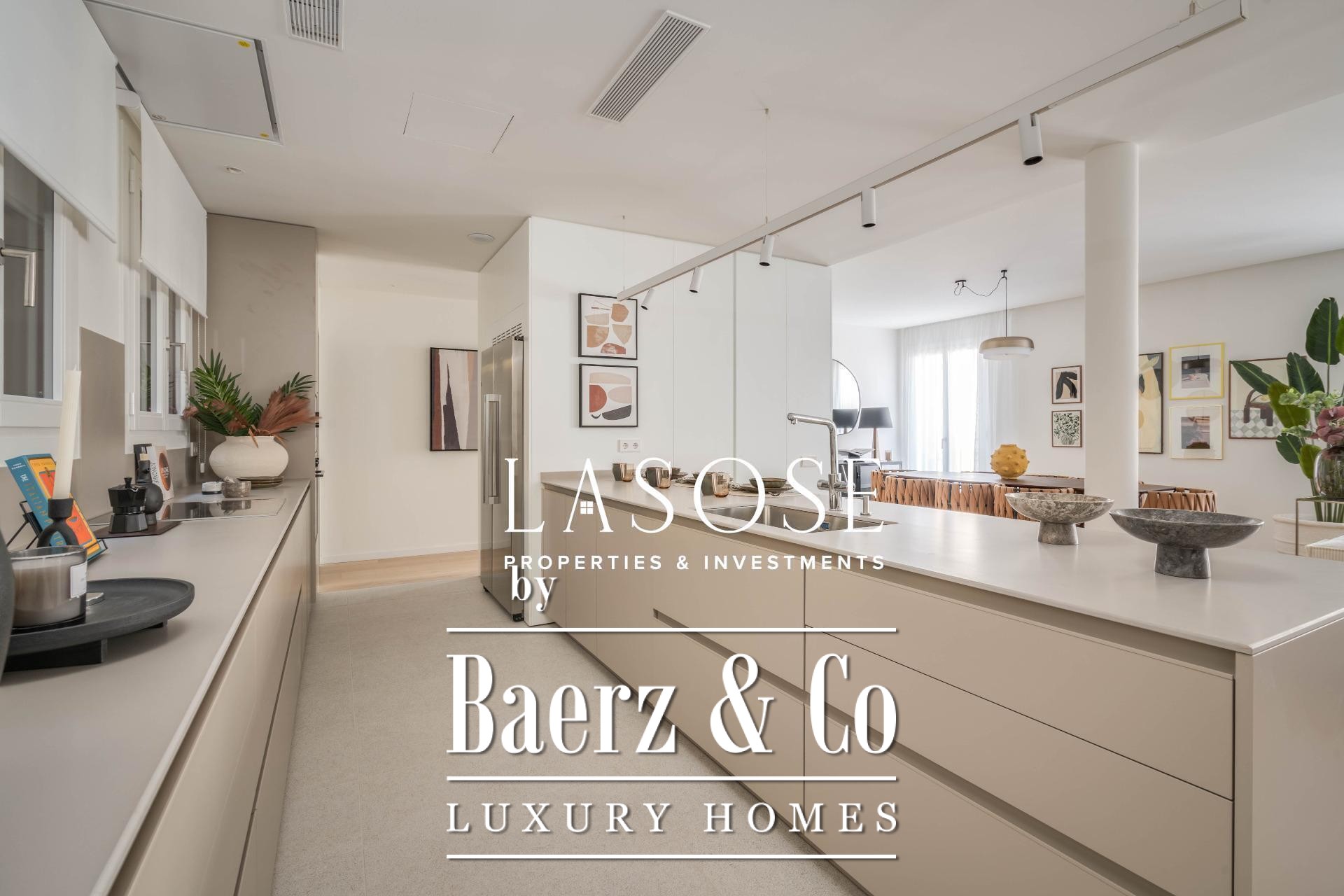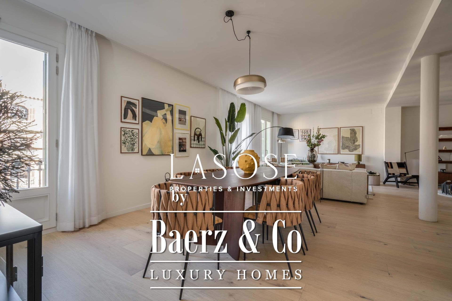 Deze specifieke residentie biedt 137 m² woonruimte, zorgvuldig ingedeeld met twee slaapkamers en drie badkamers. Balkons en een royaal terras verbinden het interieur met het stedelijke ritme, terwijl de gevel en gemeenschappelijke ruimtes van het gebouw de elegantie van klassiek Barcelona weerspiegelen. Het interieur, ontworpen door Estudio Vilablanch, verenigt moderniteit met duurzame stijl dankzij hoogwaardige apparatuur, ruime inbouwkasten, verwarming en een verfijnde, lichte sfeer.