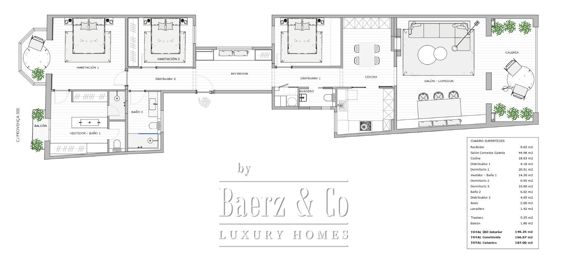 Drie tweepersoonsslaapkamers en twee badkamers zorgen voor flexibele indelingsmogelijkheden. Een modernistische rotonde en het balkon over de gehele breedte geven direct contact met het levendige stadsleven, terwijl een berging, een gepantserde entree en zorgvuldig geselecteerde verlichting voor extra comfort en veiligheid zorgen. Hier wordt het ritme van het stadsleven in balans gebracht met exclusieve woonkwaliteit—een zeldzame kans om deel uit te maken van het rijke erfgoed van Barcelona.