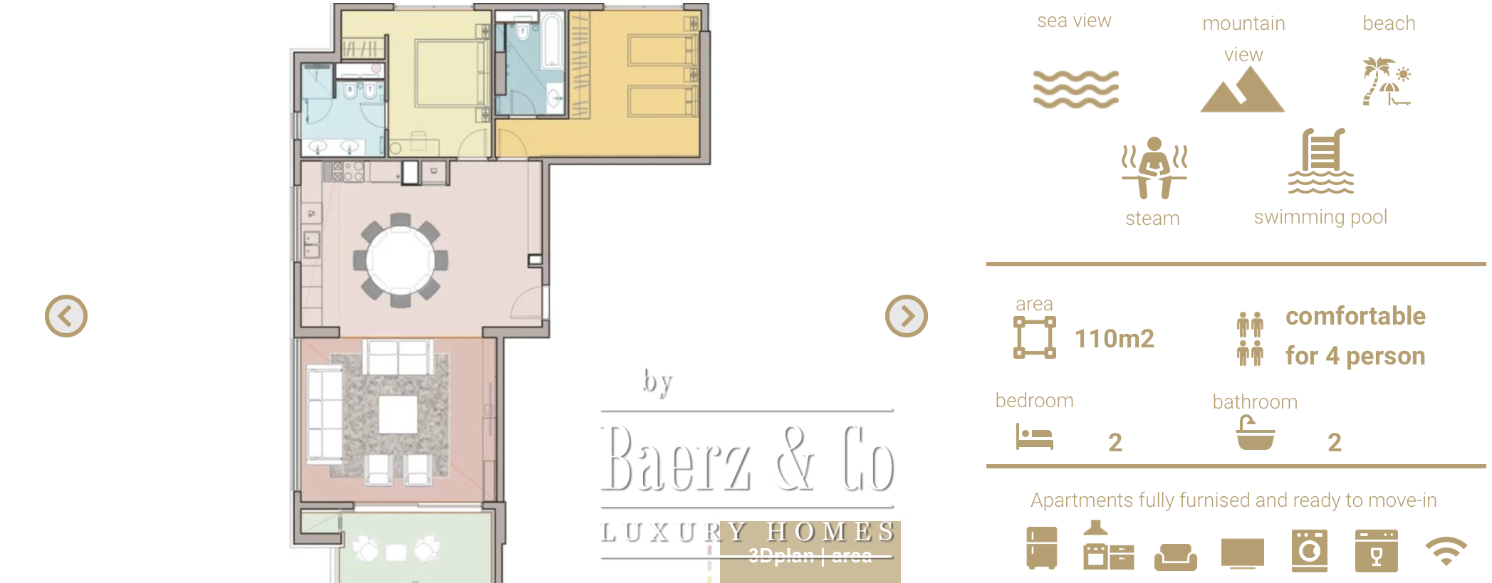 Facilities that come with an apartment are reception, security, technical rooms, swimming pool, sunbeds, hammam and children's playground.