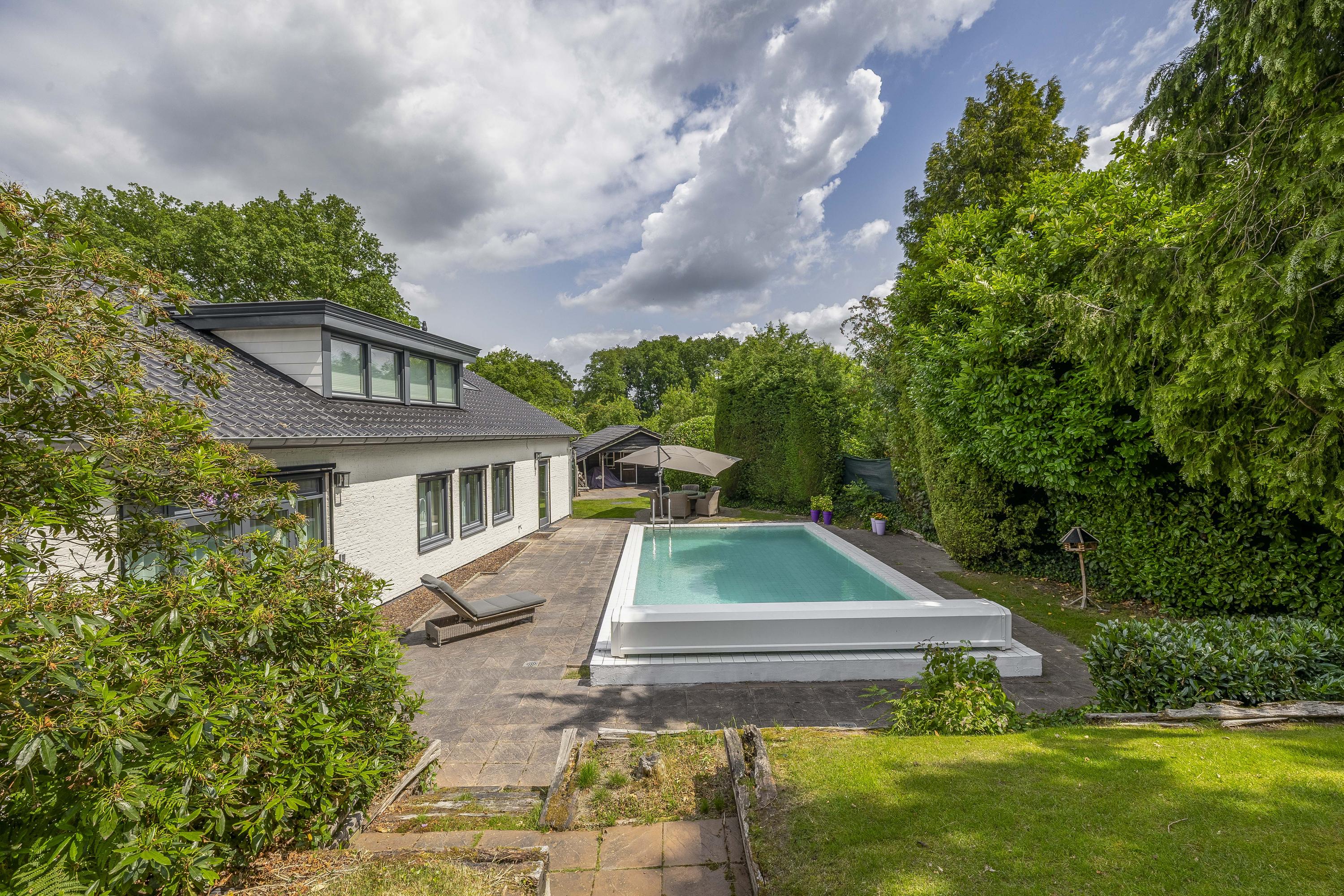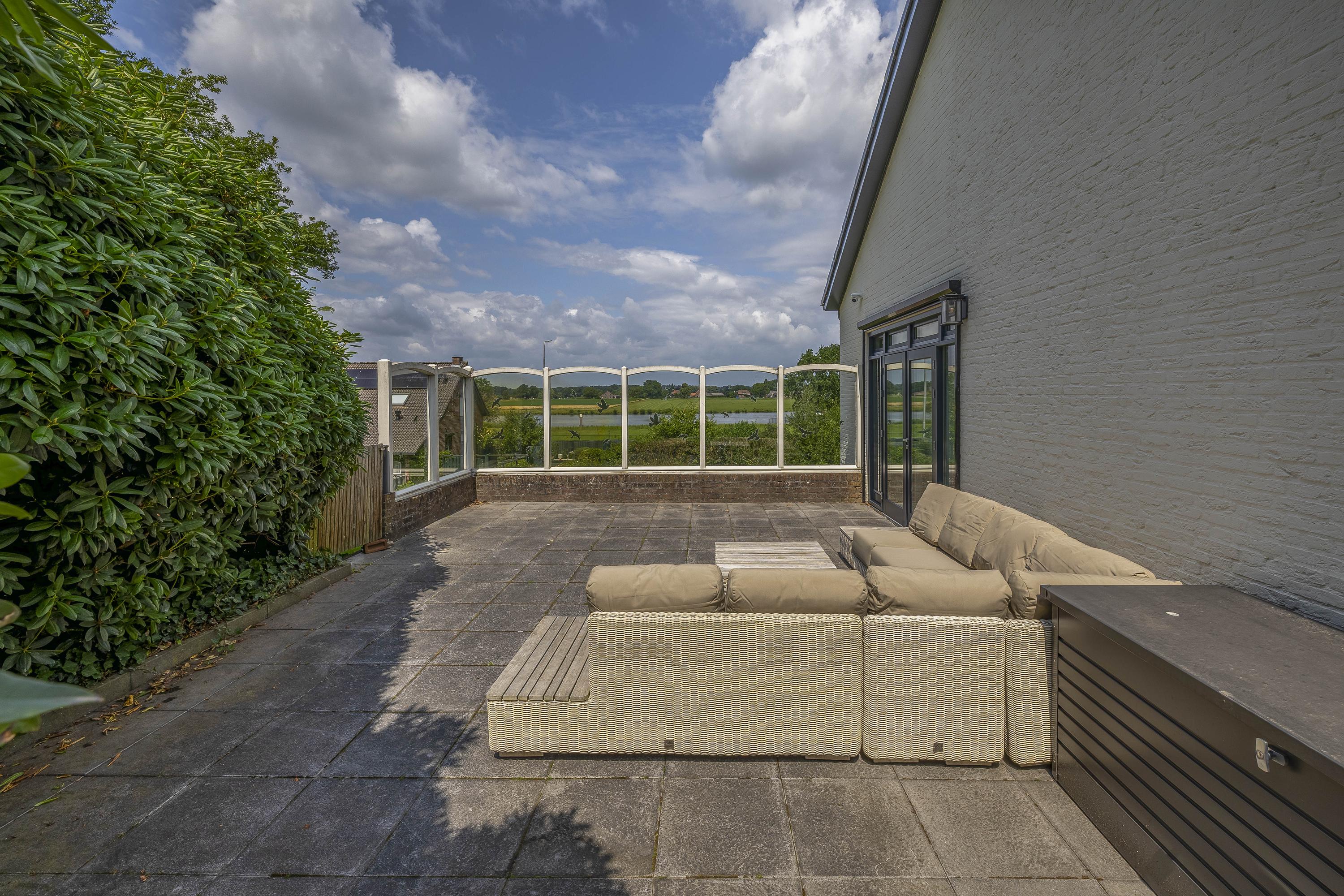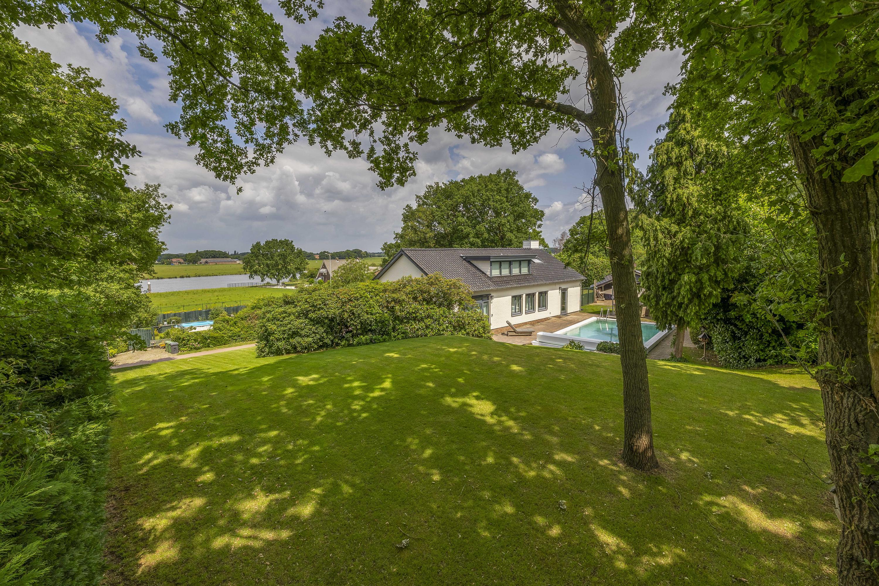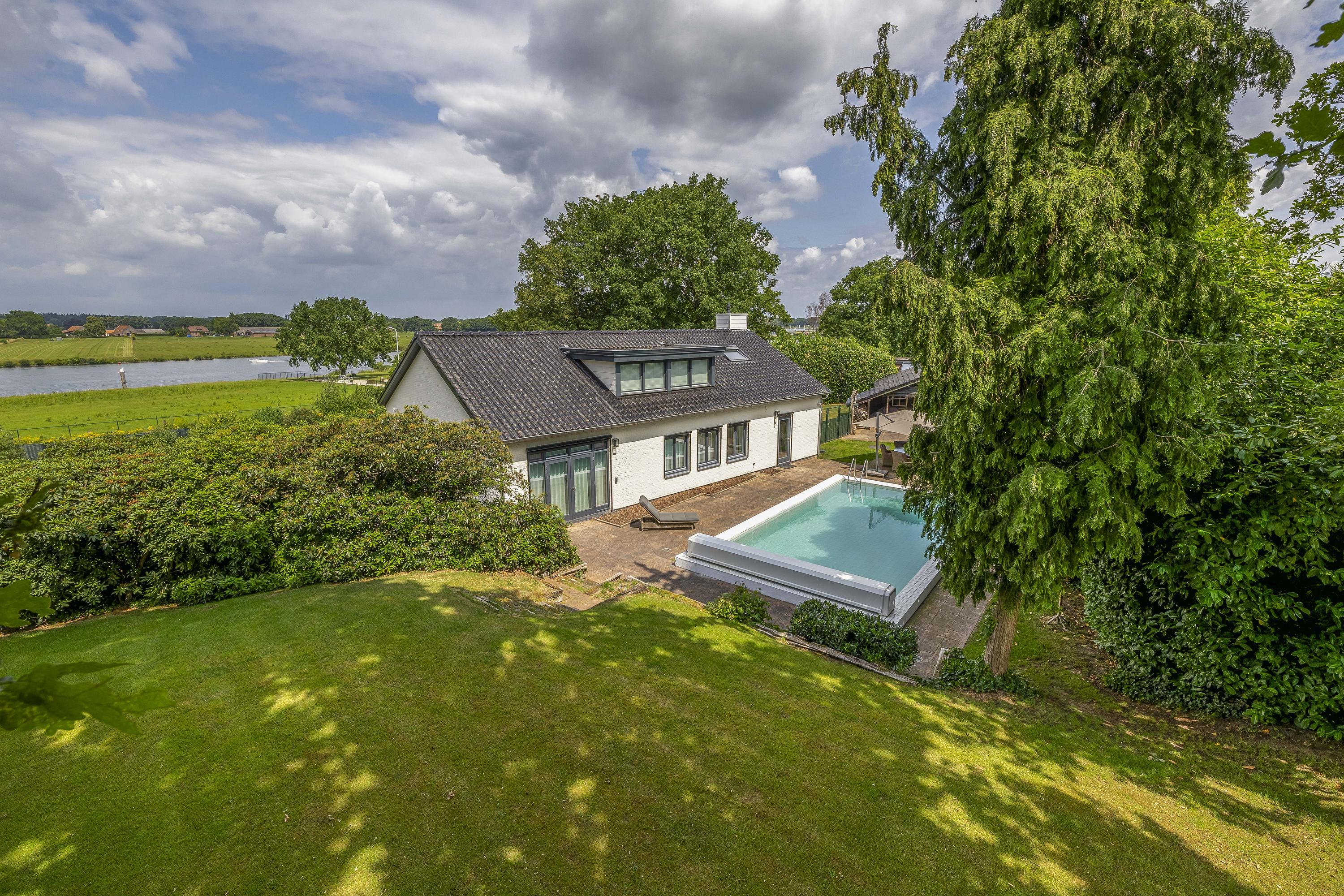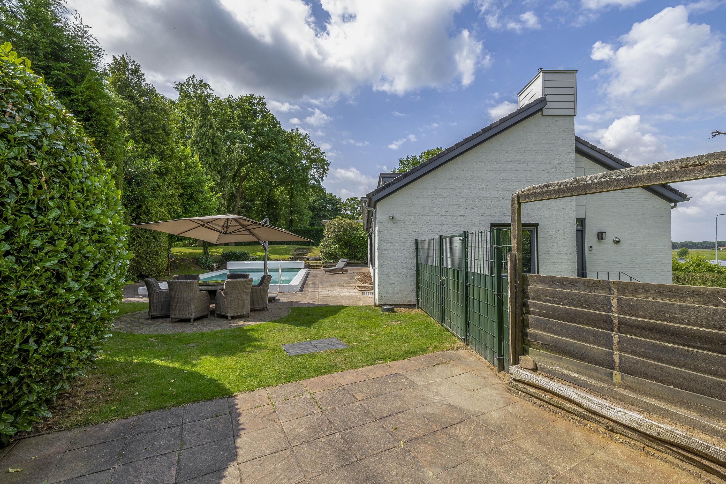 De tuin loopt volledig rondom de woning. Aan de linkerzijde biedt een terras een mooi uitzicht op de Maas. De tuin is zeer groen aangelegd. Het zwembad is circa. 10x5m. Op de eigen oprit is plek voor meerdere auto's.