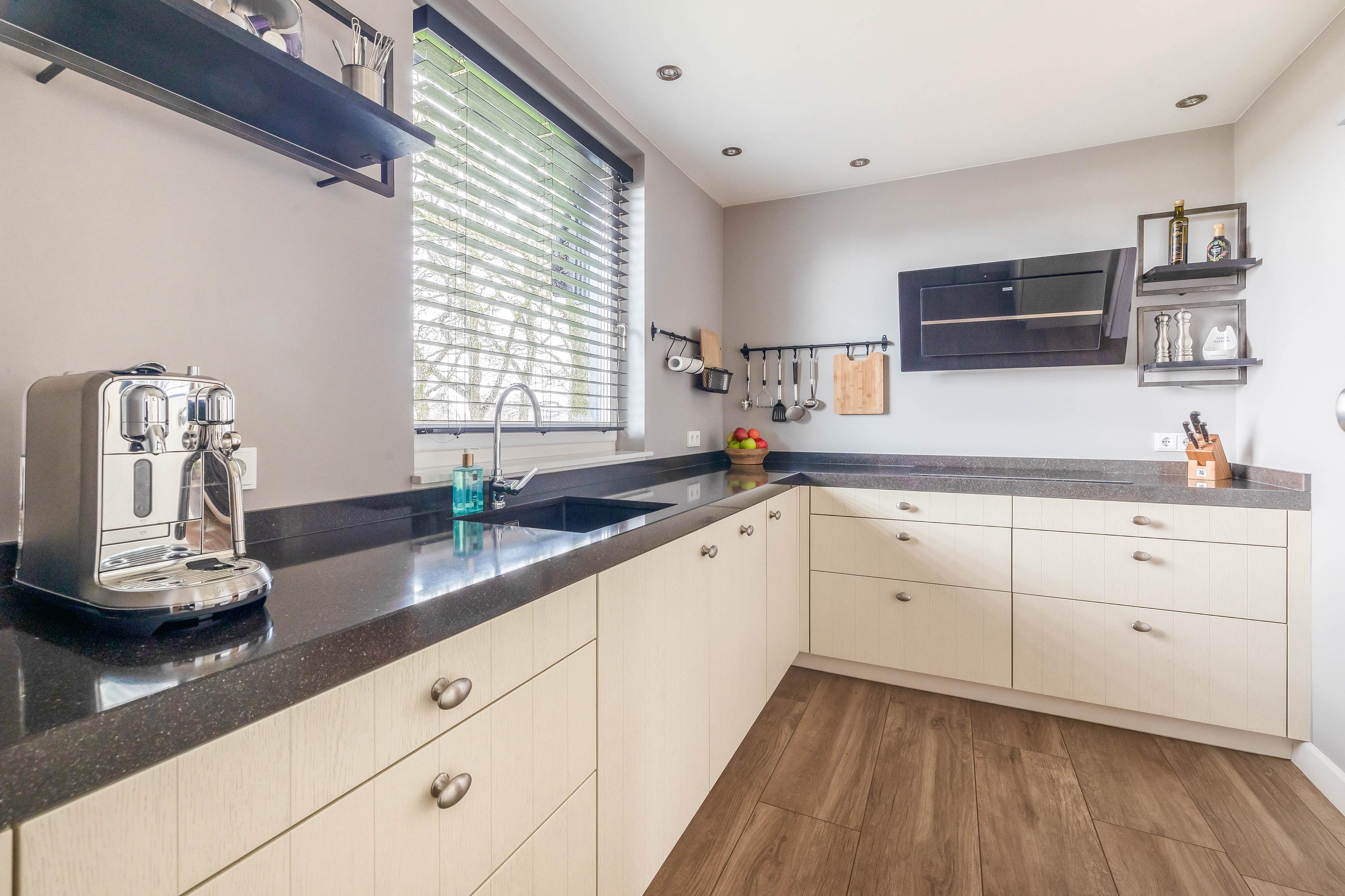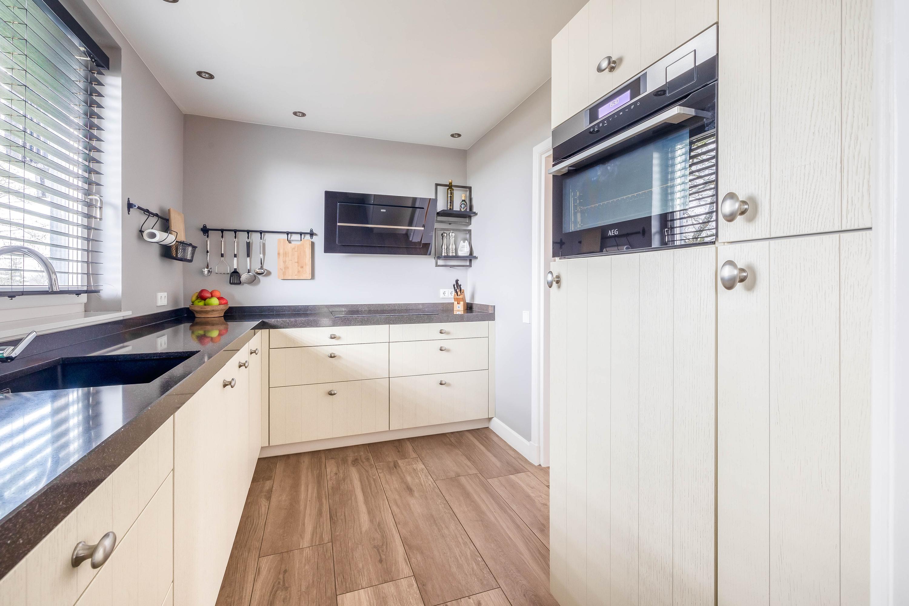 Vanuit de prachtige, hoge L-vormige woonkamer (ca. 72m²) is er een fantastisch uitzicht op de Maas. Het hoge plafond, de vele ramen en de tweemaal dubbele tuindeuren zorgen voor een mooie lichtinval. In de massieve keuken (ca. 7m²) zijn een inductiekookplaat, afzuigkap, vaatwasser, koelkast en combi stoomoven aanwezig. Ook vanuit hier is er een mooi uitzicht op de Maas. Het geheel is afgewerkt met een composieten aanrechtblad.