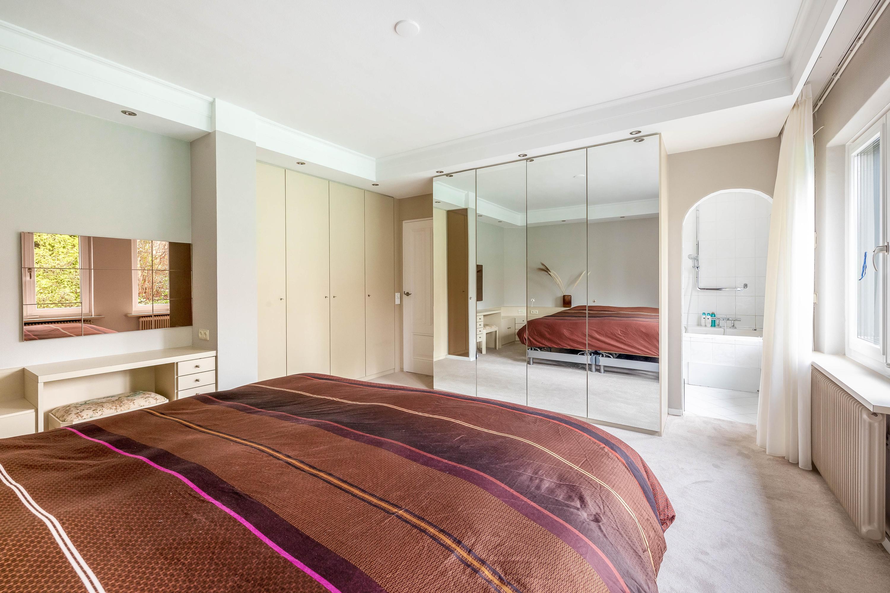 De grote slaapkamer (ca. 21m²) heeft een vaste kastenwand en biedt toegang tot de en-suite badkamer. De badkamer (ca. 5m²) is voorzien van een ligbad met douche en dubbel wastafelmeubel.