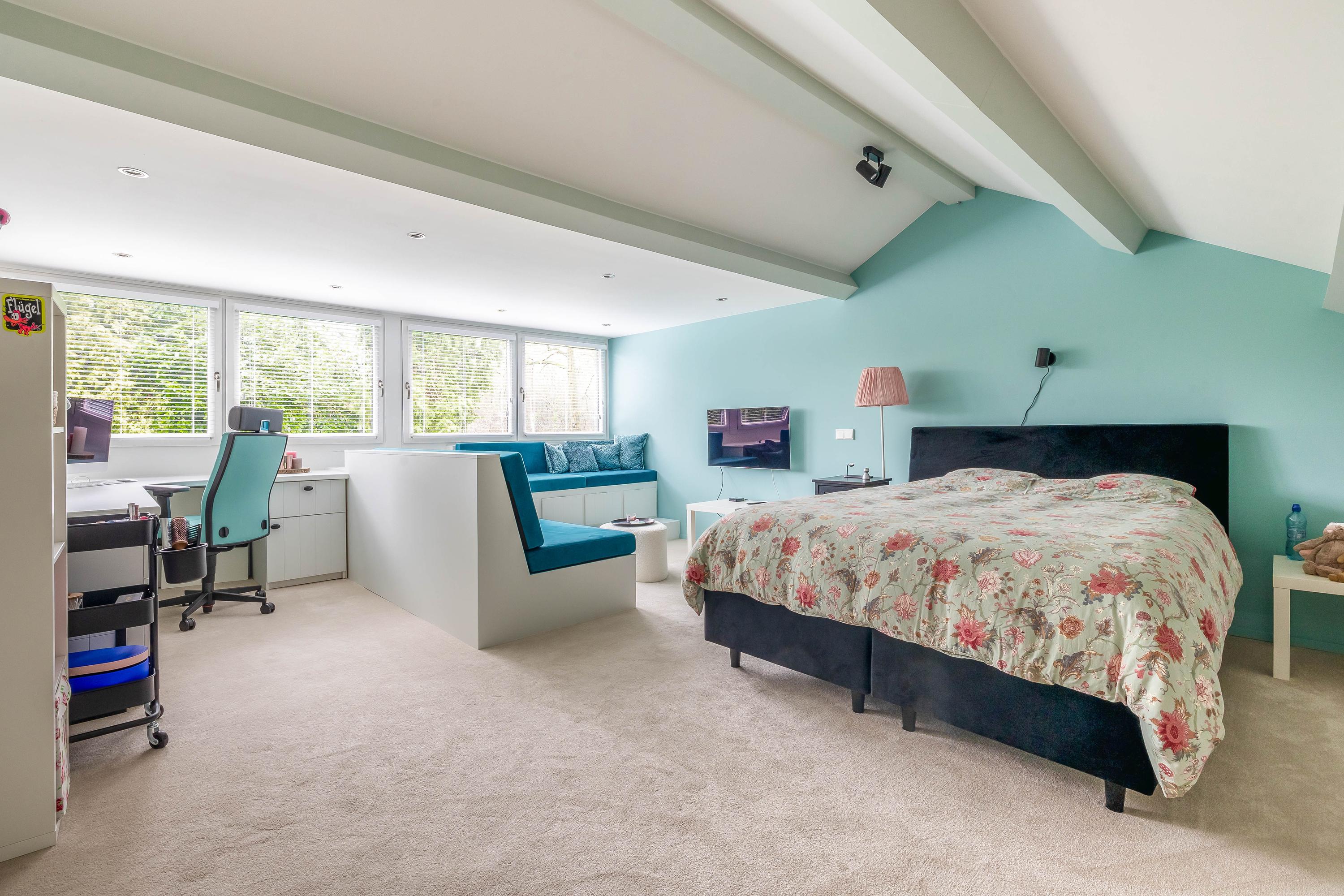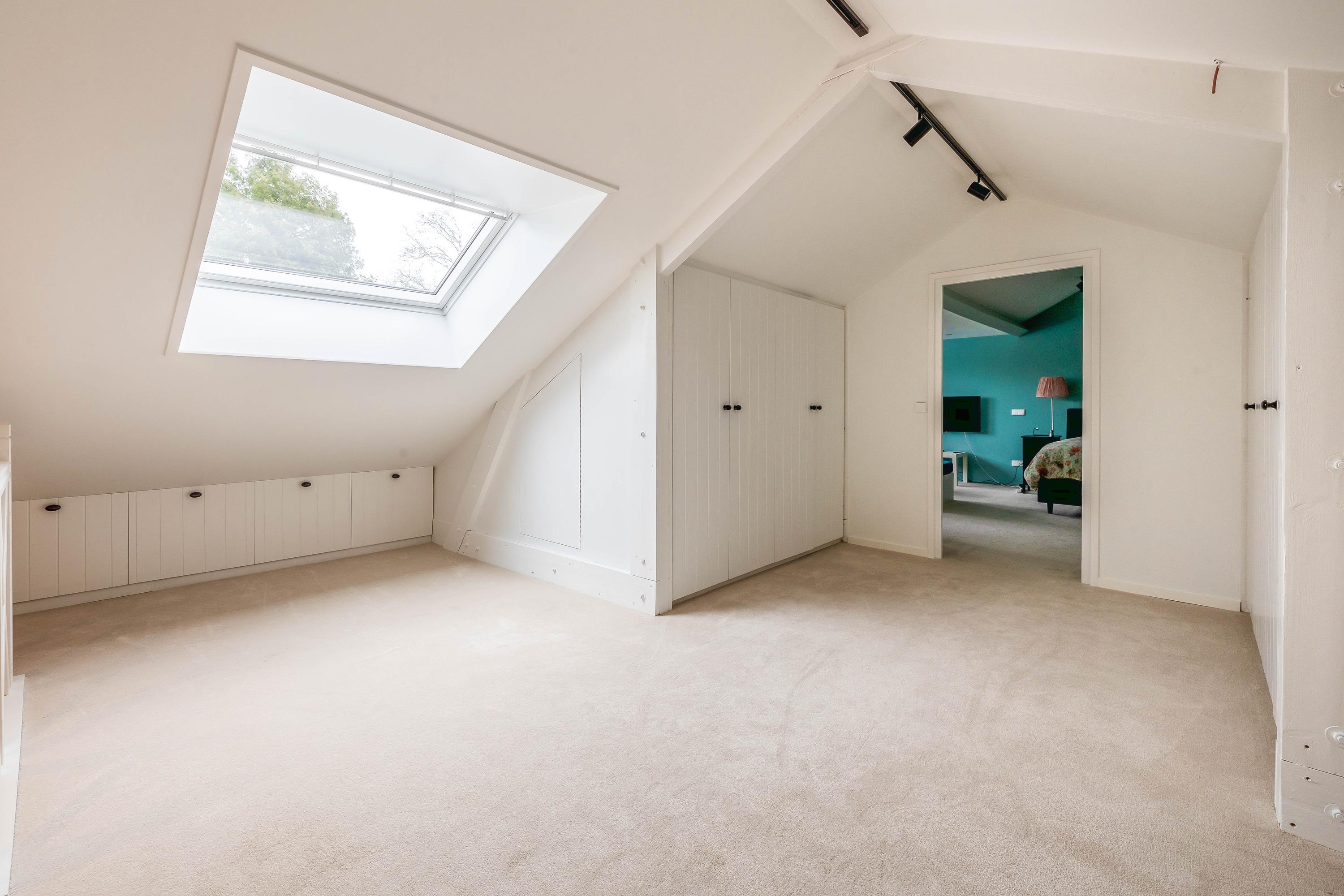 De zeer ruime slaapkamer (ca. 28m²) is voorzien van een grote dakkapel met ingebouwde elektrische rolluiken, jaloezieën en horren. De slaapkamer is voorzien van veel vaste elementen zoals banken en een bureau. Zowel op de overloop als slaapkamer ligt vloerbedekking.