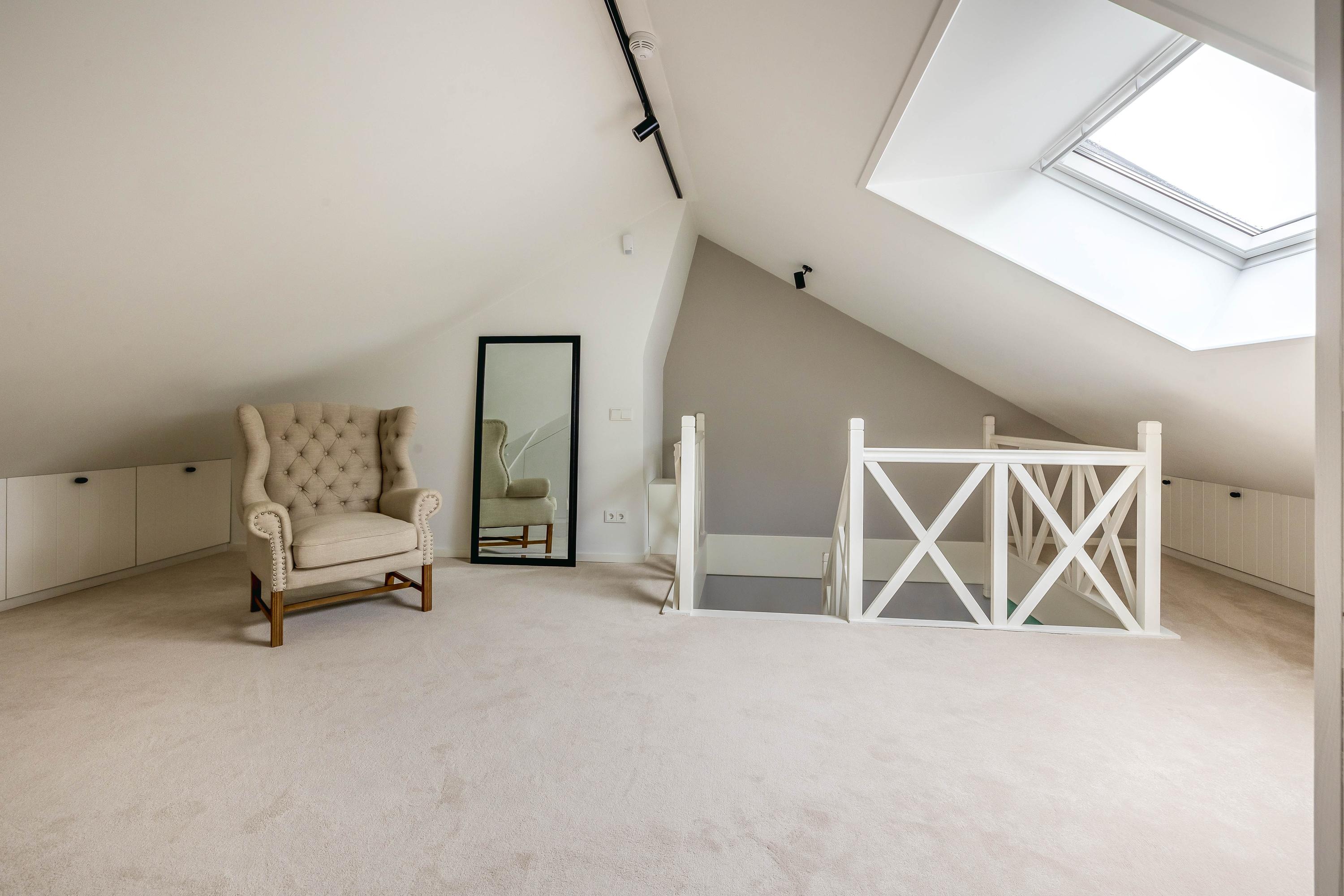 De nieuwe, vaste trap biedt toegang tot de 1ste verdieping. Deze unieke en zeer ruime 1ste verdieping heeft een royale overloop met een Velux dakraam met screen, diverse bergruimte en een aansluiting voor water waardoor er de mogelijkheid is om een badkamer te creëren evenals een tweede slaapkamer.