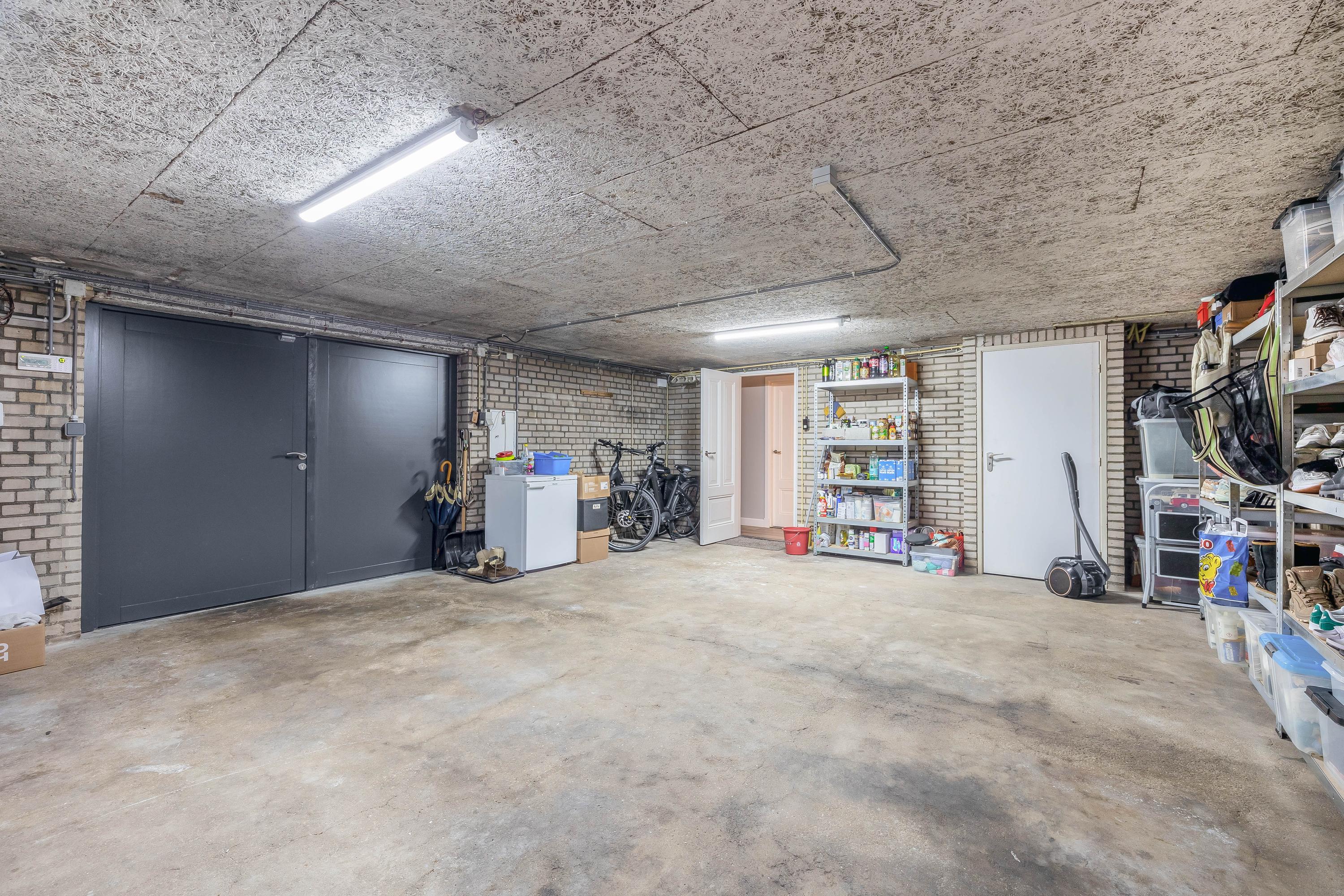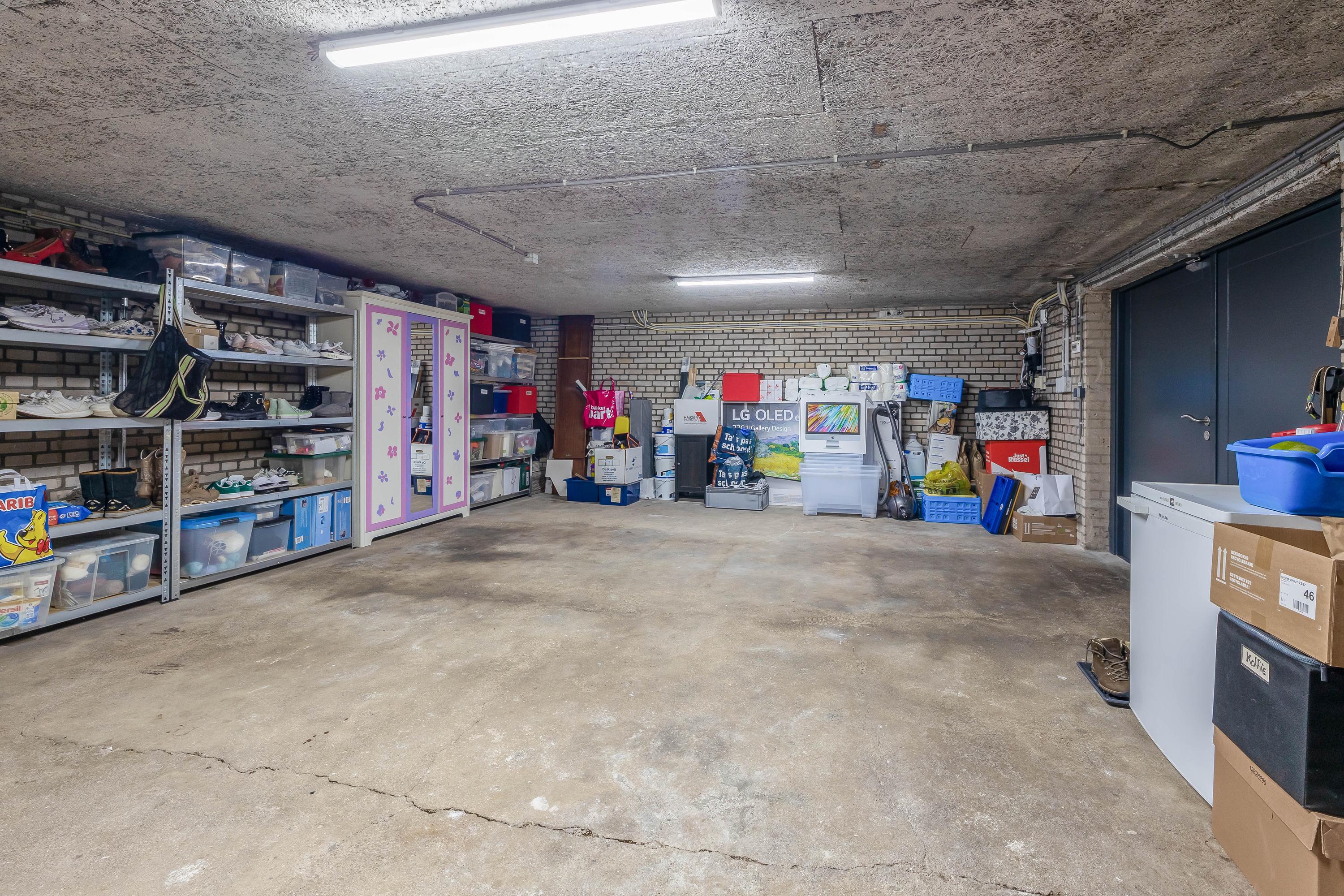 Het grote souterrain is voorzien van een grote garage (ca. 40m²), een ruime berging (ca. 9m²) met vernieuwde meterkast en een technische ruimte met de cv-ketel. Een loopdeur en openslaande deuren bieden toegang tot buiten.