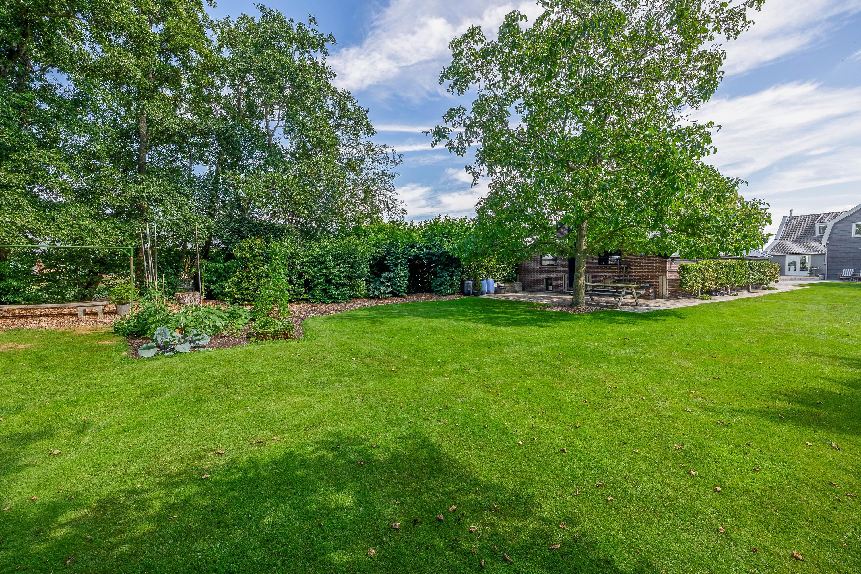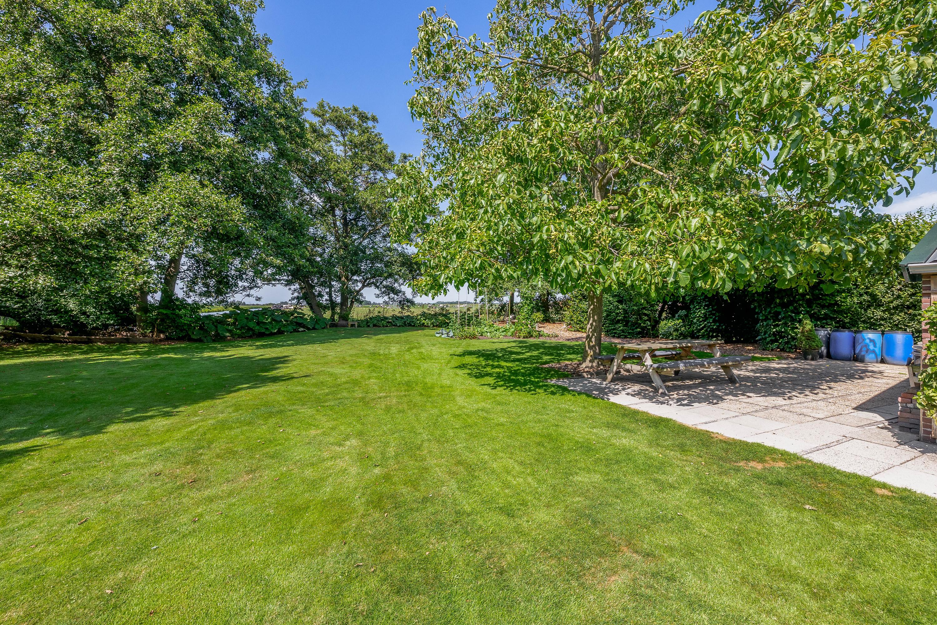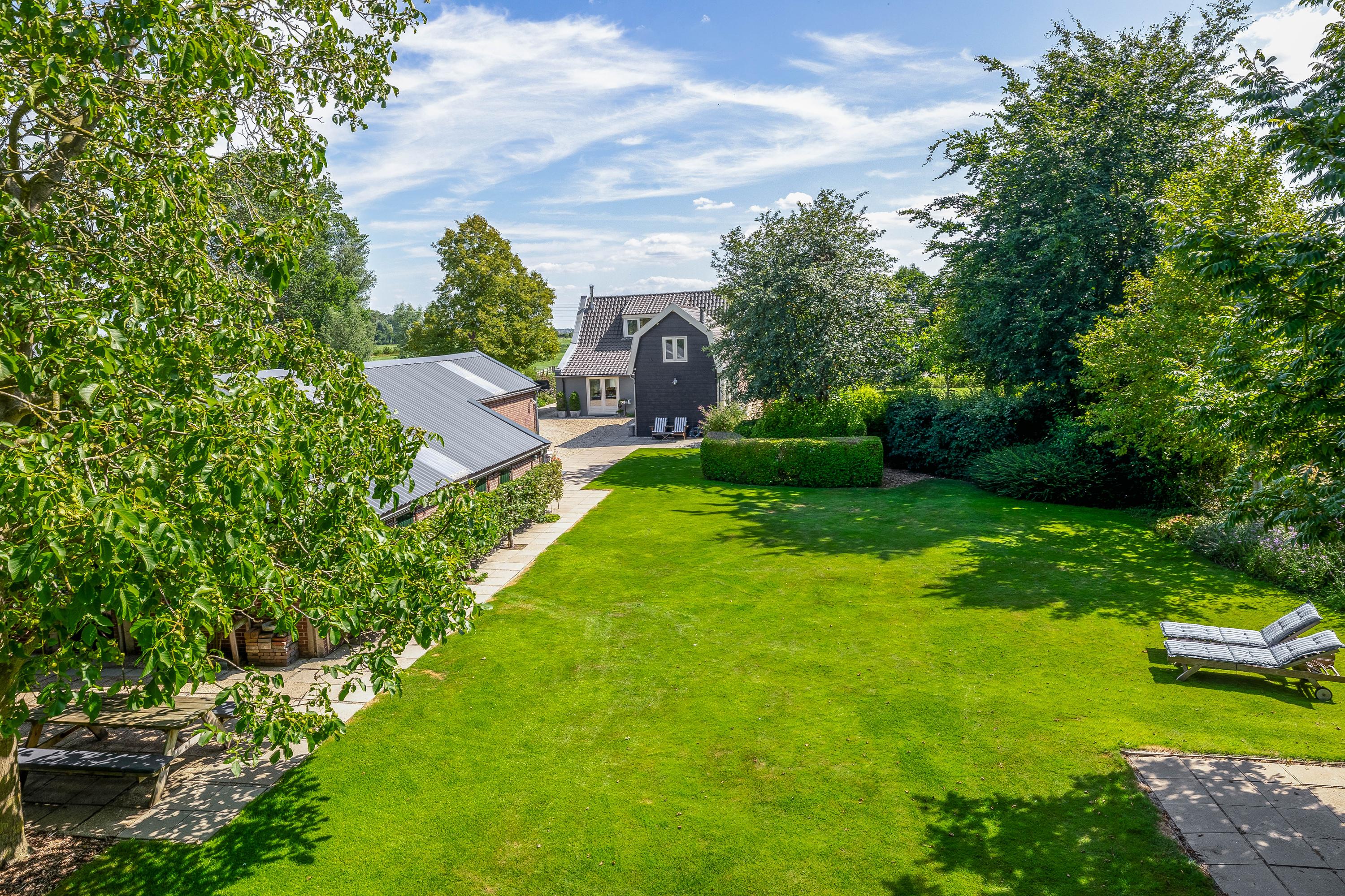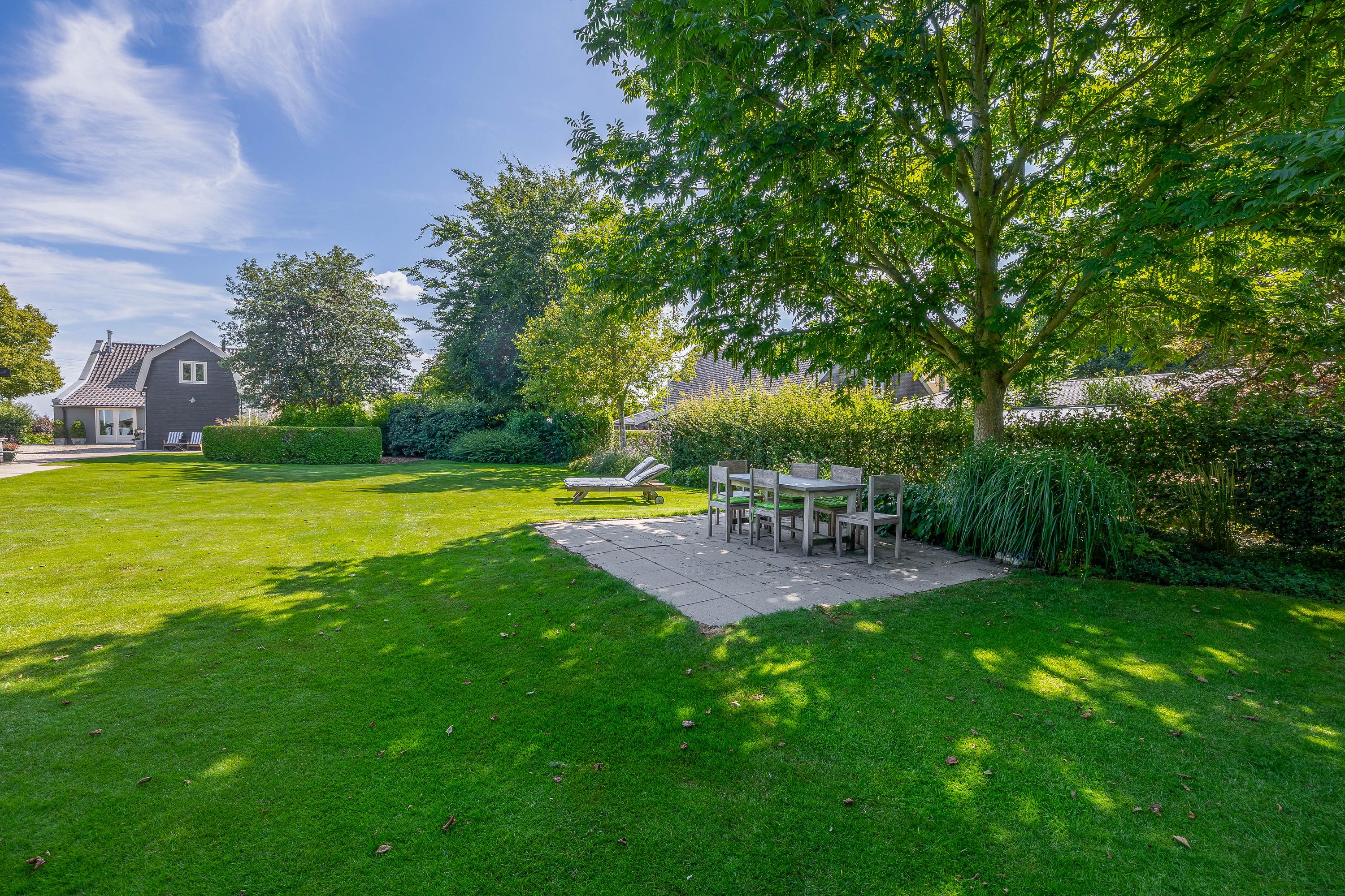 Buiten is het een oase van rust. De tuin rondom is strak, groen en verzorgd aangelegd, met verschillende zitplekken, grote gazons, bomen, borders, moestuin en sfeervolle hoekjes. Dankzij de ligging van het perceel heb je geen directe buren, veel privacy en prachtige uitzichten over water en weiland. Het weiland aan de oostzijde mag niet meer bebouwd worden, waardoor je ook in de toekomst verzekerd bent van vrij uitzicht.