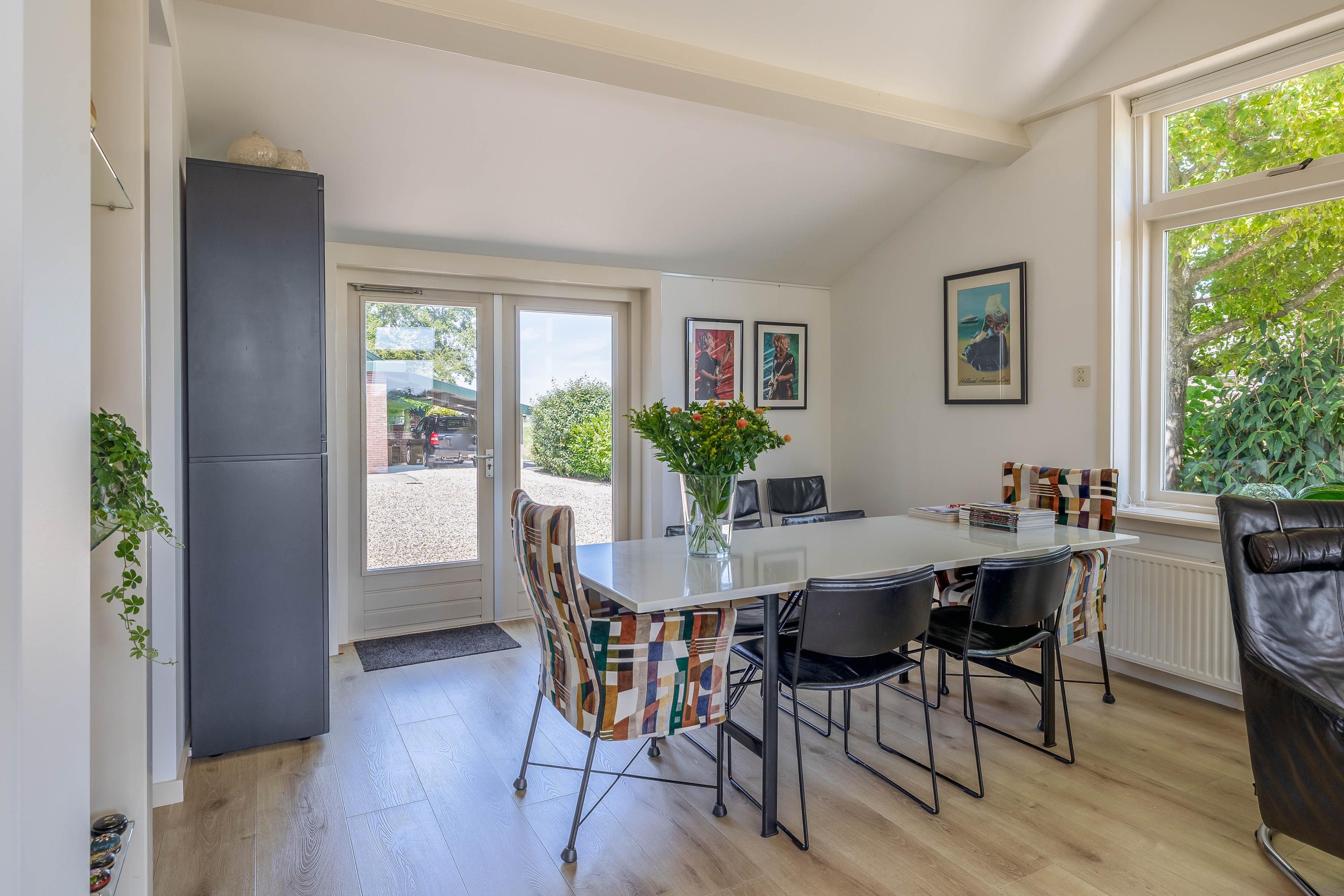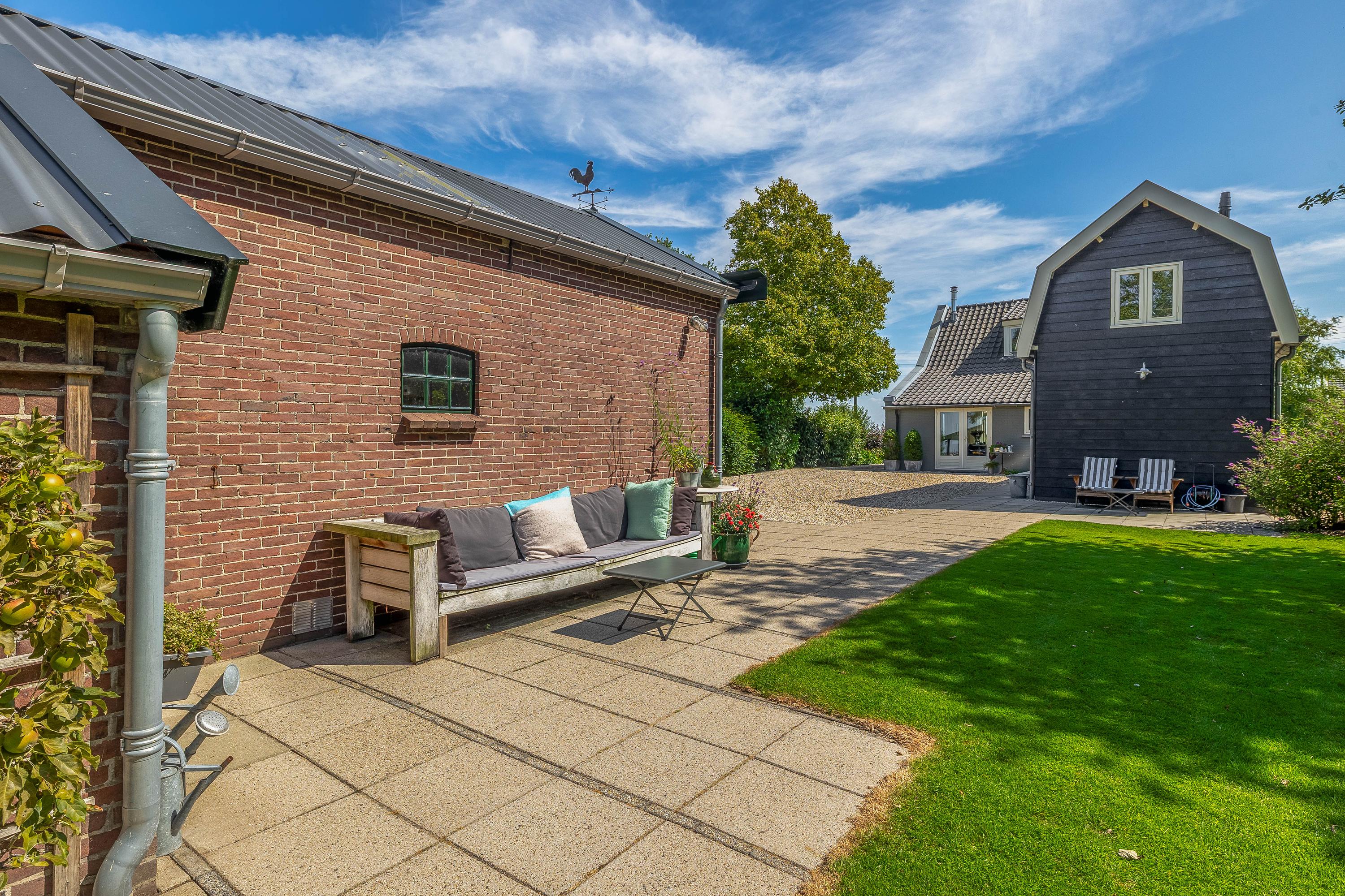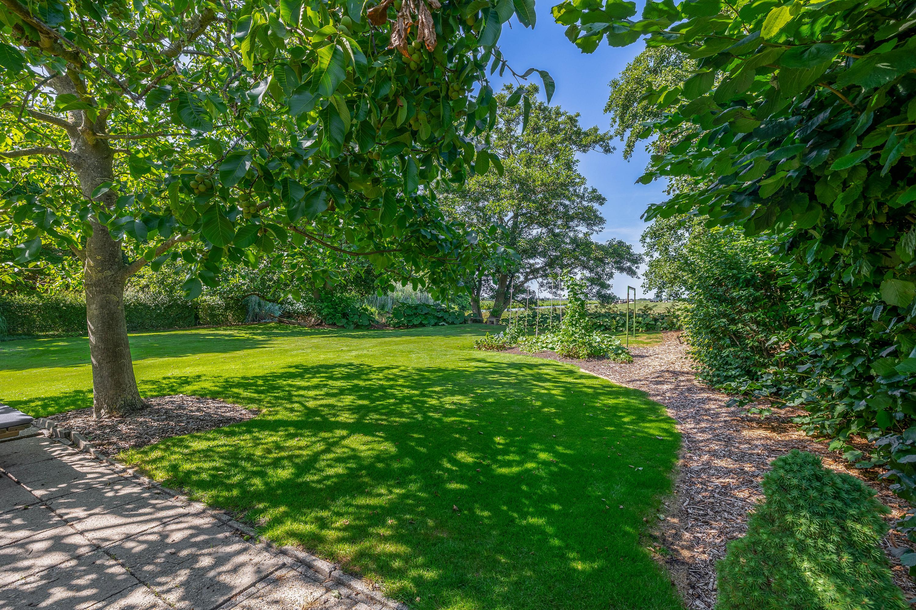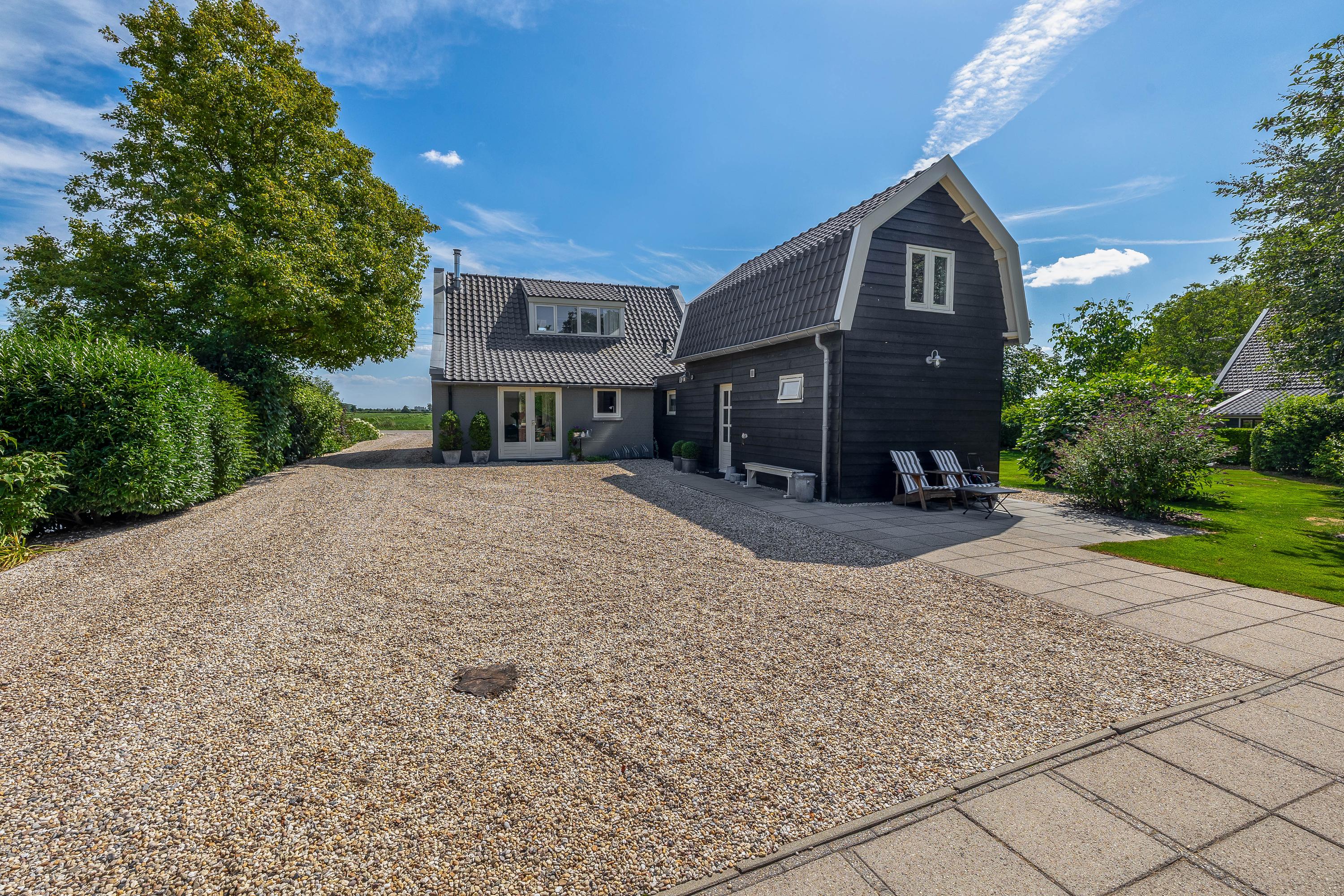 Buiten is het een oase van rust. De tuin rondom is strak, groen en verzorgd aangelegd, met verschillende zitplekken, grote gazons, bomen, borders, moestuin en sfeervolle hoekjes. Dankzij de ligging van het perceel heb je geen directe buren, veel privacy en prachtige uitzichten over water en weiland. Het weiland aan de oostzijde mag niet meer bebouwd worden, waardoor je ook in de toekomst verzekerd bent van vrij uitzicht.
