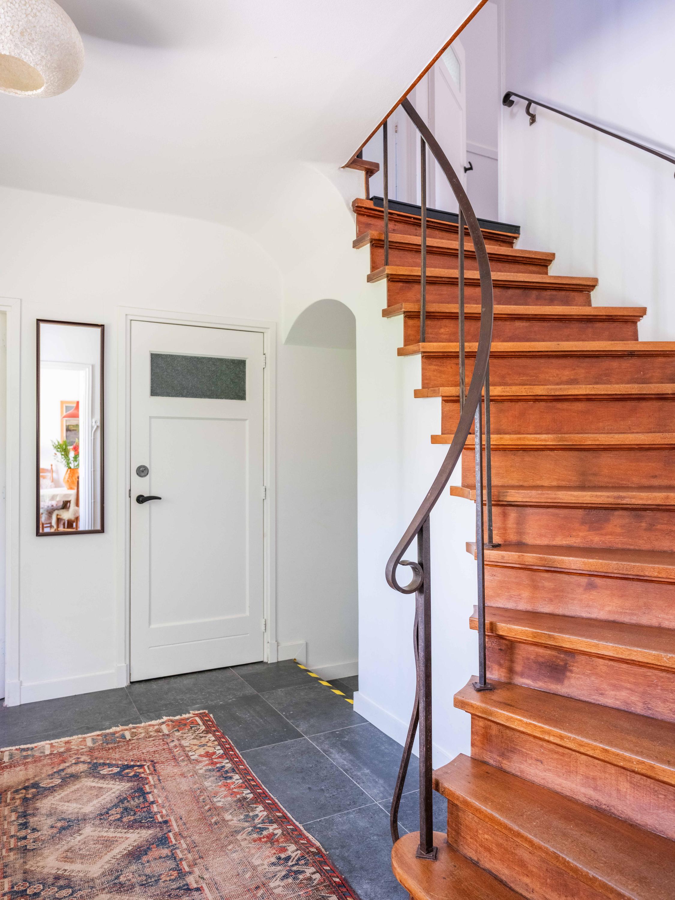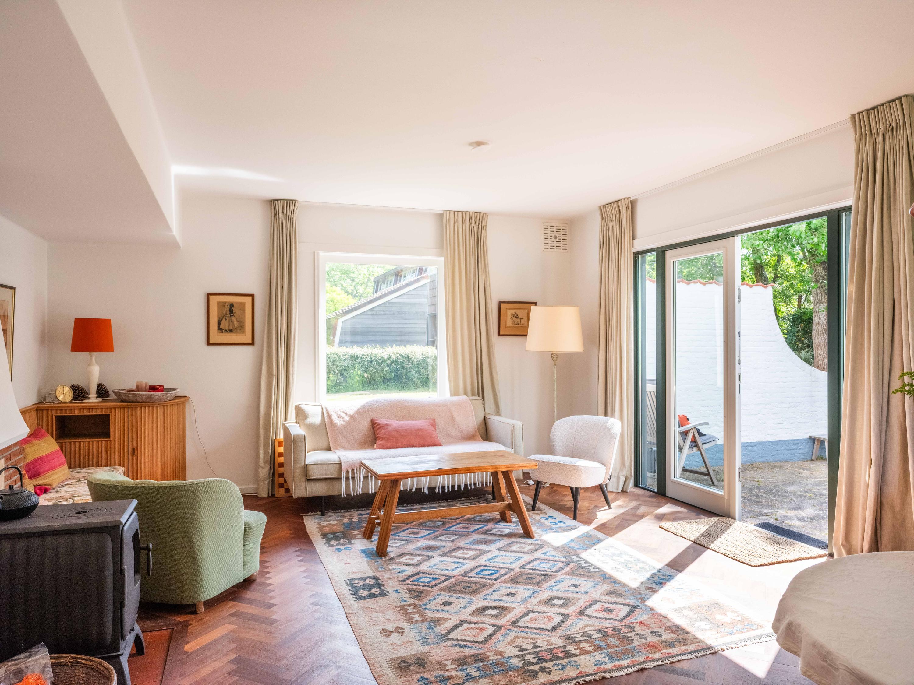 We nemen u mee naar binnen. Bij binnenkomst valt direct de fraaie entreehal op met een stijlvolle trapopgang met smeedijzeren leuning, een moderne toiletruimte en een handige kelderkast. De woonkamer is licht en sfeervol met een originele houten parketvloer, een houtkachel en openslaande tuindeuren naar de groene tuin. Ingebouwde houten maatwerkkasten zorgen voor extra charme én bergruimte.